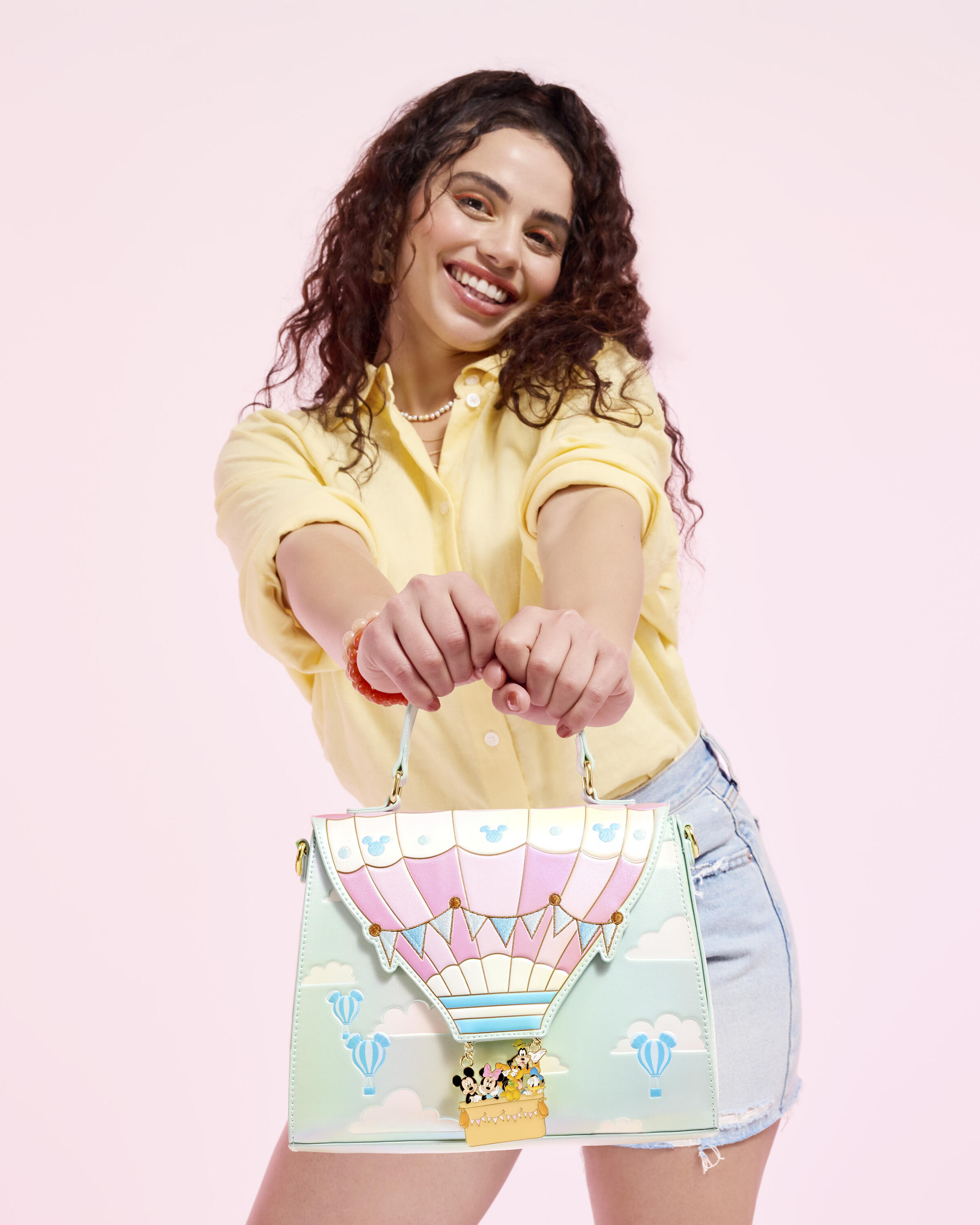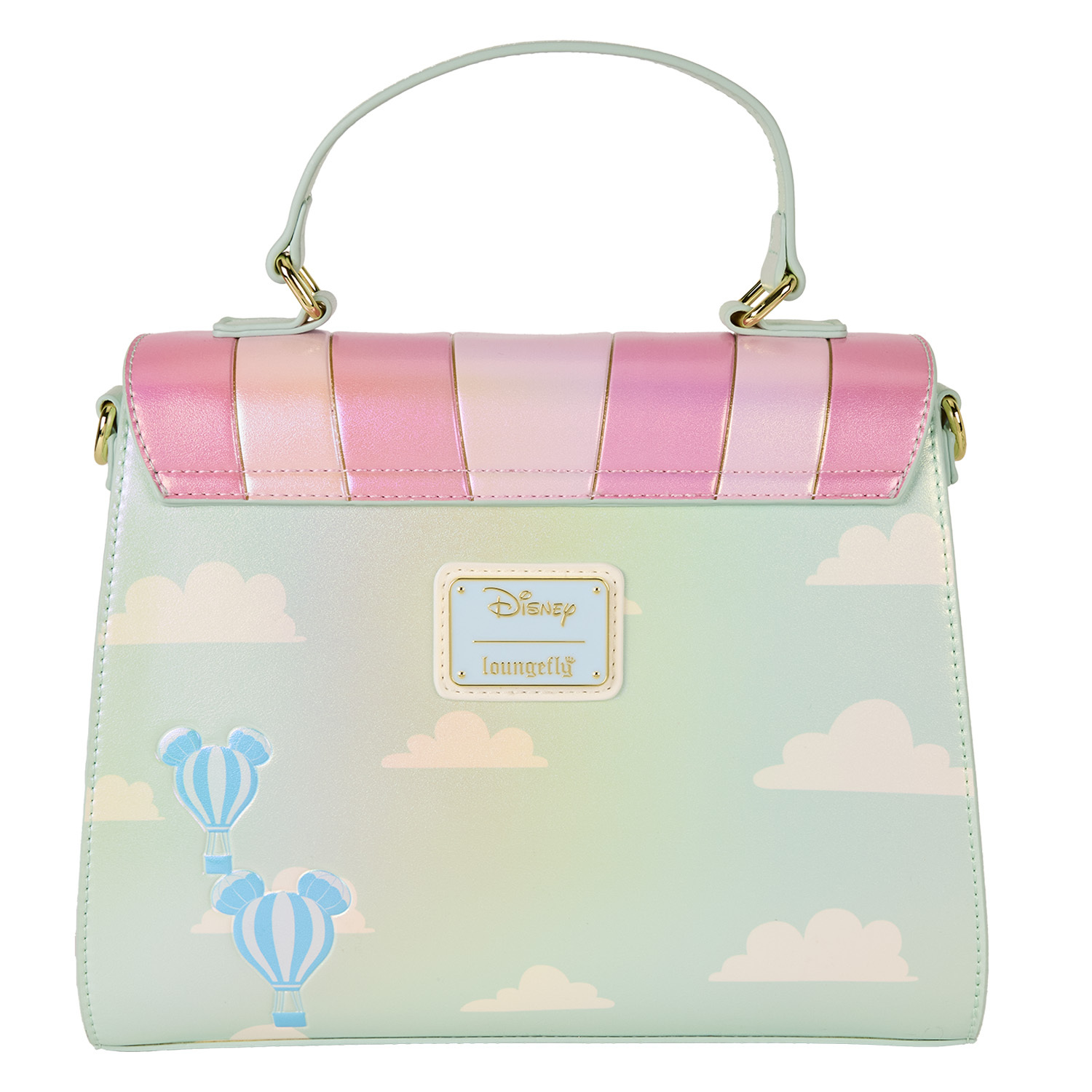 Ein applizierter Heißluftballon ziert diese Tasche vor einem bewölkten Himmel, auf dem weitere Heißluftballons schweben. Schauen Sie genau hin, Sie werden einige versteckte Mickeys entdecken! Einige Ihrer liebsten Disney-Figuren sitzen zusammen im Korb und genießen die Aussicht!