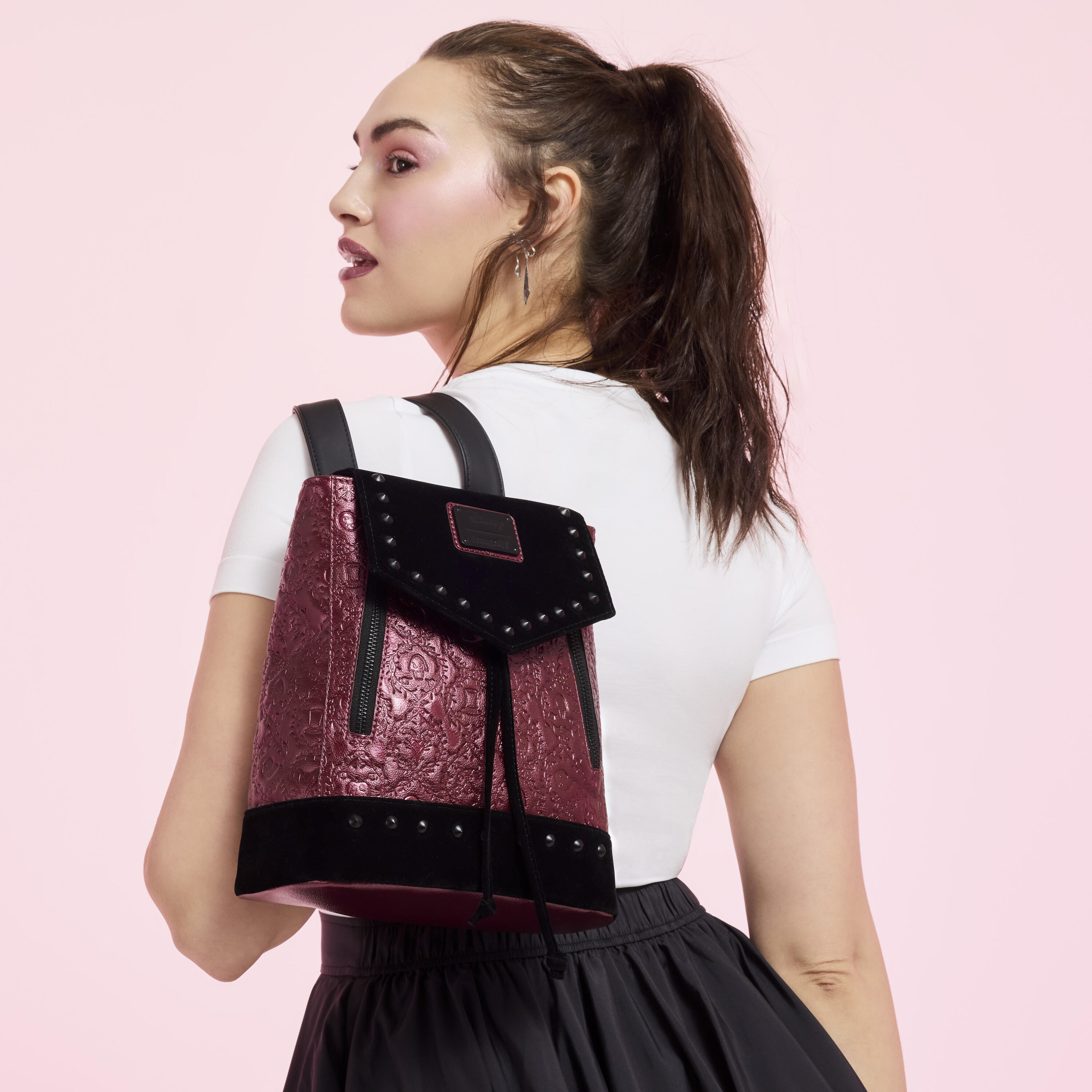 Dieser Mini-Rucksack ist das perfekte Accessoire, um Ihrem Look das gewisse Etwas zu verleihen! Metallisches Kunstleder, Samt und Nieten machen ihn zum Hingucker. Überall finden Sie eingeprägte Symbole einiger Ihrer Lieblings-Disney-Schurken, umgeben von stacheligen Ranken!