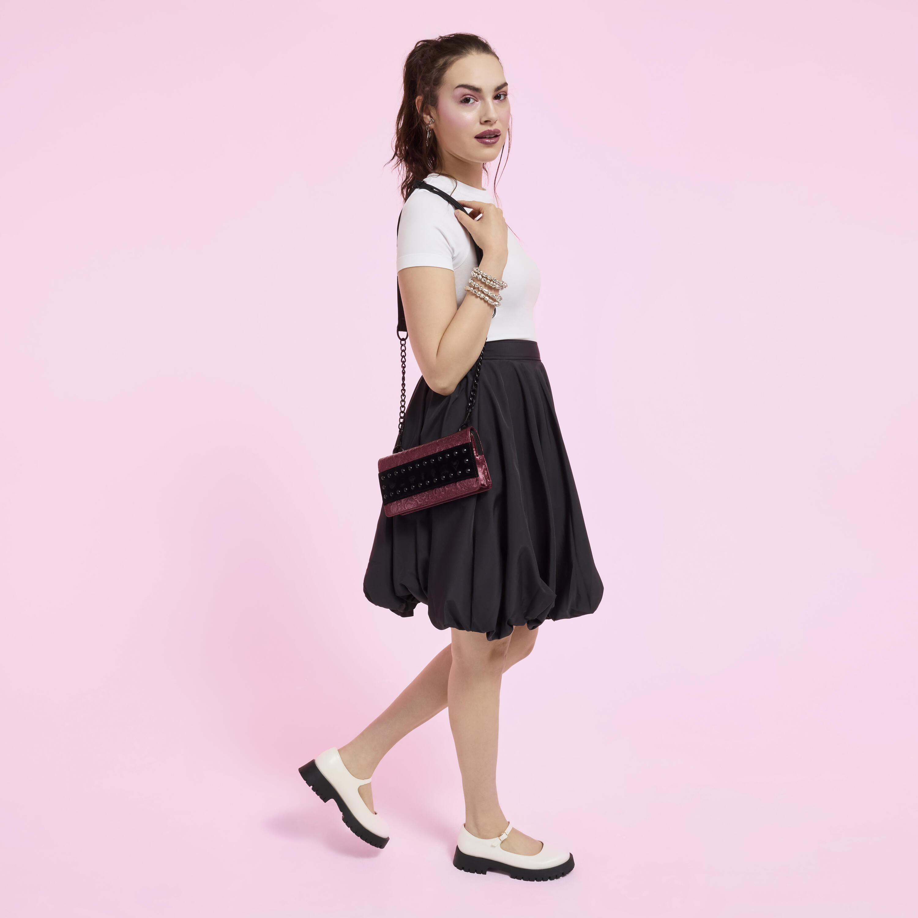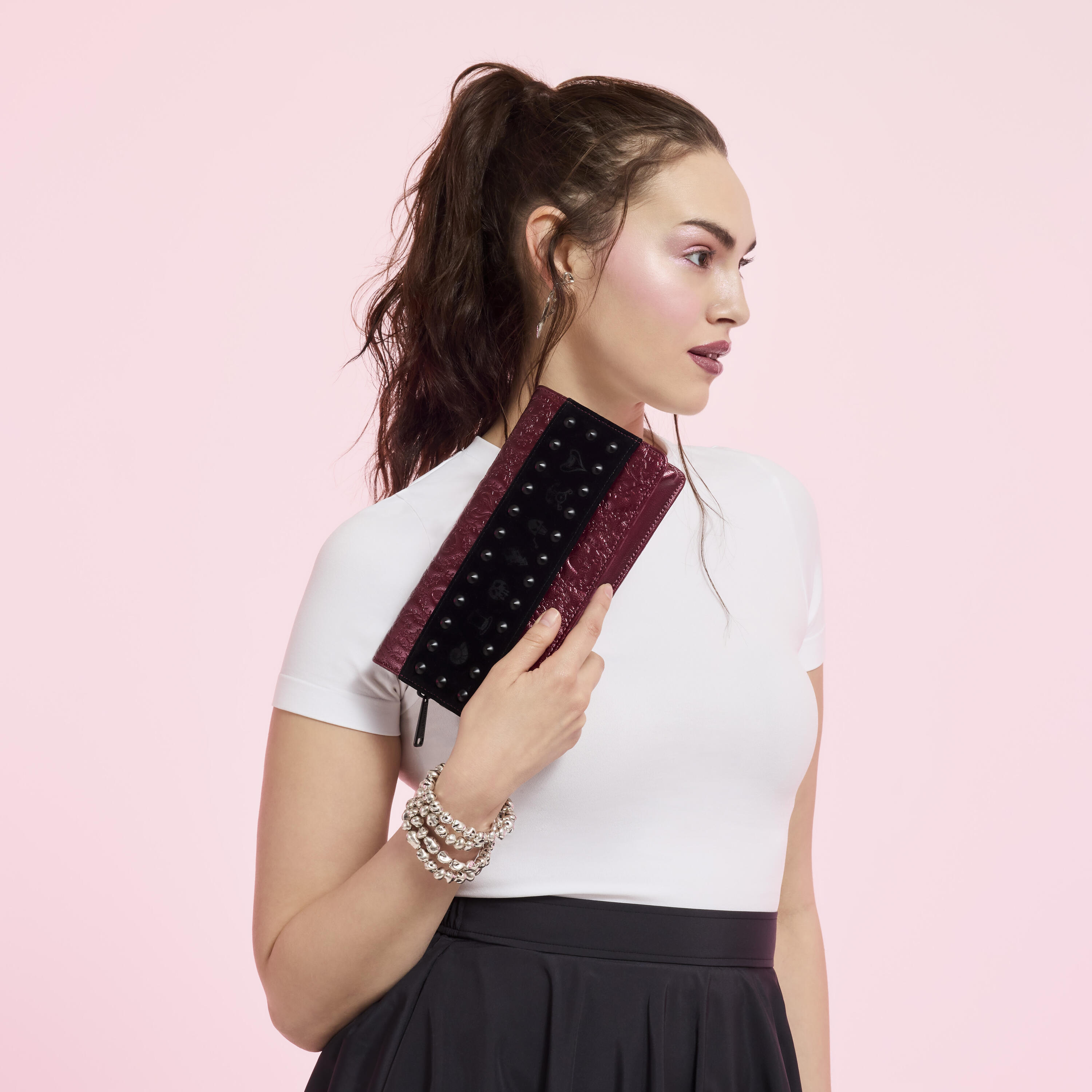 Überall auf der Tasche finden Sie eingeprägte Symbole beliebter Disney-Bösewichte in spitzen Dornen. Nieten und Samt runden den Look ab. Dieses Modell ist vielseitig: Tragen Sie sie mit dem Armband als Clutch oder befestigen Sie den Crossbody-Gurt, um sie wie eine Handtasche zu tragen!