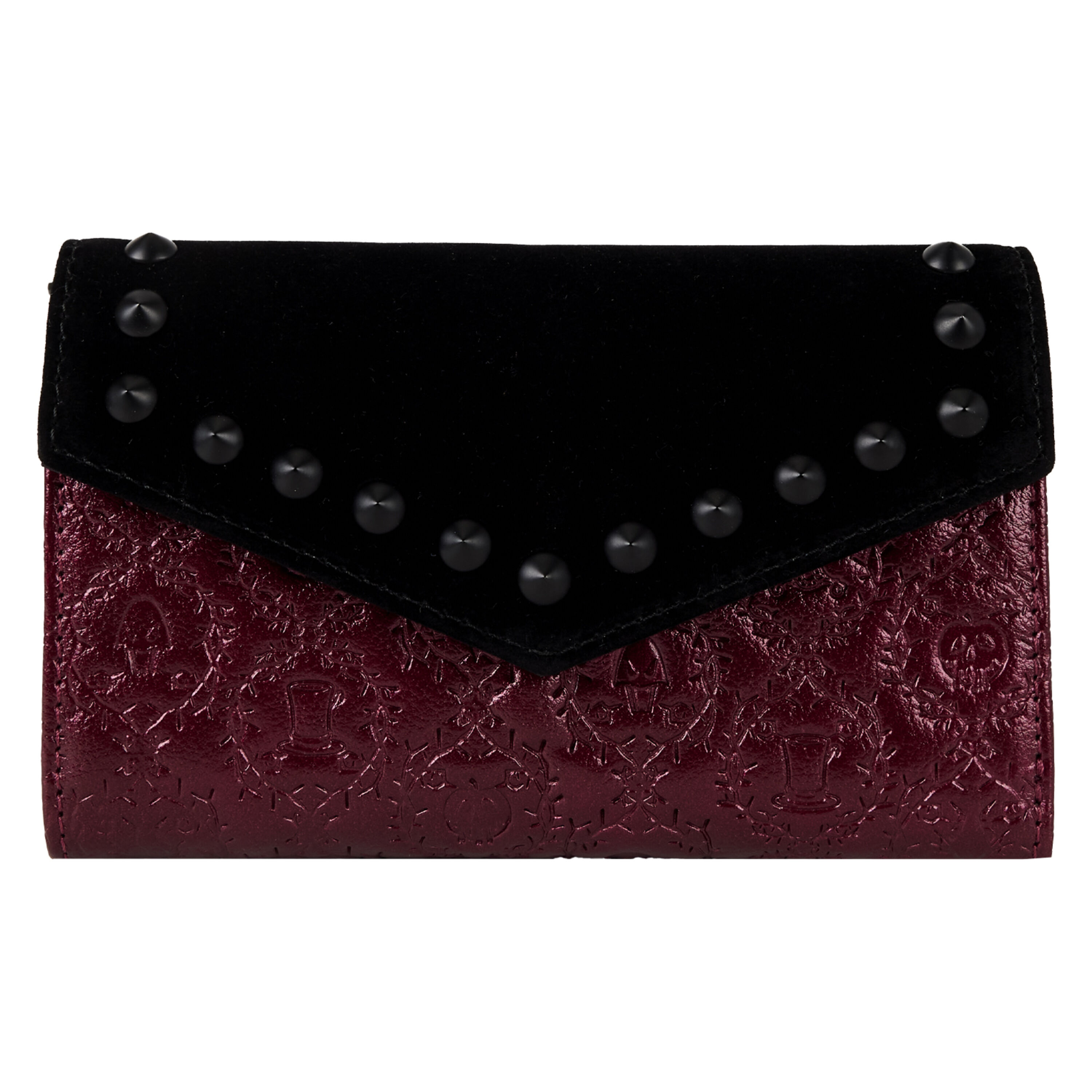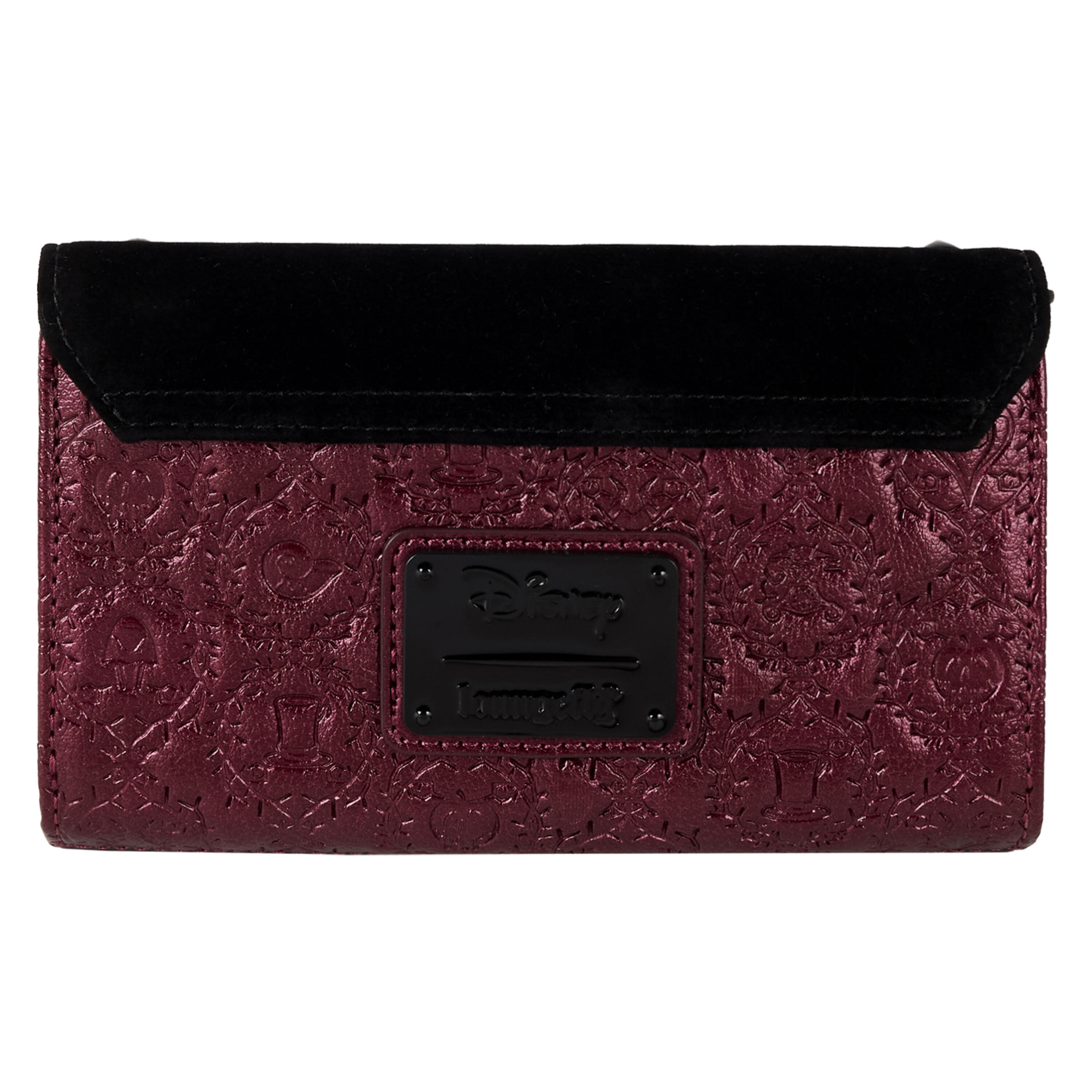 Dieses Portemonnaie besteht aus metallischem Kunstleder mit Samtbesatz. Überall finden Sie Symbole Ihrer Lieblings-Disney-Bösewichte, die in stachelige Ranken eingeprägt sind. Im Inneren befinden sich sieben Kartenfächer und ein transparentes Fach für einen Ausweis.
