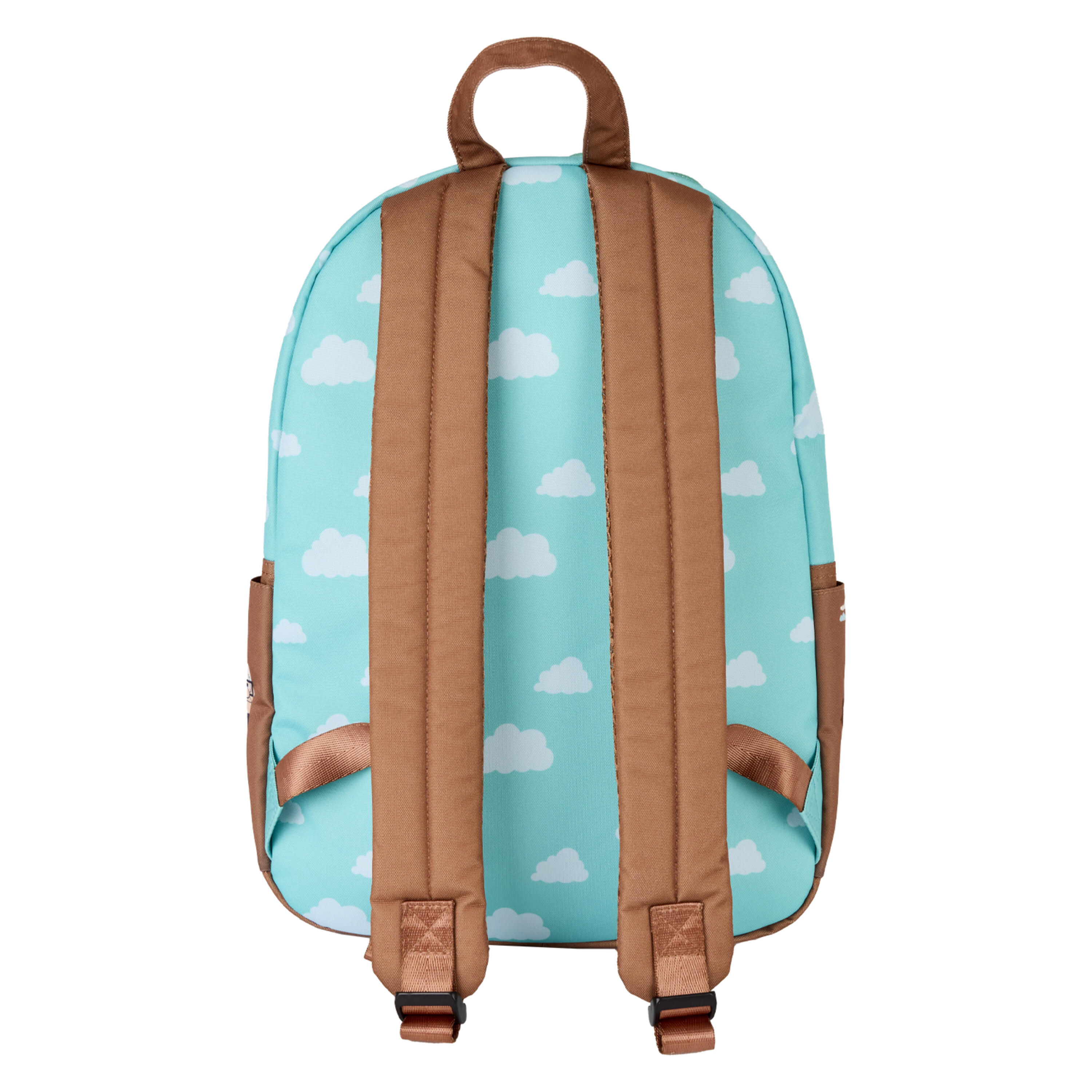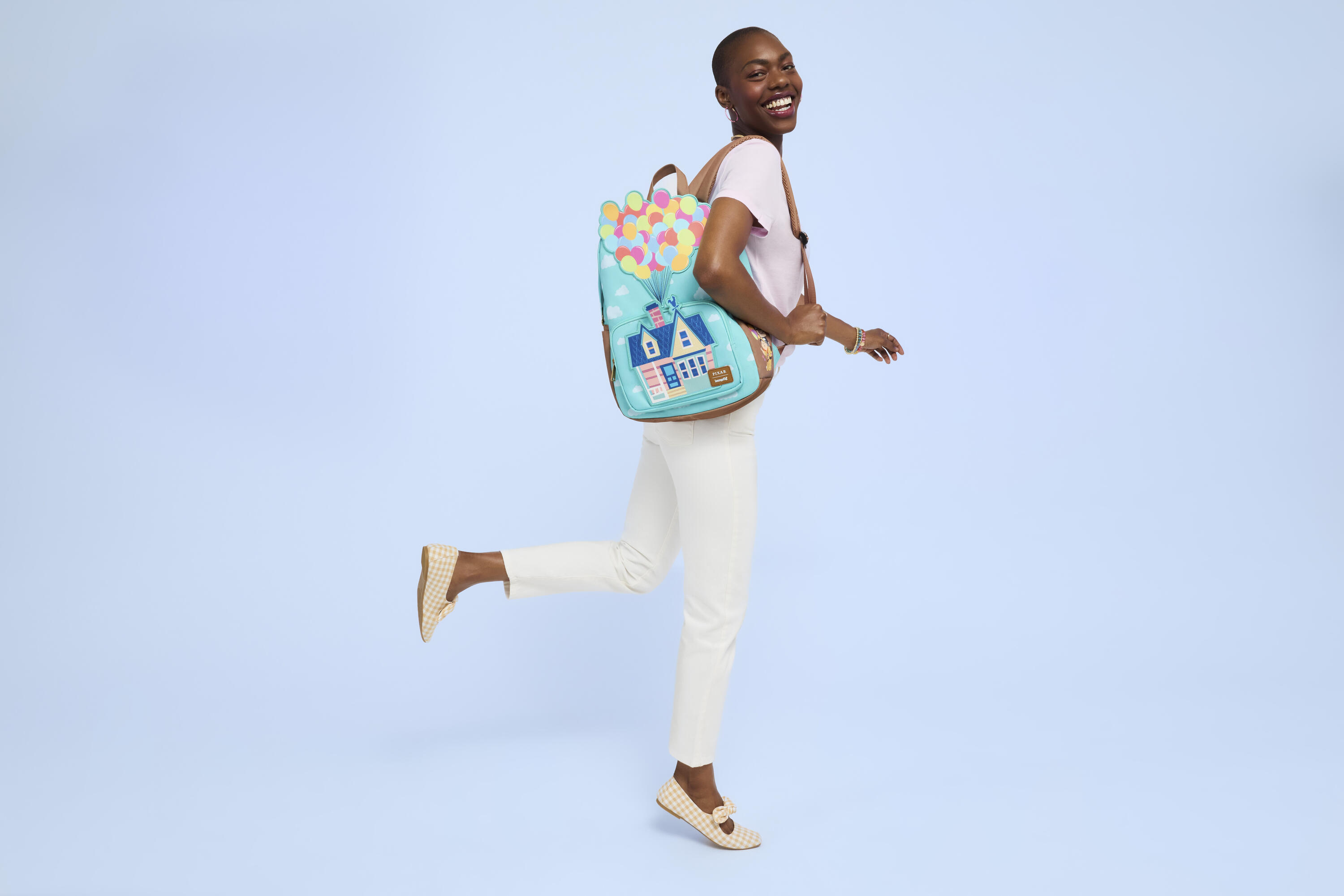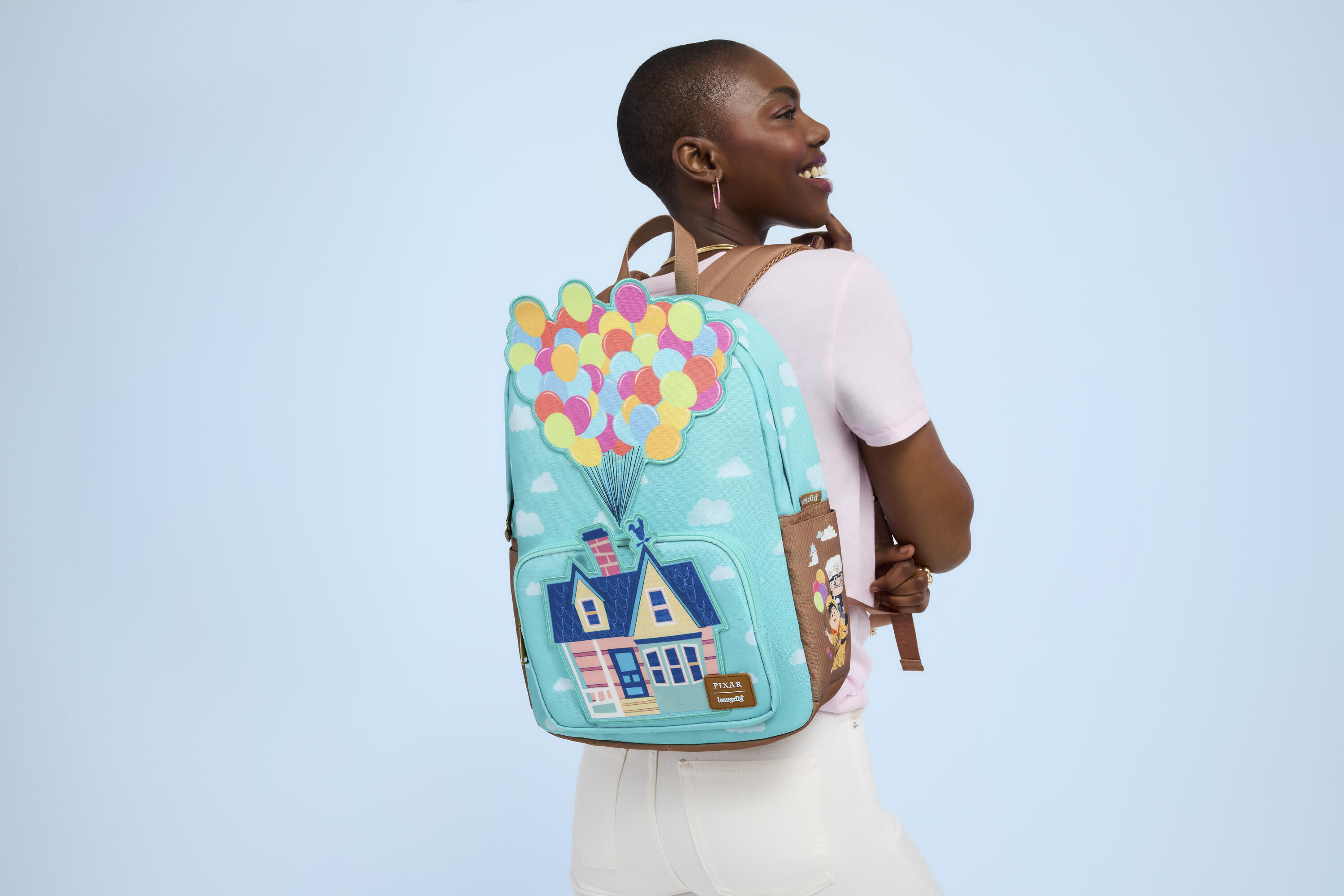 Diese große Tasche ist von Disney-Pixars „Oben“ inspiriert. Die Vorderseite der Tasche zeigt einen Allover-Print mit Wolken in einem klaren Himmel. Die Vordertasche zeigt Carls Haus, darüber eine Ballon-Applikation. Schauen Sie sich die Seitentaschen an, um Bilder einiger Ihrer Lieblingsfiguren zu finden!