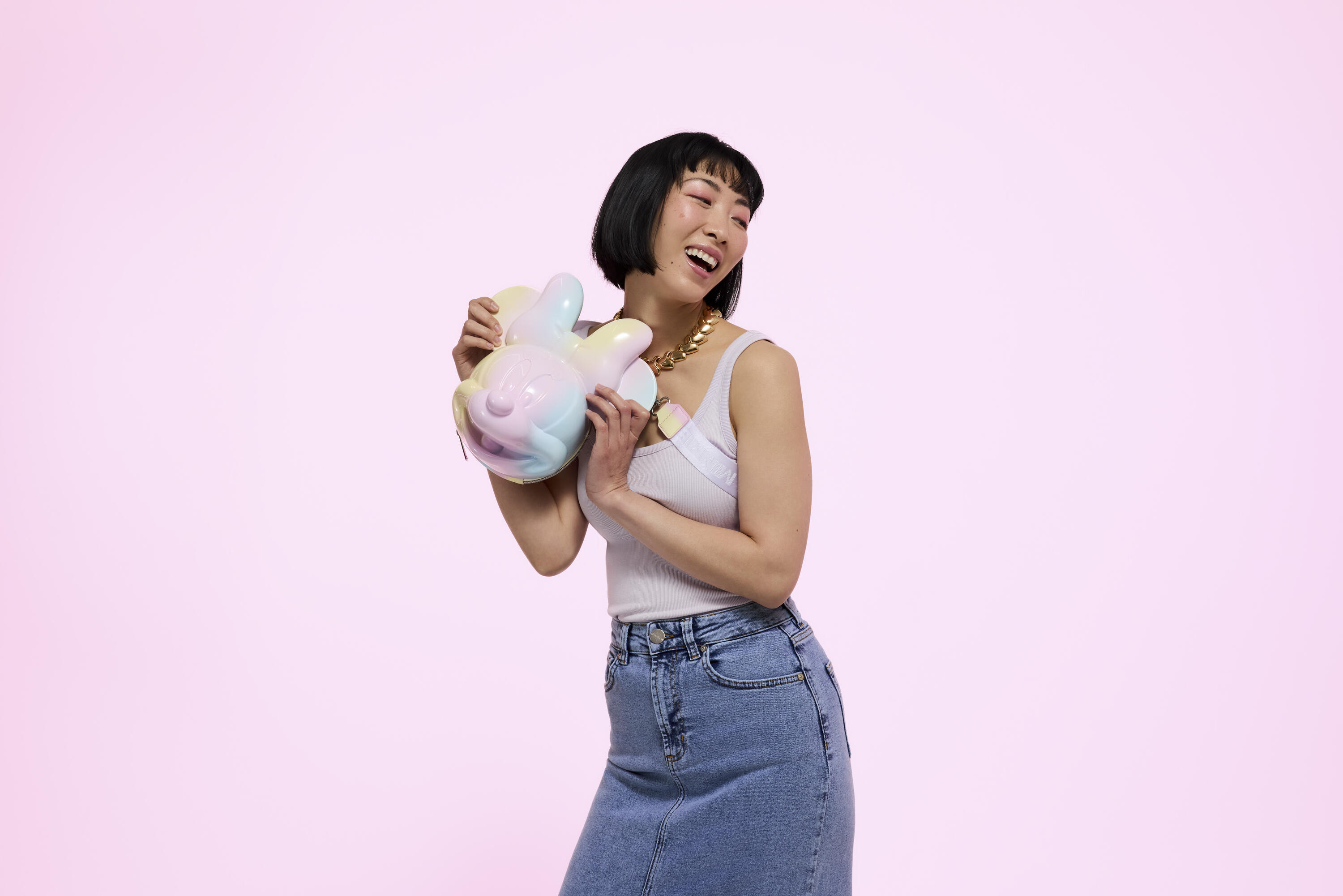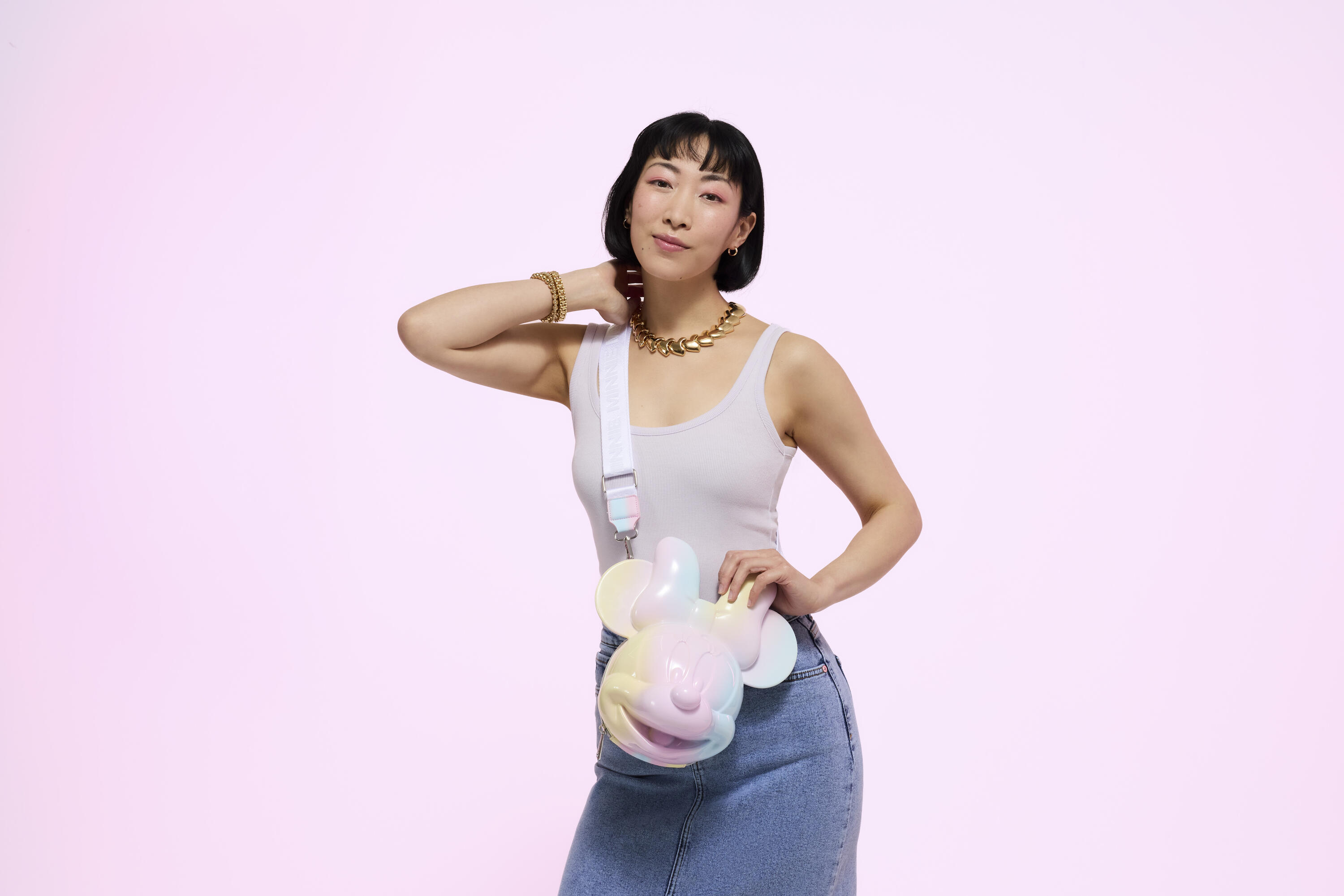 Diese umhängetasche zeigt einen 3D-geformten Minnie Maus Kopf! Sie grinst von der Vorderseite der Tasche. Minnie ist mit pastellfarbenen Batikmustern in Pink, Blau und Gelb verziert. Auf dem verstellbaren Umhängegurt steht überall „Minnie“.