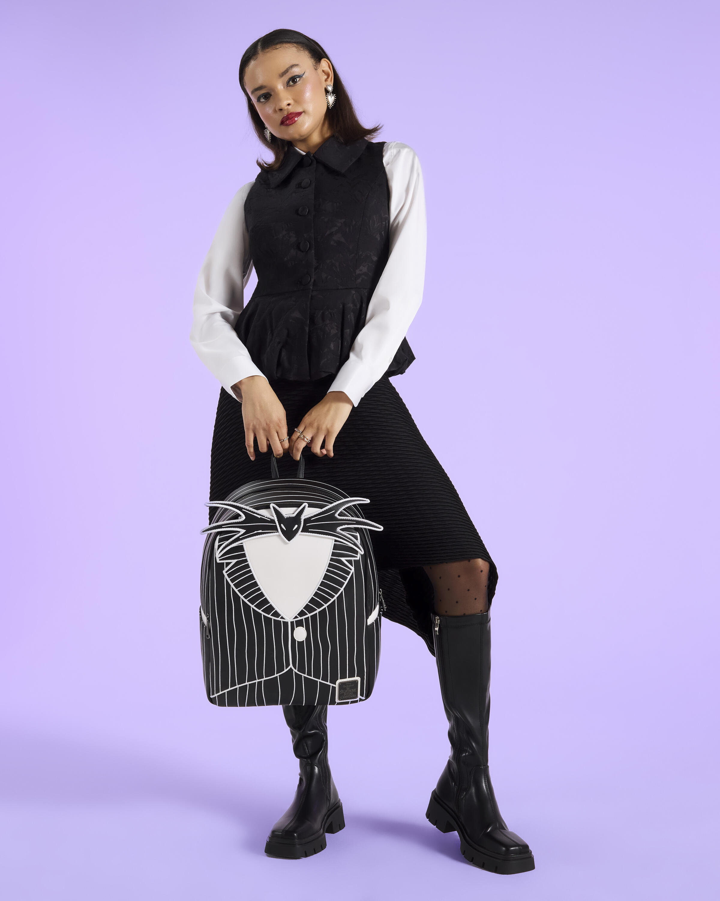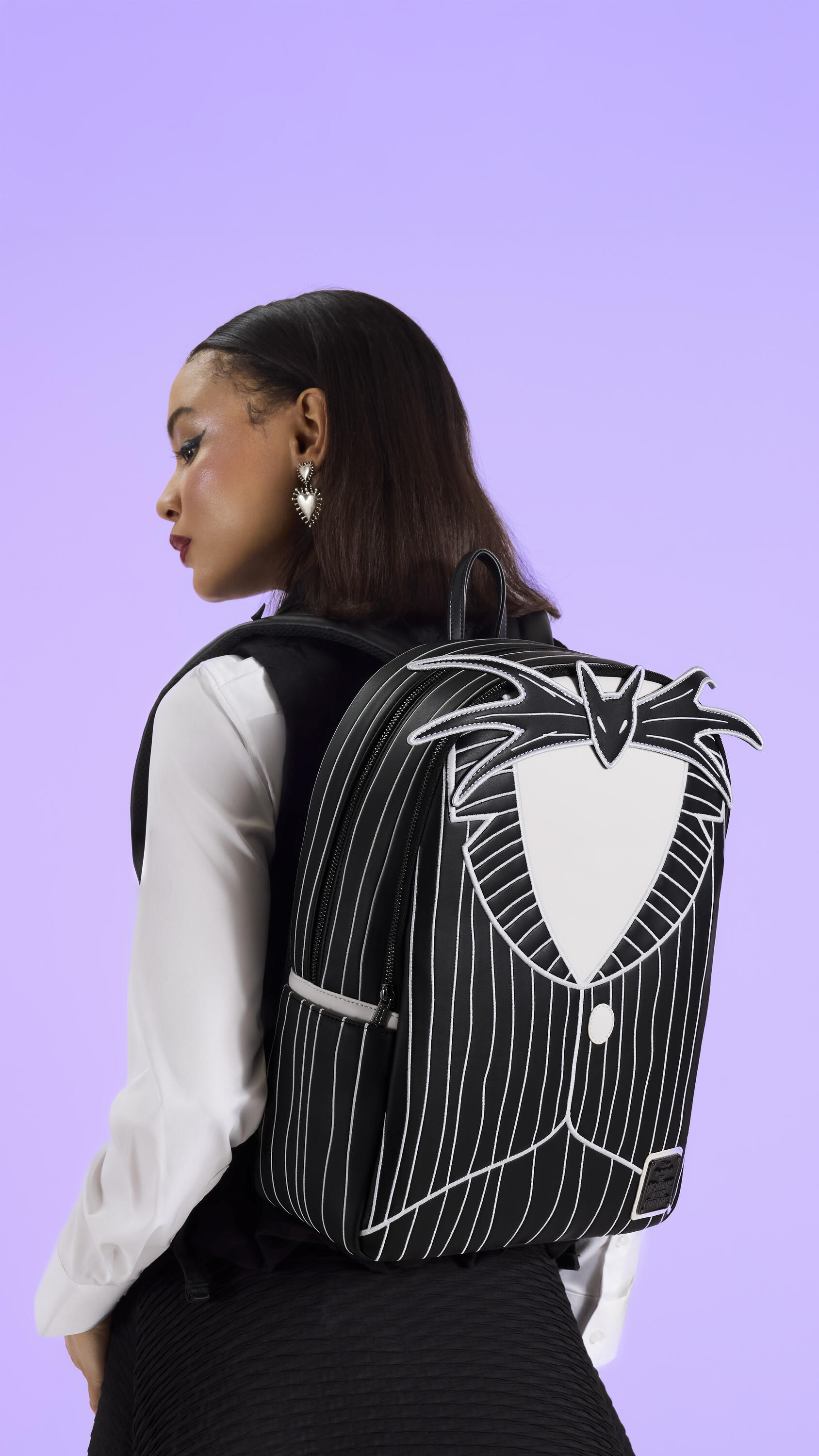 Dieser Rucksack aus Kunstleder ist von Jack Skellingtons Anzug inspiriert, komplett mit weißen Nadelstreifen und seiner klassischen Fledermausfliege. Drehen Sie die Tasche um und entdecken Sie Fledermäuse an den Riemen und ein Bild von Jacks Gesicht, das auf die Rückseite gestickt ist. Oh, und für noch mehr Gruselspaß leuchtet diese Tasche im Dunkeln!