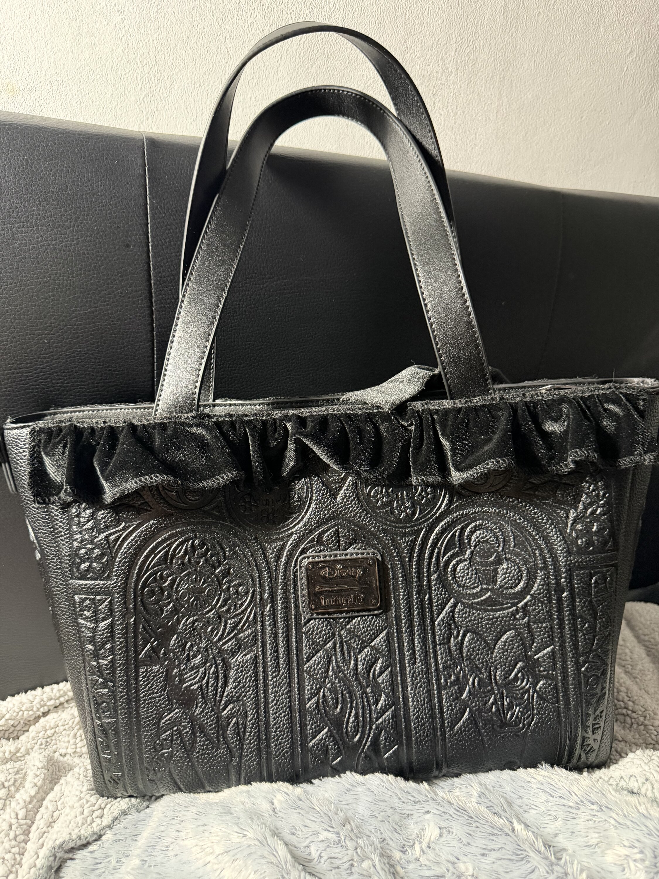 Diese tragetasche ist das Disney-Bösewicht mode , nach dem Sie gesucht haben. Die Tasche hat eine Samtrüsche am oberen Rand. Darunter befinden sich Buntglasfenster mit 3D-Stickerei, die Ihre Lieblings-Disney-Bösewichte darstellen. Metallisches Kunstleder und eine Samtschleife runden den Look ab.