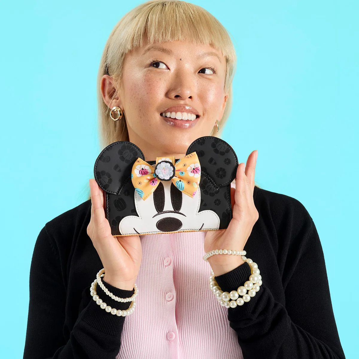 Ihr neues Lieblingsportemonnaie für die Gruselsaison! Dieses Portemonnaie zeigt Minnie Maus auf der Vorderseite mit 3D-Ohren, die oben herausragen. Die Rückseite des Portemonnaies und Minnies Schleife sind mit Kürbissen und Maisbonbons bedruckt. Im Inneren finden Sie sieben Kartenfächer und ein durchsichtiges Fach für Ihren Ausweis.