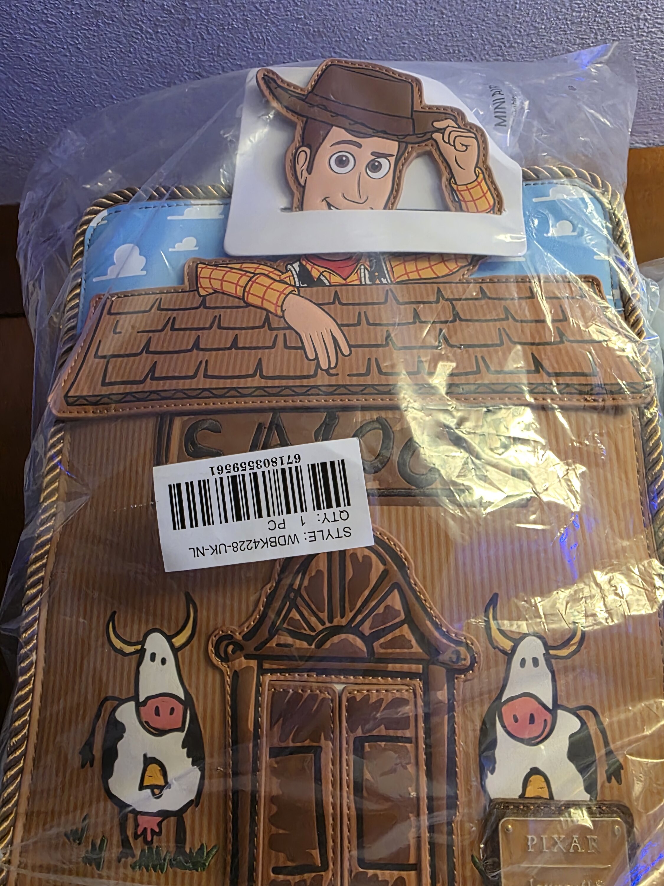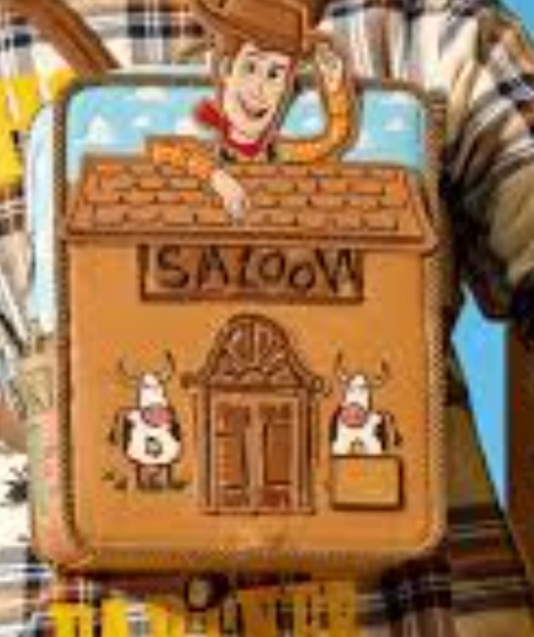 Dieser Mini-Rucksack sieht aus wie Woodys Saloon aus Pappkarton. Sie finden Andys Handschrift mit den Beschriftungen „Saloon“, „Bank“ und „Hotel“. Echte Seildetails und Cowboy-Kunstleder machen ihn besonders lustig. Außerdem lehnt sich Woody über das Dach des Saloons! Die Vordertüren des Saloons öffnen sich und geben den Blick auf ein Steckbrief frei.