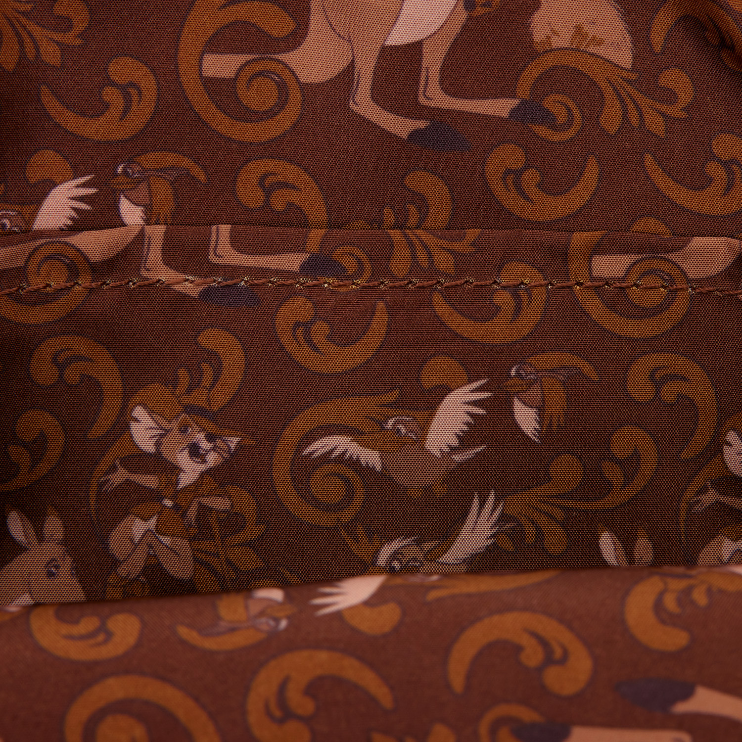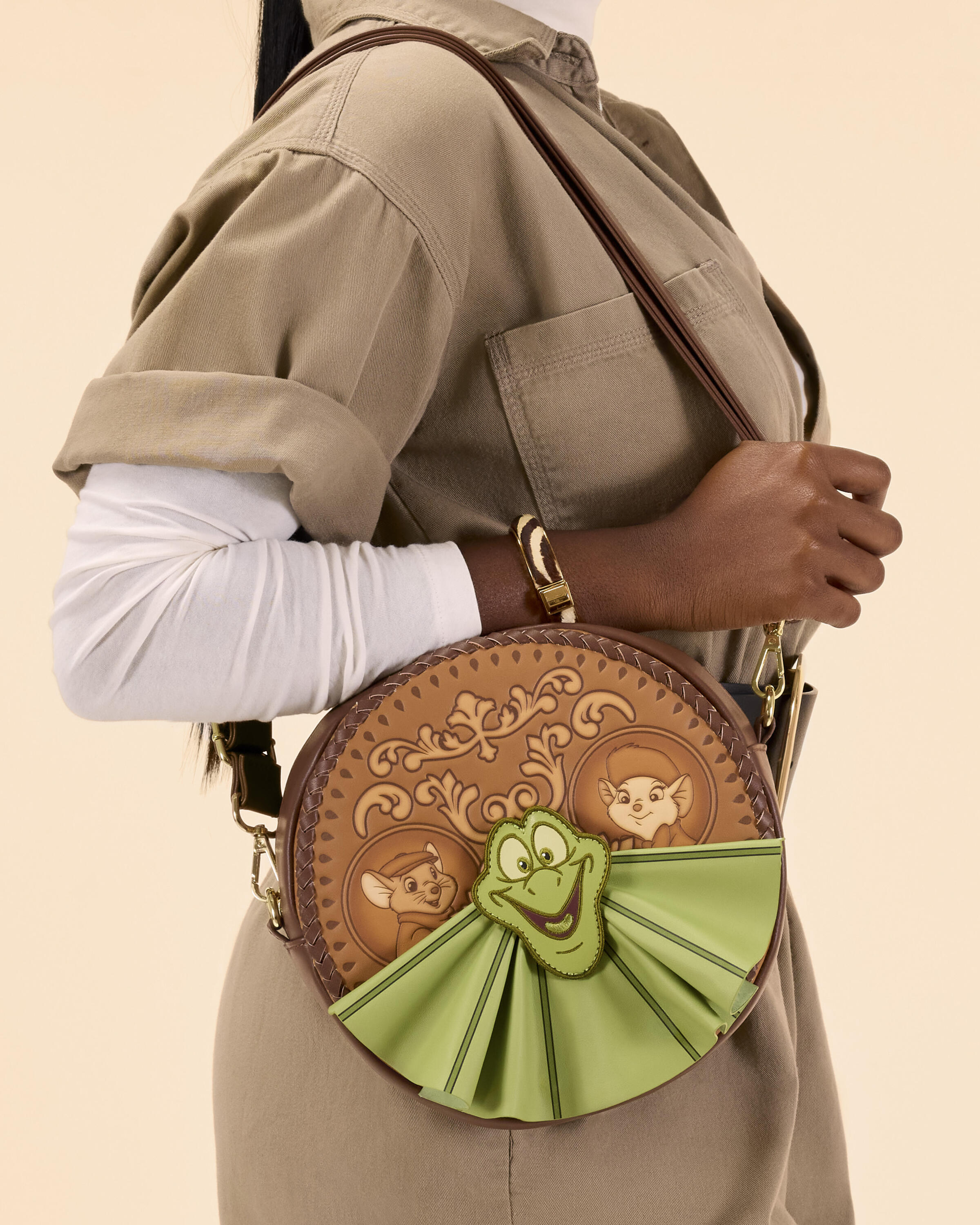 Diese Umhängetasche hat die Form eines Kreises und zeigt Frank auf der Vorderseite. Dahinter befinden sich geprägte Designs mit Bernard und Miss Bianca. Franks Halskrause reicht nach oben und bedeckt die Vorderseite der Tasche. Drehen Sie die Tasche um, um weitere geprägte Details zu entdecken, darunter die Silhouette eines Albatros.