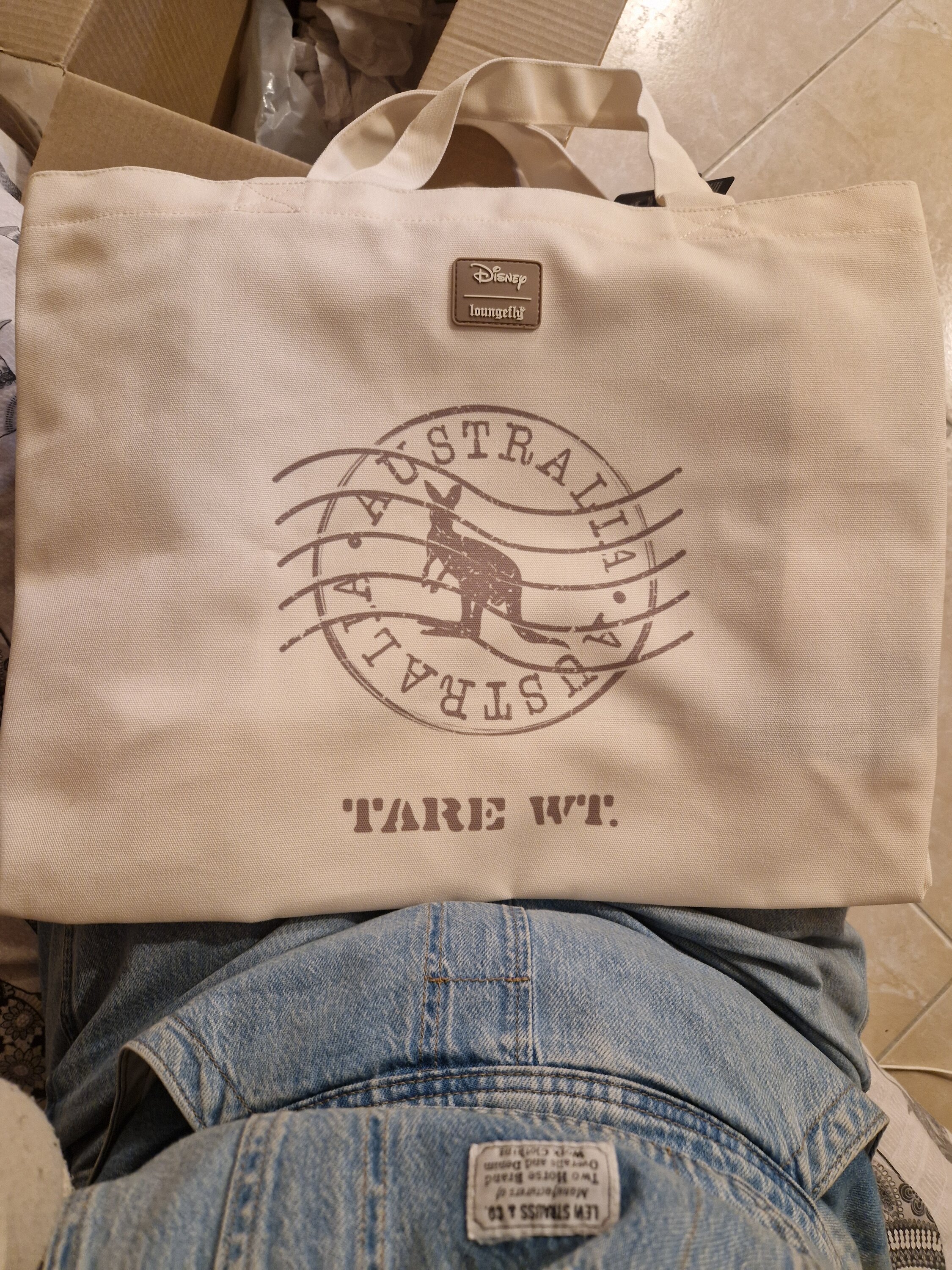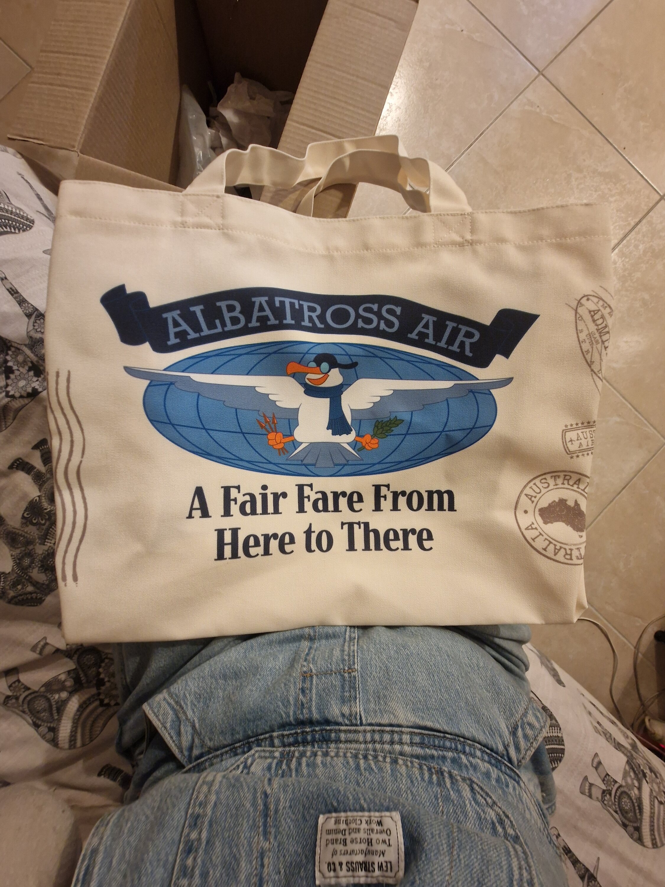 Diese Canvas- tragetasche ist eine Hommage an Disneys „Bernard und Bianca die Retter in Australien“ und zeigt das Albatross Air-Logo. Sie finden ein Albatross-Symbol vor einem Globus. Darüber befindet sich ein Banner mit der Aufschrift „Albatross Air“ und darunter „Ein fairer Tarif von hier nach dort“. An der Seite sind „Express“ und andere Symbole auf die Tasche „geprägt“. Drehen Sie sie um, um einen weiteren australischen „Stempel“ zu finden.