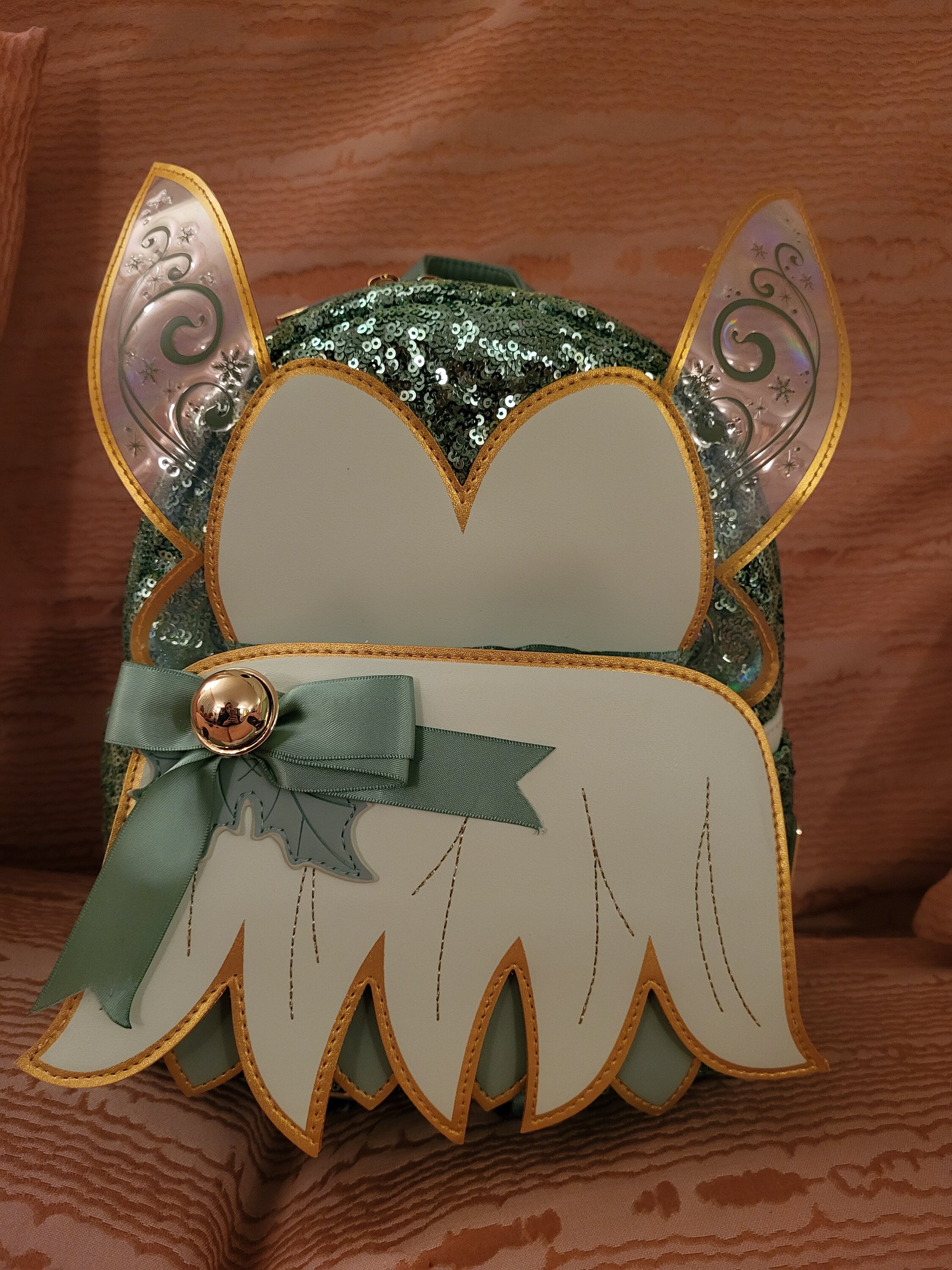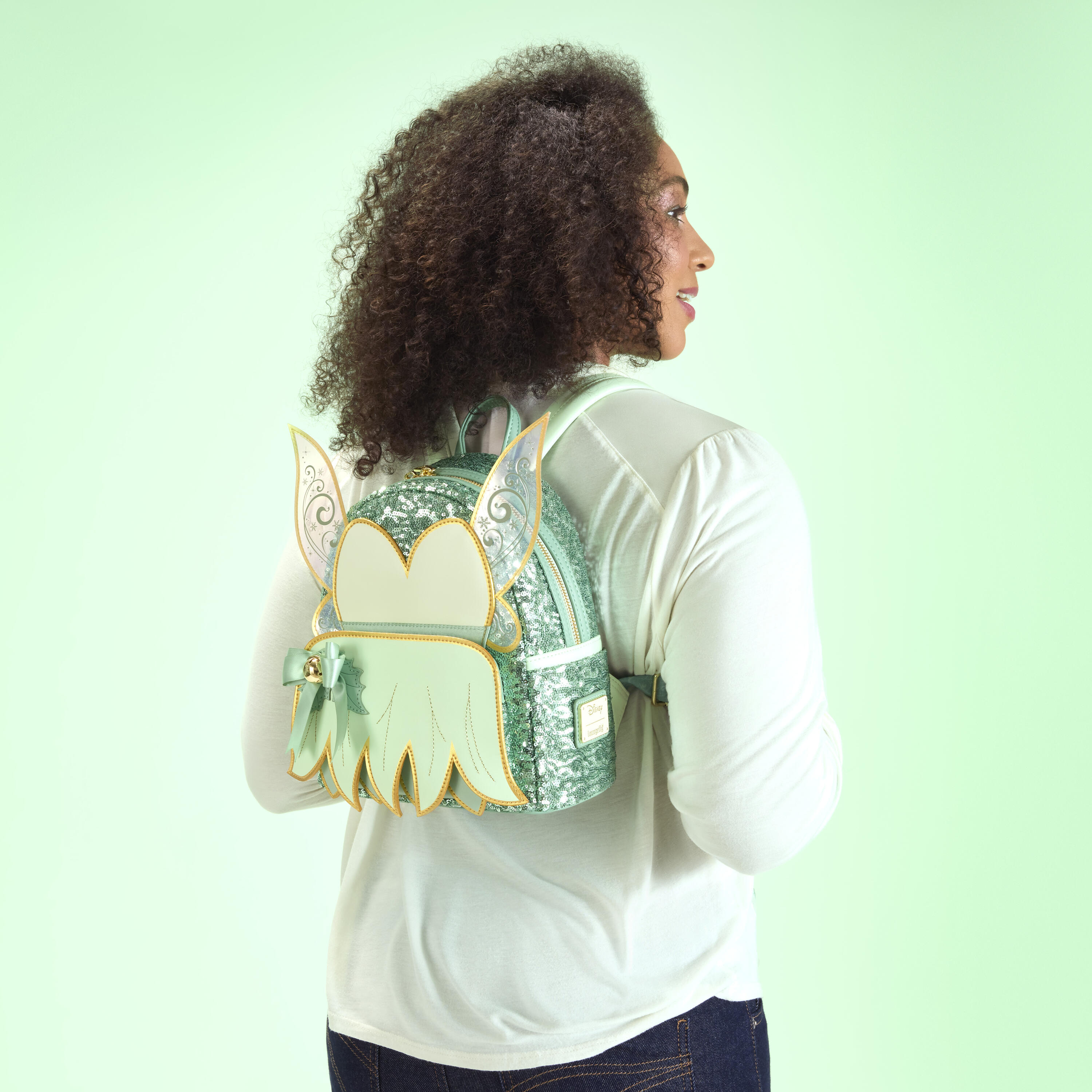 Dieser Mini-Rucksack mit Pailletten zeigt Disneys Kleinling -Kleid auf der Vorderseite. Sie finden atemberaubende Details wie Goldrandfarbe, eine Satinschleife und eine echte Glocke! PVC-Flügel erstrecken sich über die Seiten der Tasche mit geprägten Details.