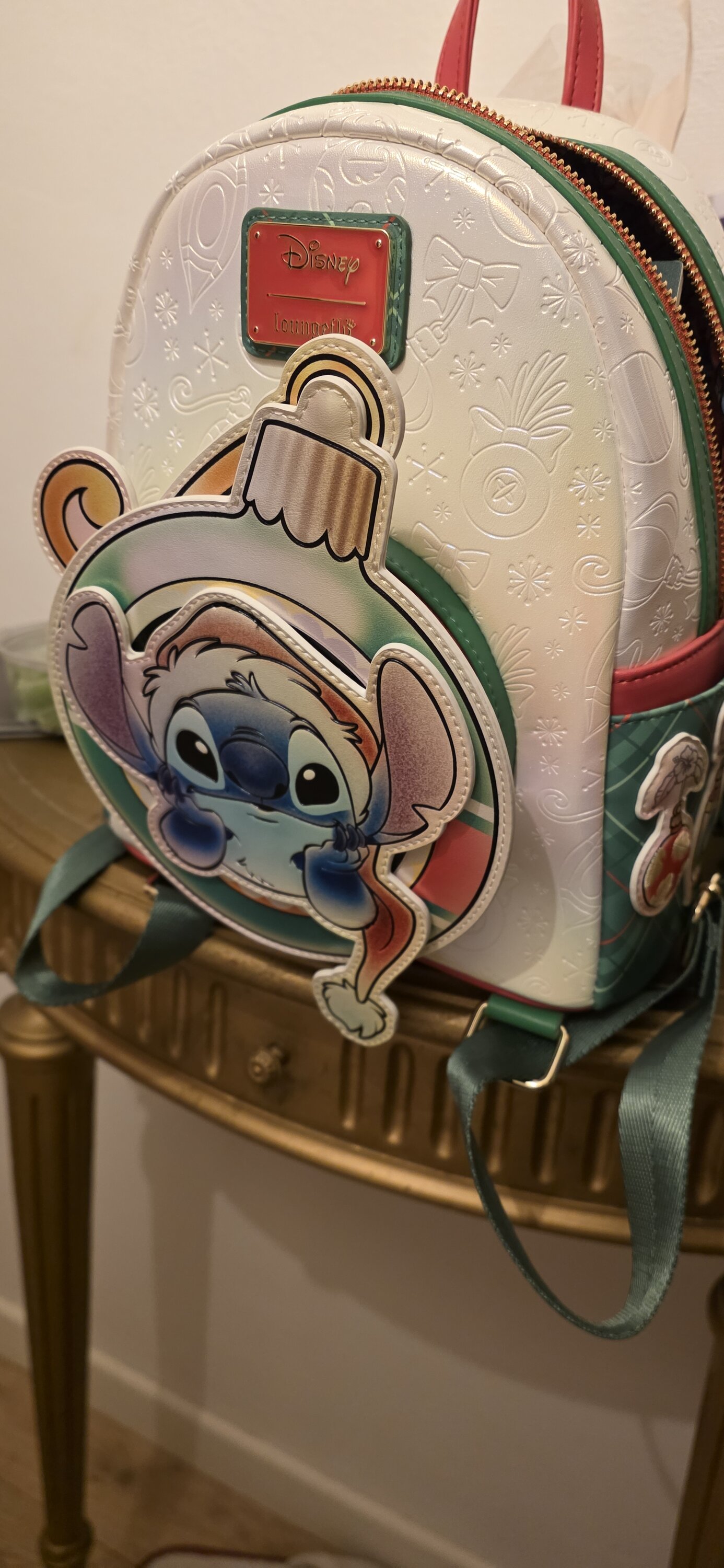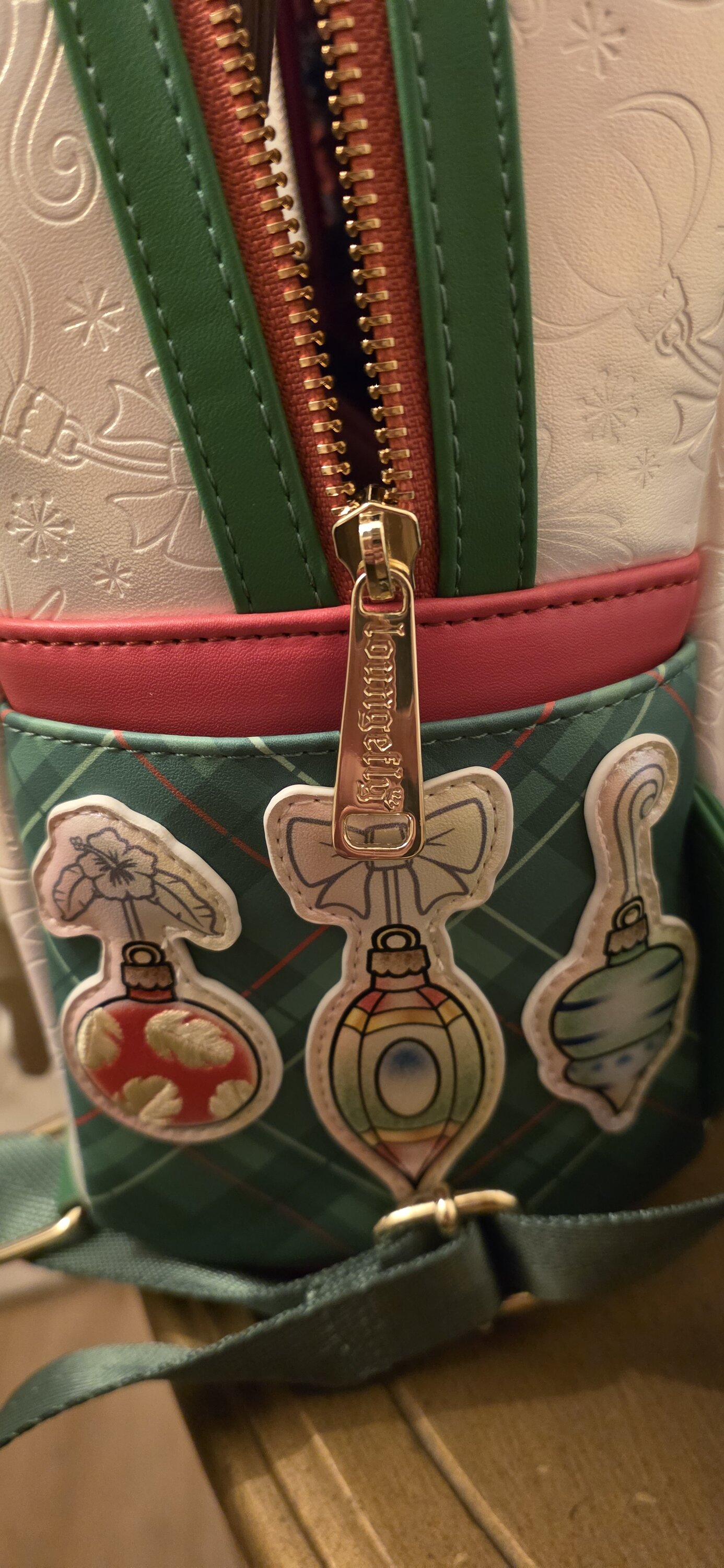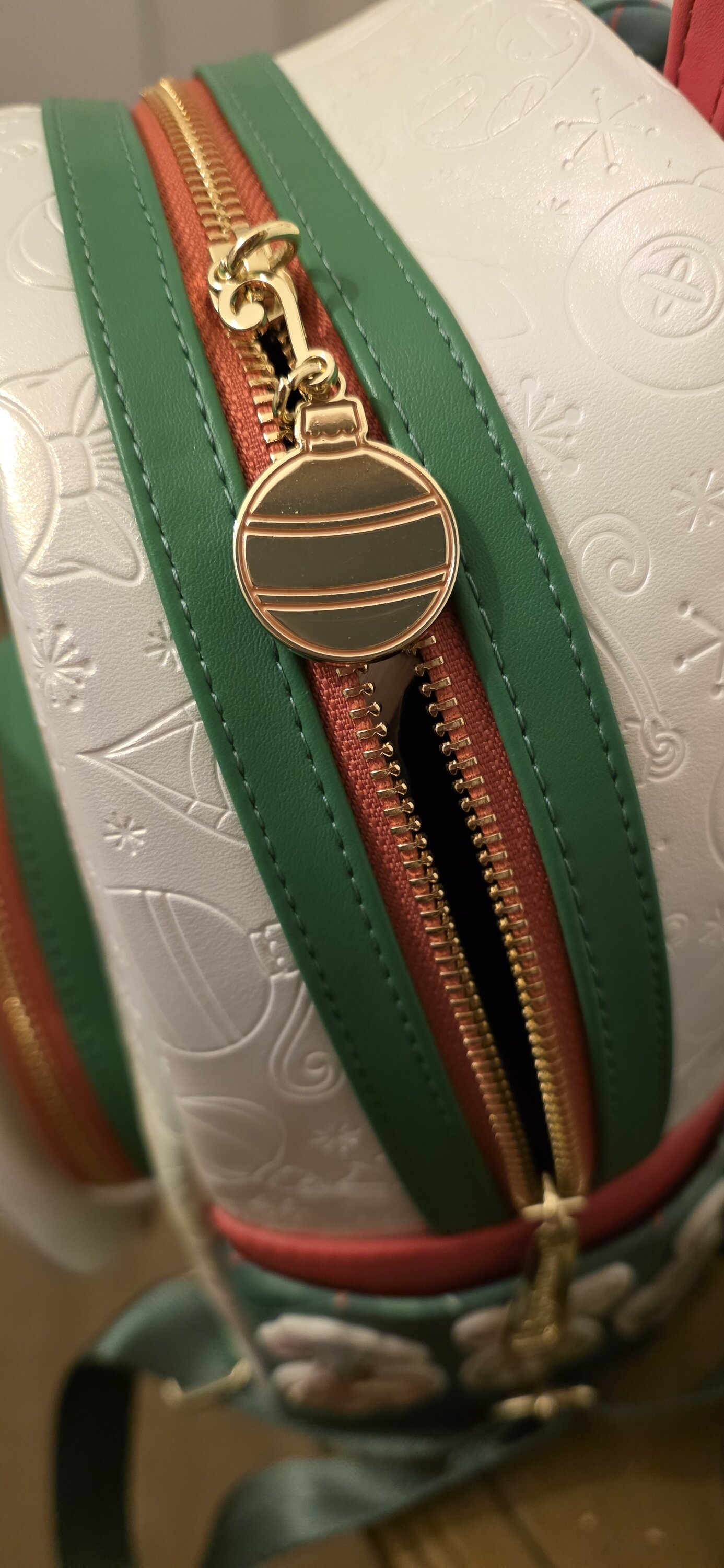 Dieser Mini-Rucksack ist bereit für die Feiertage! Stitch lugt aus einem Ornament über der Vordertasche hervor. Scrump hängt am Haken des Ornaments und kann sich hin und her bewegen! Der Rest der Tasche ist mit Ornamenten auf perlmuttfarbenem Hintergrund verziert. Die karierten Riemen runden den Look ab!