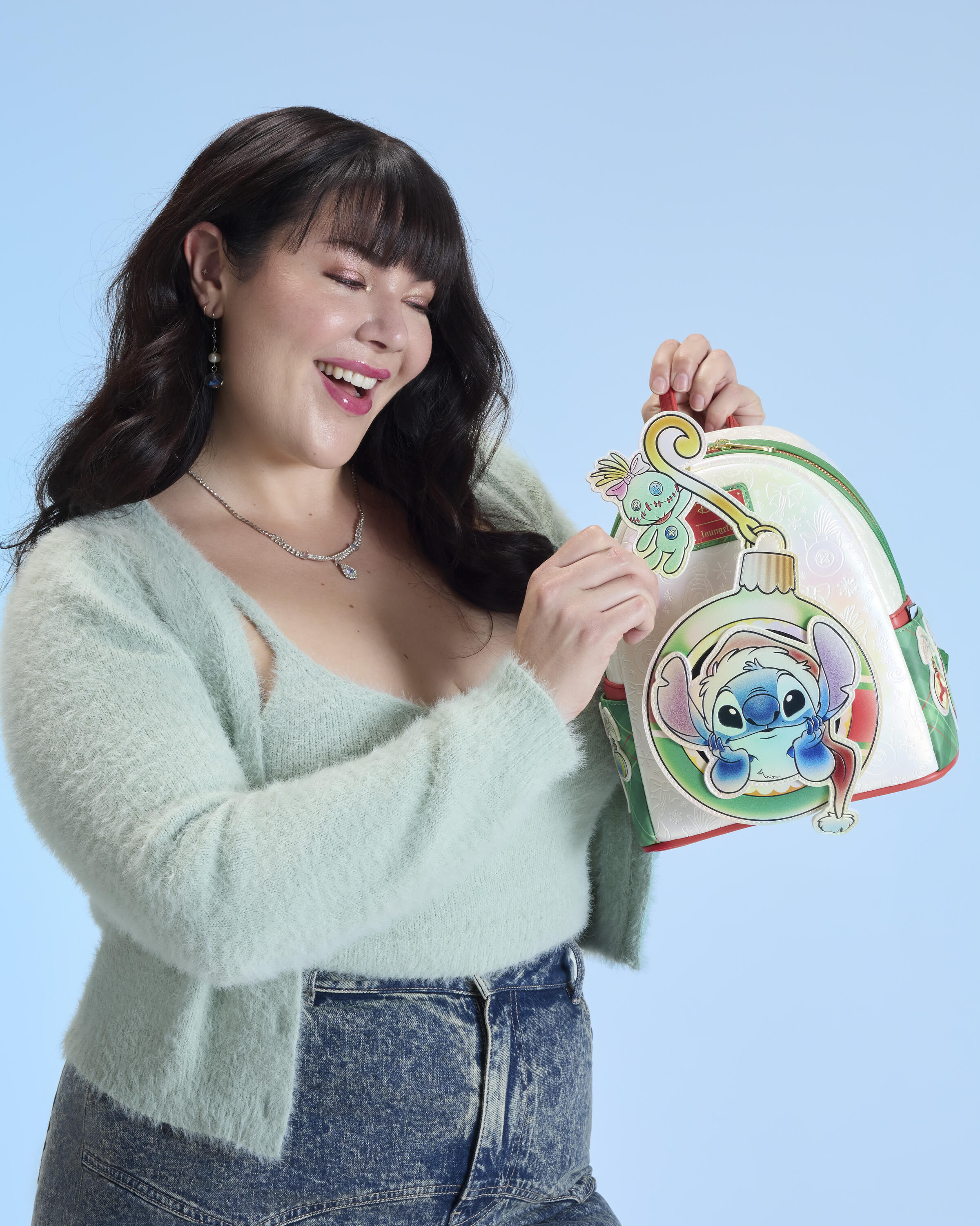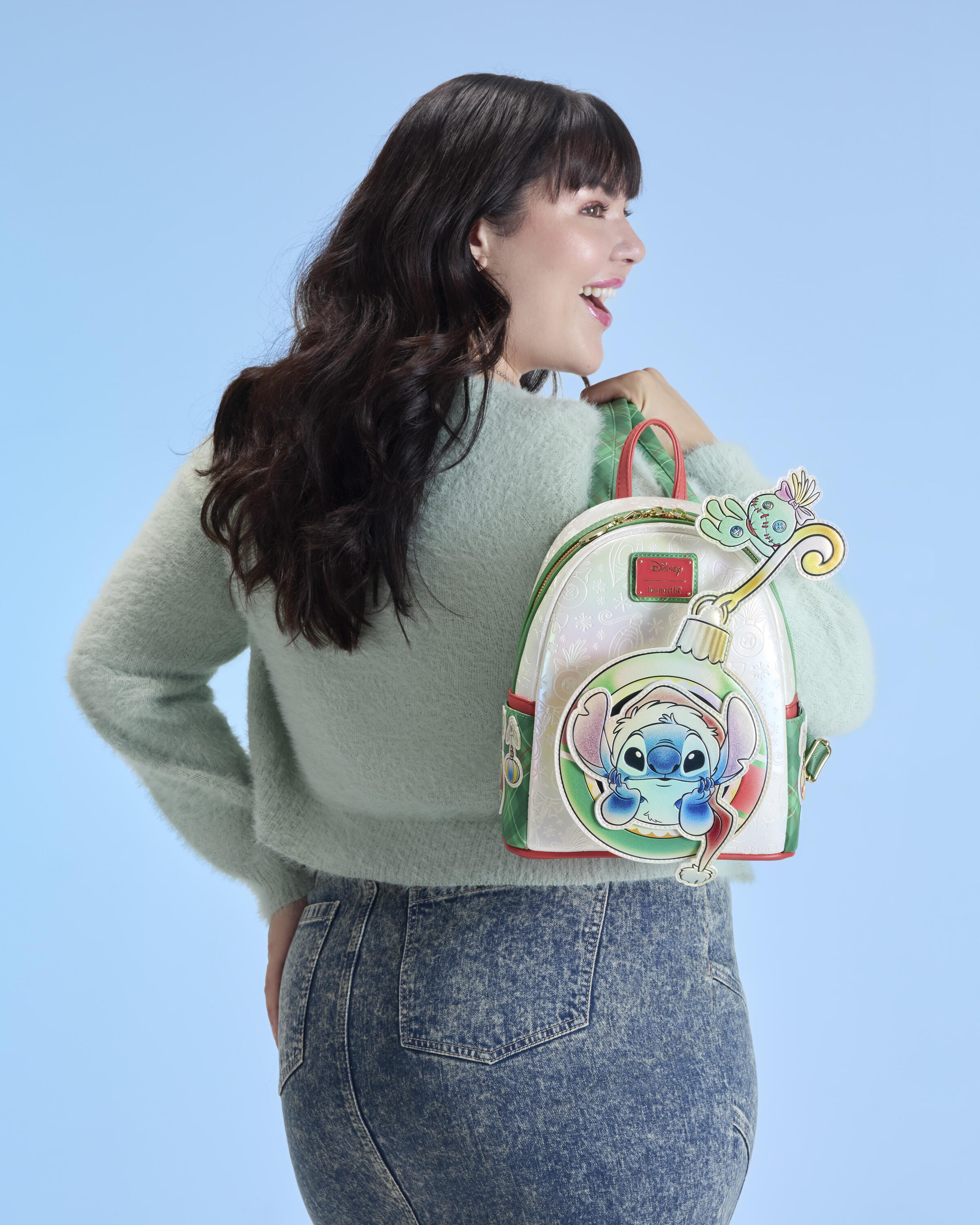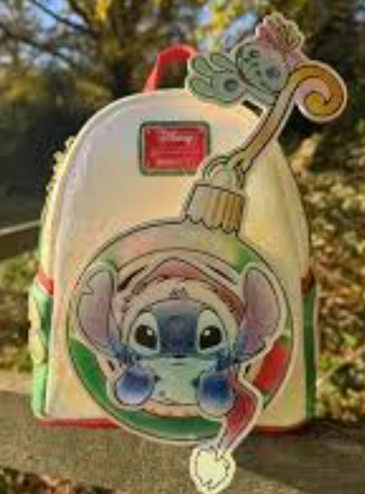 Dieser Mini-Rucksack ist bereit für die Feiertage! Stitch lugt aus einem Ornament über der Vordertasche hervor. Scrump hängt am Haken des Ornaments und kann sich hin und her bewegen! Der Rest der Tasche ist mit Ornamenten auf perlmuttfarbenem Hintergrund verziert. Die karierten Riemen runden den Look ab!
