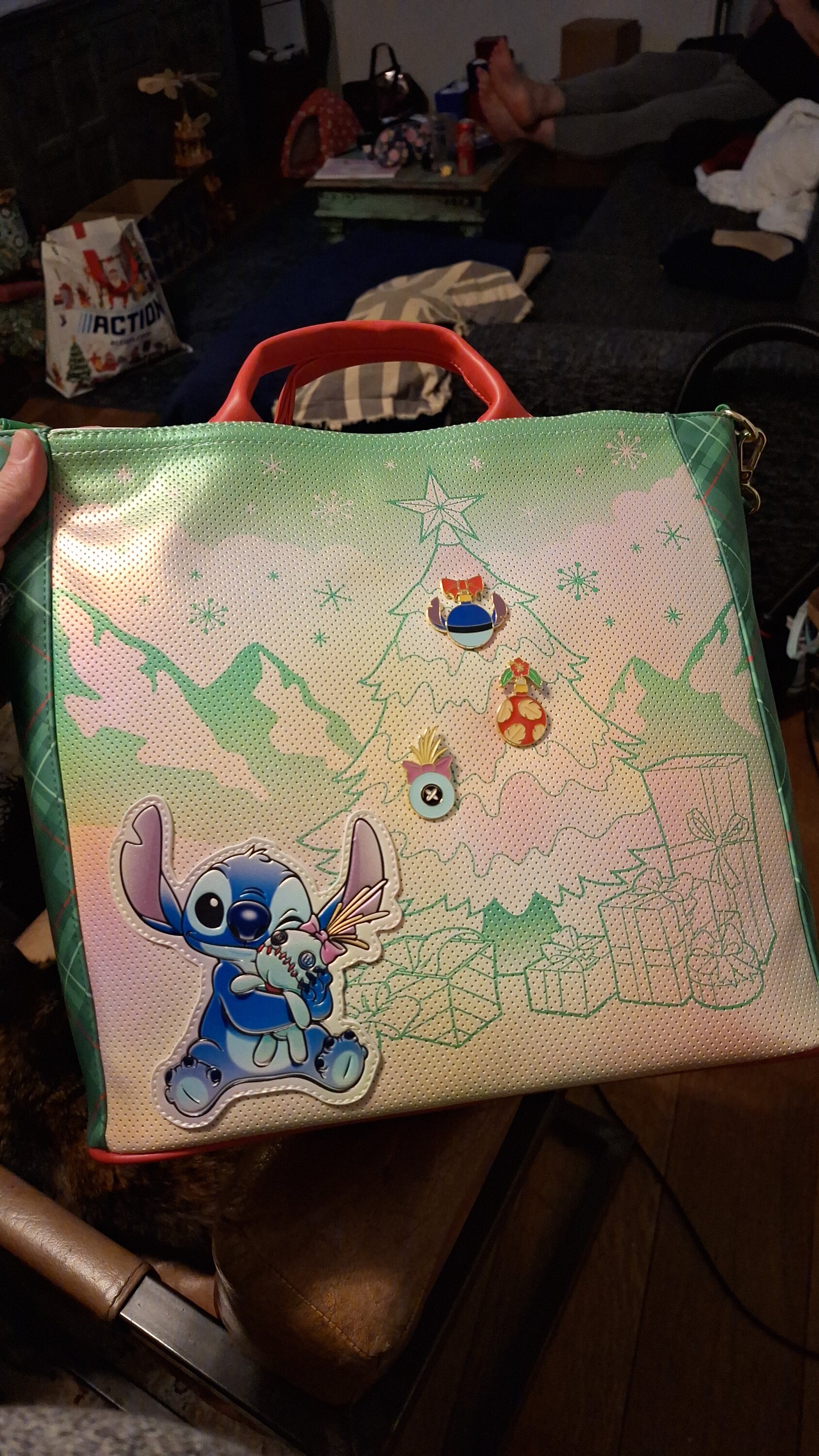 Diese tragetasche zeigt Stitch neben einem Weihnachten , umgeben von Geschenken. Die Vorderseite der Tasche besteht aus perforiertem Kunstleder. Emaille anstecker in Form von Ornamenten sind im Lieferumfang enthalten. Sie können die anstecker am perforierten Kunstleder befestigen und den Baum damit schmücken! Die Seiten der Tasche sind mit weihnachtlichem Karomuster versehen und die Rückseite zeigt mehrere Weihnachtssymbole wie Ornamente und Schneeflocken auf einem perlmuttartigen material.