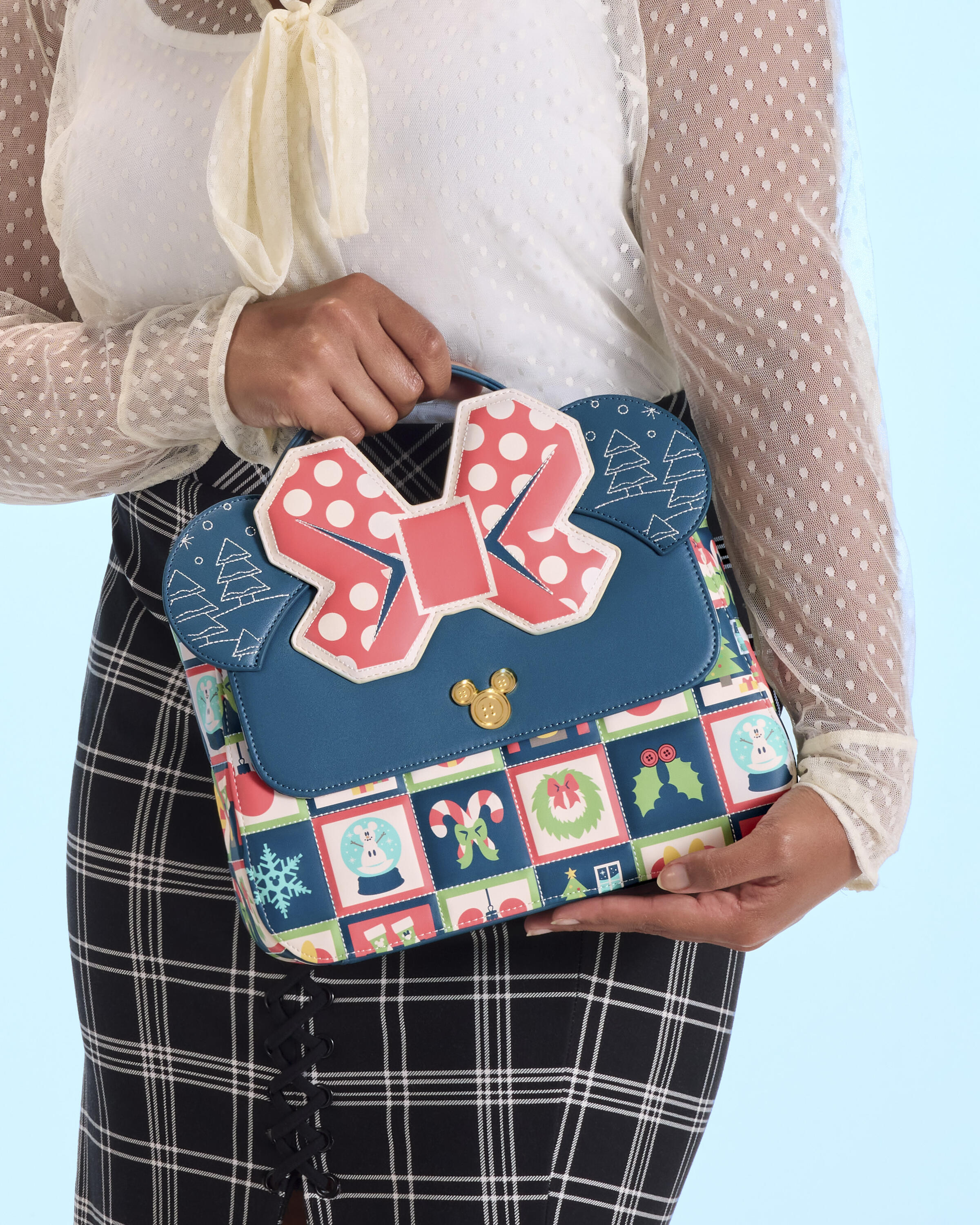 Diese umhängetasche ist von Disneys Minnie Maus inspiriert! Sie finden ein Allover-Muster mit gepolsterten Prägungen von Schneekugeln, Zuckerstangen, Kränzen, Schneeflocken und vielem mehr. Auf der vorderen Klappe befindet sich eine geformte Metallniete mit der Silhouette von Mickey Maus. Außerdem finden Sie oben applizierte Ohren und Minnie Mauss Schleife!