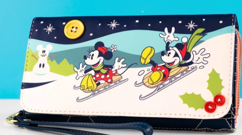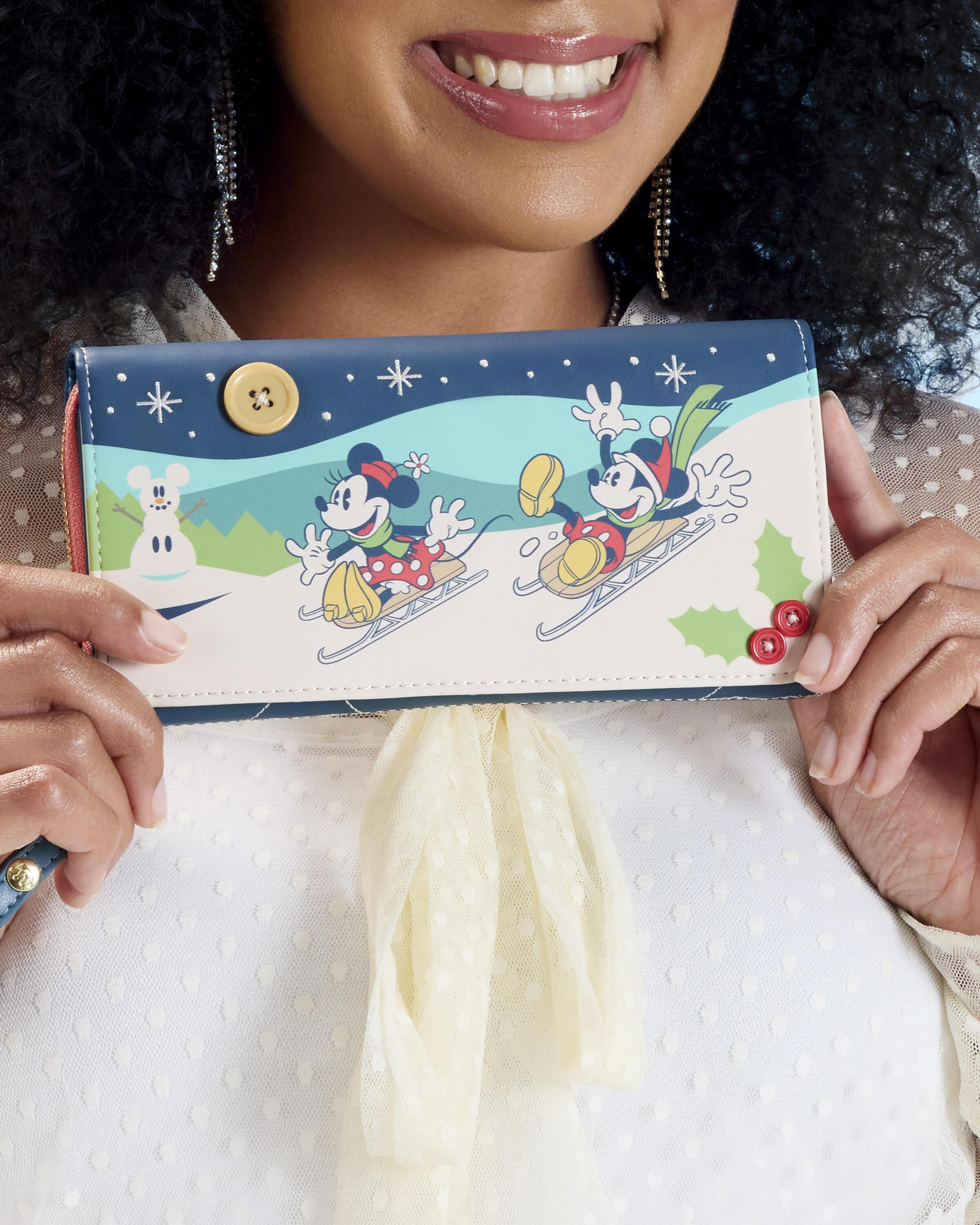 Diese Geldbörse mit Handgelenksverschluss zeigt Mickey und Minnie beim Rodeln einen Hügel hinunter. Auf der Rückseite finden Sie ein gepolstertes, geprägtes Design mit verschiedenen Feiertagssymbolen wie Kränzen, Geschenken, Schneeflocken und mehr! Im Inneren befinden sich sechs Kartenfächer und ein durchsichtiges Ausweisfach. Außerdem gibt es ein abnehmbares Armband, sodass Sie es tragen können, wie Sie möchten!