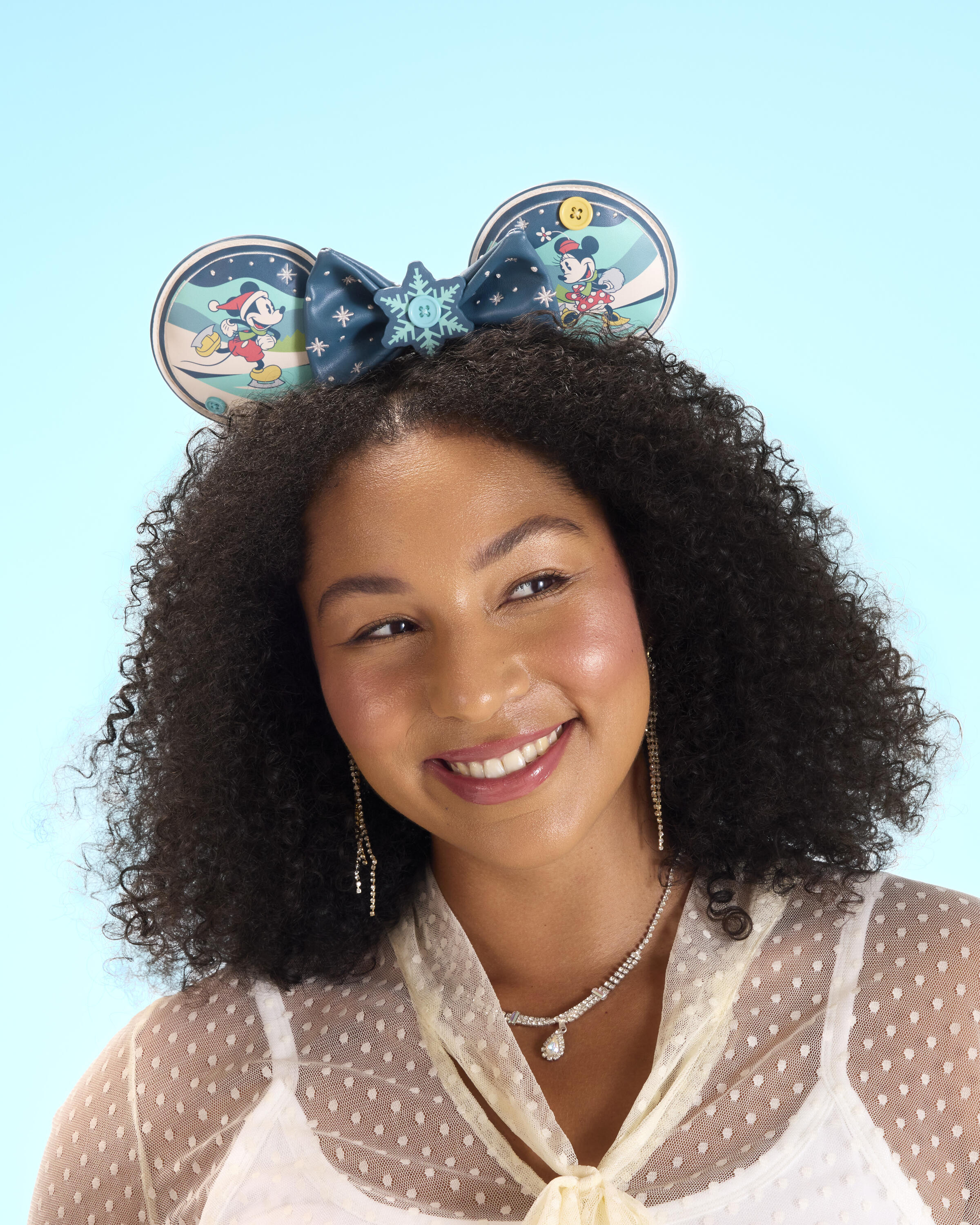 Dieses Ohr-Stirnband zeigt Mickey und Minnie beim Eislaufen. Zwischen den Ohren befindet sich eine abnehmbare Schleife mit einem Schneeflockenanhänger in der Mitte und Sternen auf der Schleife. Drehen Sie es um und entdecken Sie auf der Rückseite der Ohren ein gestepptes Muster mit immergrünen Bäumen.