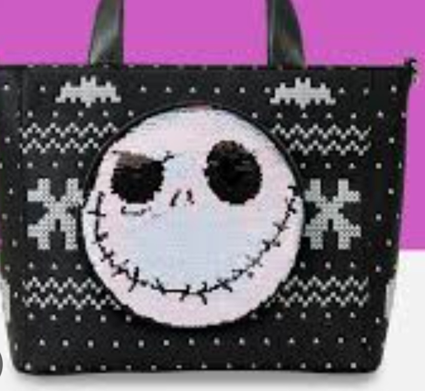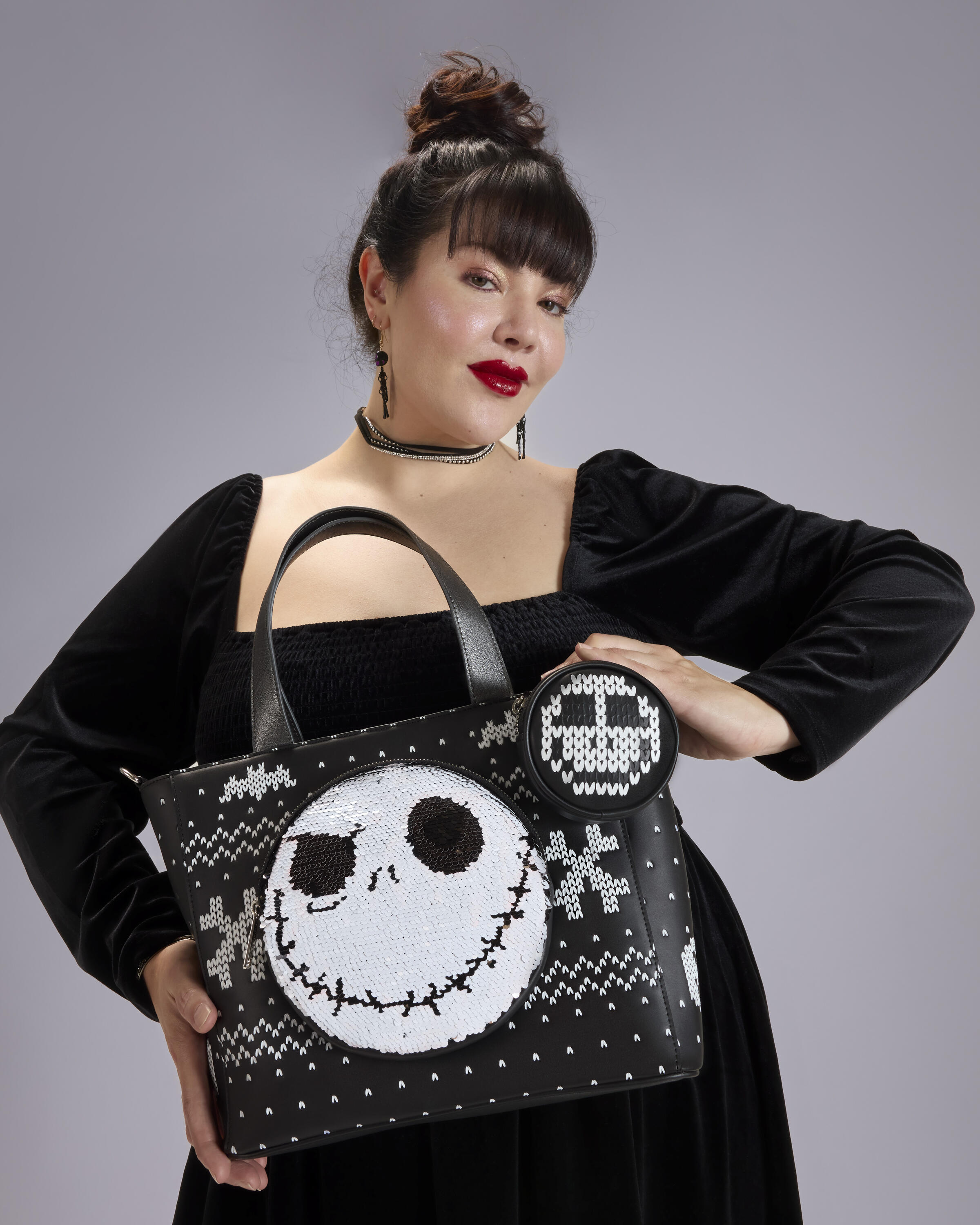 Diese Tragetasche zeigt ein von einem Weihnachtspullover inspiriertes Motiv. Auf der Rückseite finden Sie Fledermäuse, Zickzack-Designs und die Aufschrift „Pumpkin King“. Auf der Vorderseite finden Sie Jack Skellingtons Gesicht aus Pailletten. Die Pailletten sind wendbar, sodass das Bild in eine Kürbislaterne verwandelt wird! Der am Umhängegurt befestigte Münzbeutel passt zum Jack-Motiv auf der Tasche und lässt sich auch zwischen ihm und einer Kürbislaterne austauschen!