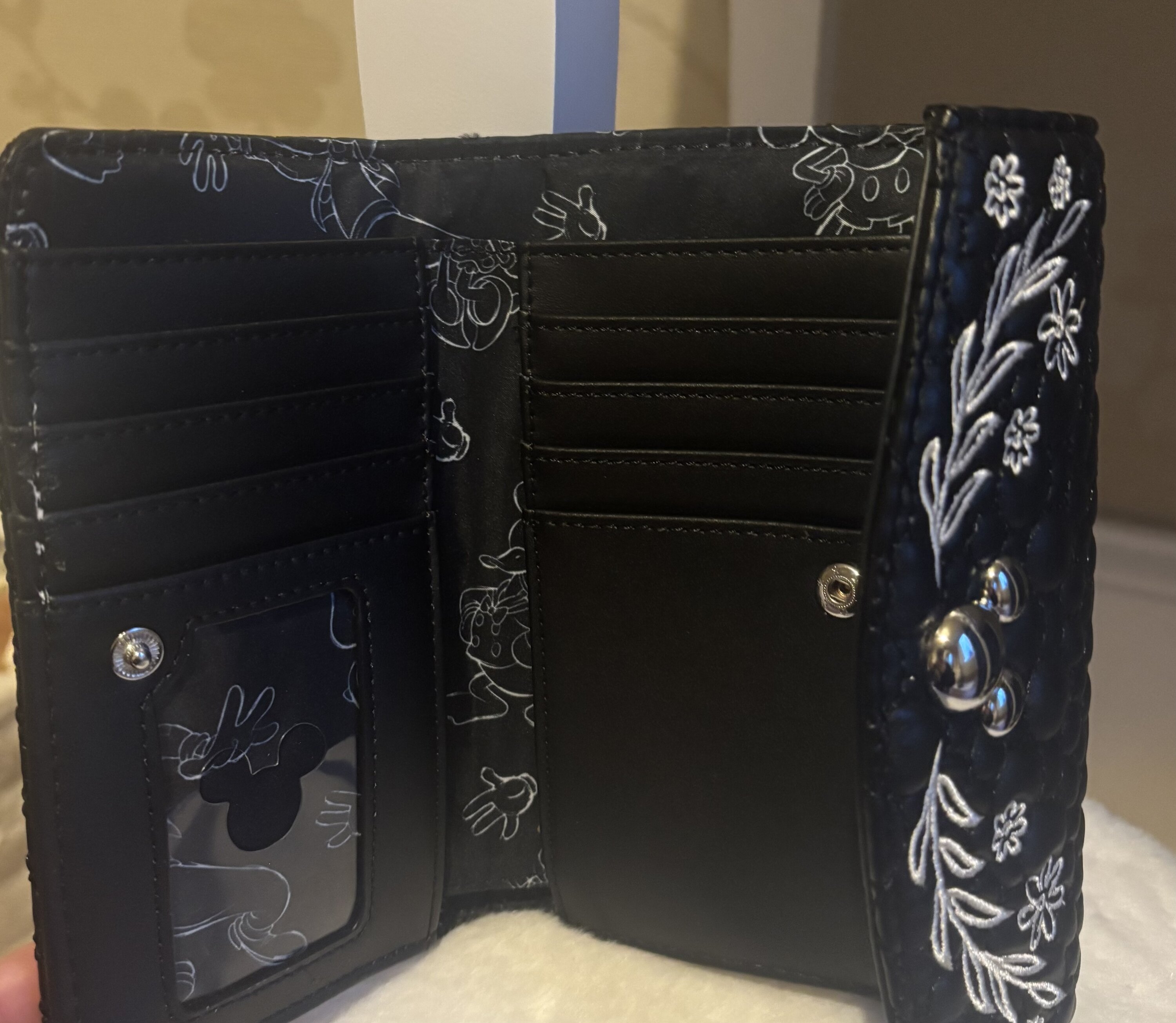 Diese Geldbörse ist mit einem durchgehenden Steppmuster aus Mickey Maus -Silhouetten verziert. Die Klappe ziert ein Metallanhänger in Form einer Mickey Maus -Silhouette, umrahmt von gestickten Blumen und Blättern. Innen befinden sich sieben Kartenfächer und ein transparentes Fach für Ihren Ausweis. Das perfekte Disney-Accessoire für den ganzen Tag!