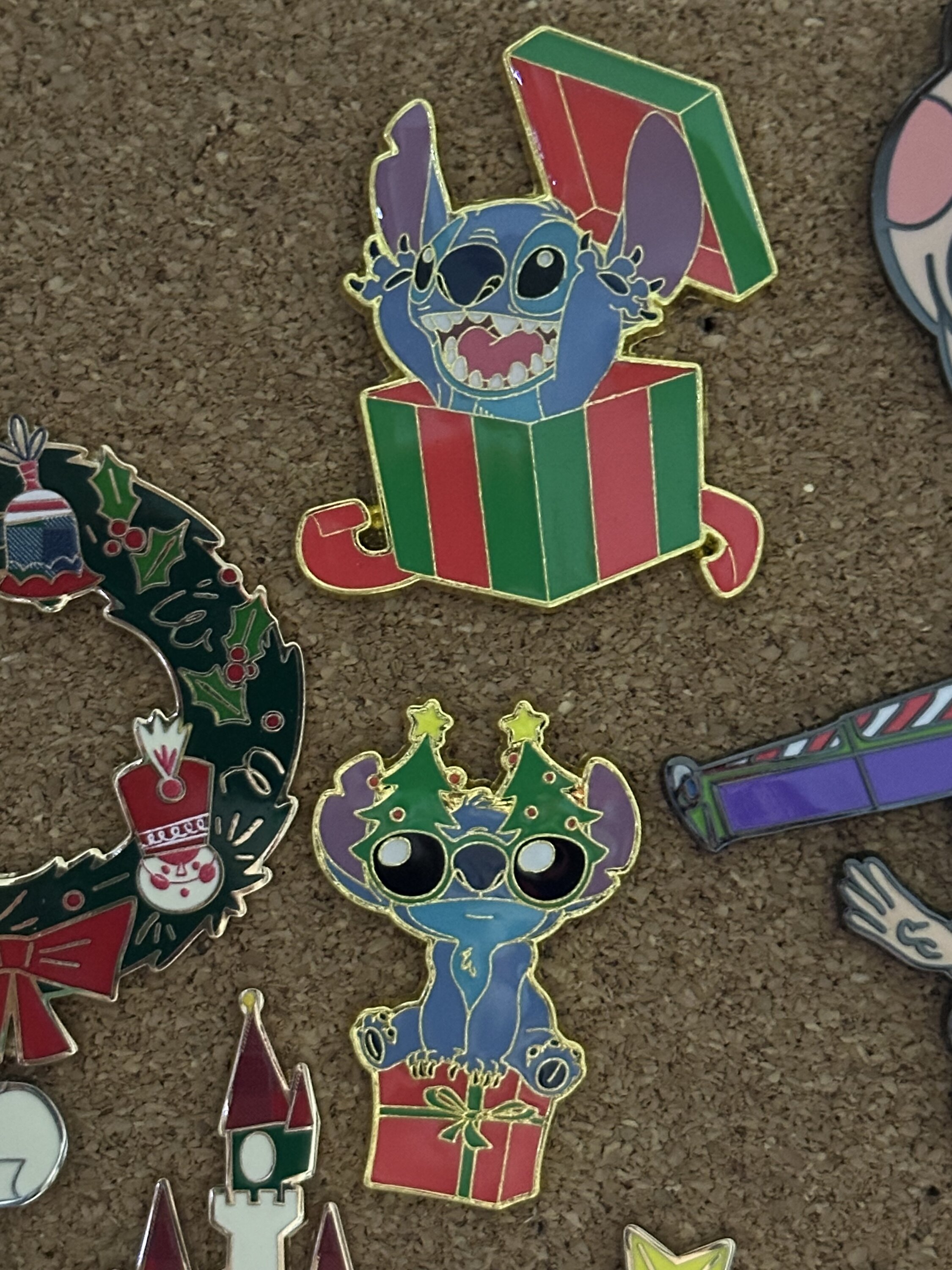 Jeder Pin zeigt Stitch in einer fröhlichen Weihnachtspose, mit Weihnachtsmannmütze und voller Weihnachten .