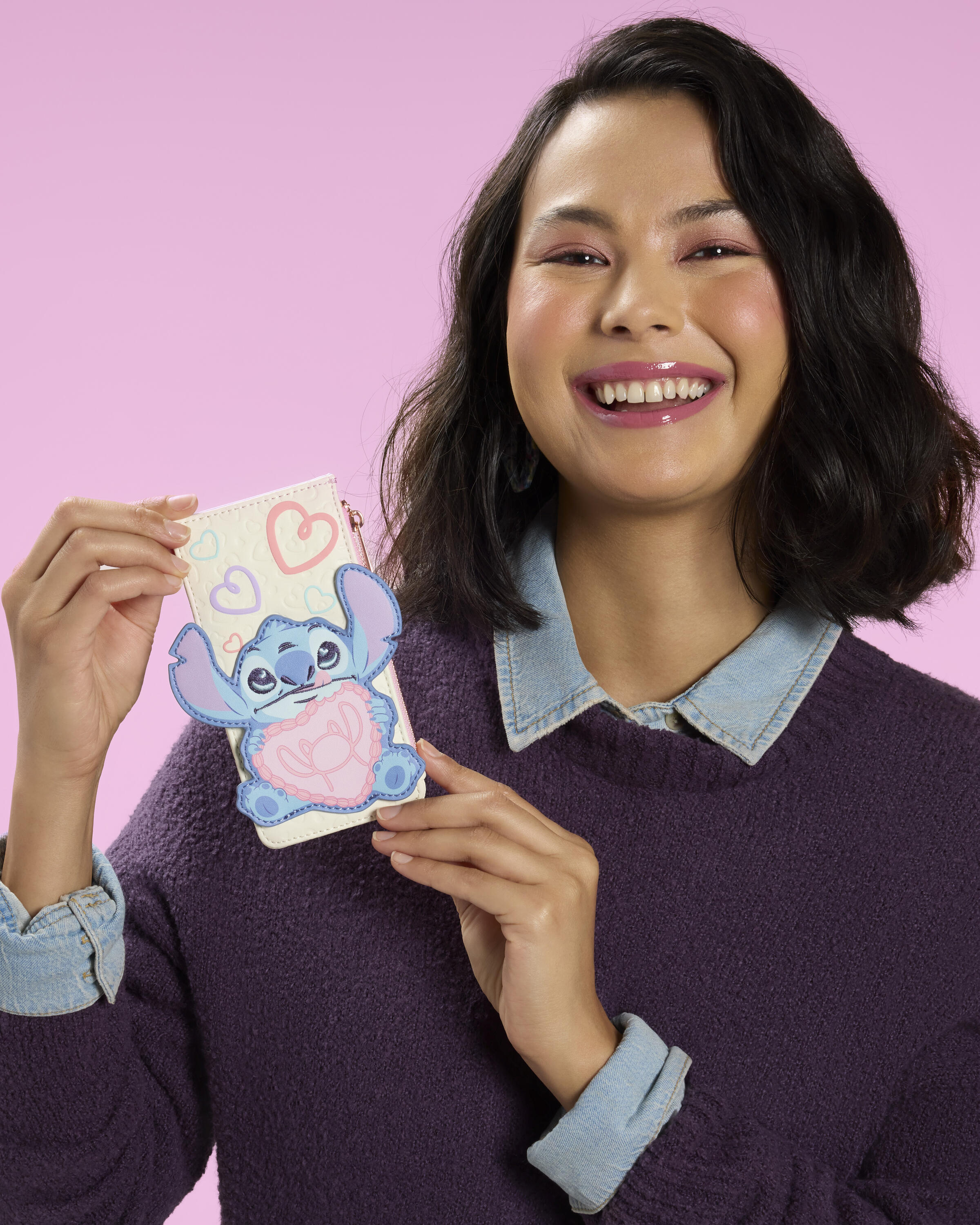 Mit diesem bezaubernden Stitch -Kartenhalter bist du bestens für den Valentinstag gerüstet. Auf der Vorderseite hält Stitch einen herzförmigen Kuchen, auf dem Angels Silhouette aufgespritzt ist. Vorder- und Rückseite des Kartenhalters sind mit einem geprägten Herzmuster und aufgedruckten Herzen verziert! Drehe es um, um vier rosa-blaue Kartenfächer zu entdecken.