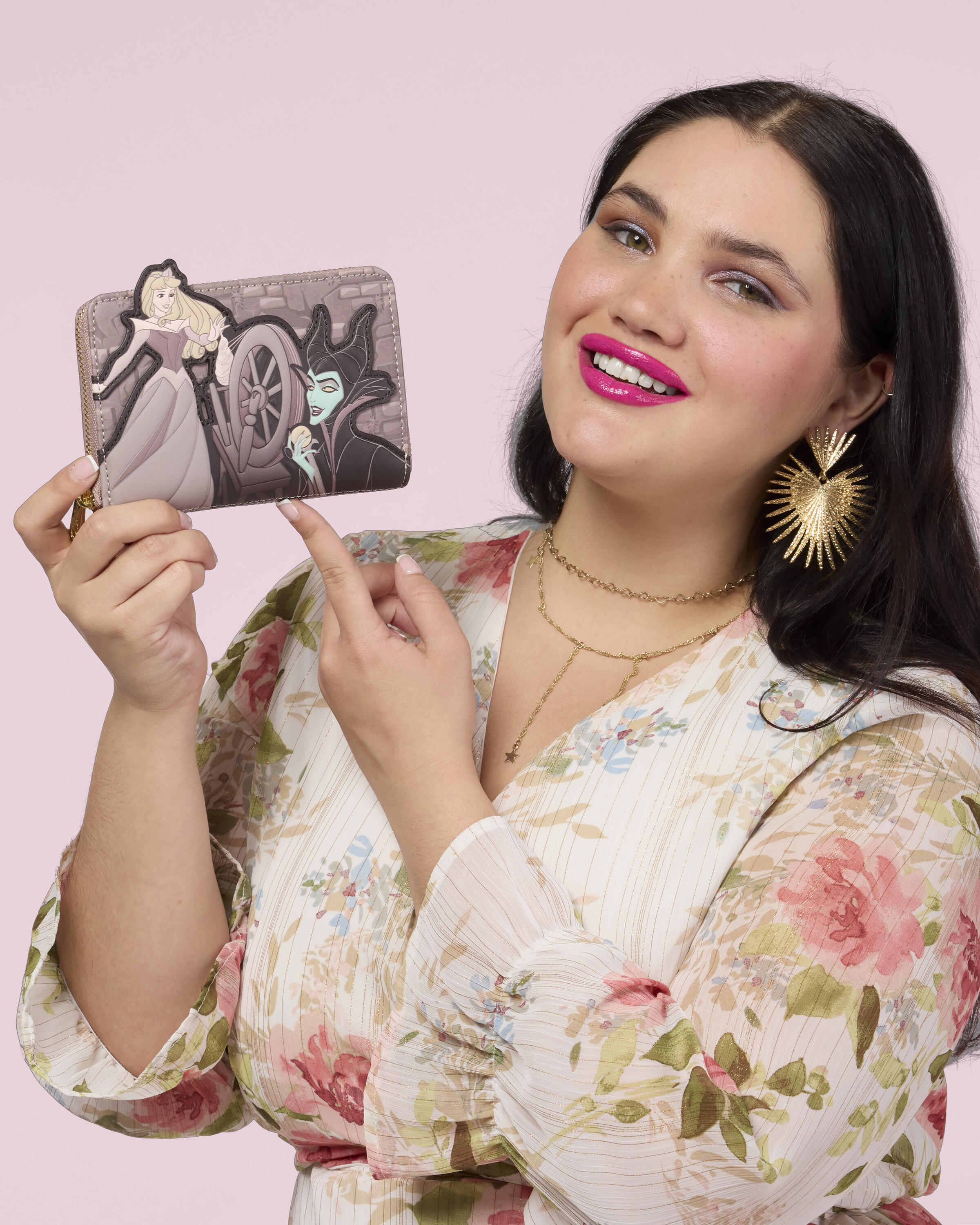 Diese Geldbörse erweckt Maleficents Fluch zum Leben: Prinzessin Aurora greift nach einem sich drehenden Rad, während Malefiz gespannt zusieht. Innen befinden sich vier Kartenfächer und ein transparentes Ausweisfach. Dreht man die Geldbörse um, entdeckt man Bilder der drei guten Feen! Zeigt mit dieser Geldbörse eure Begeisterung für eine eurer liebsten Disney-Geschichten!