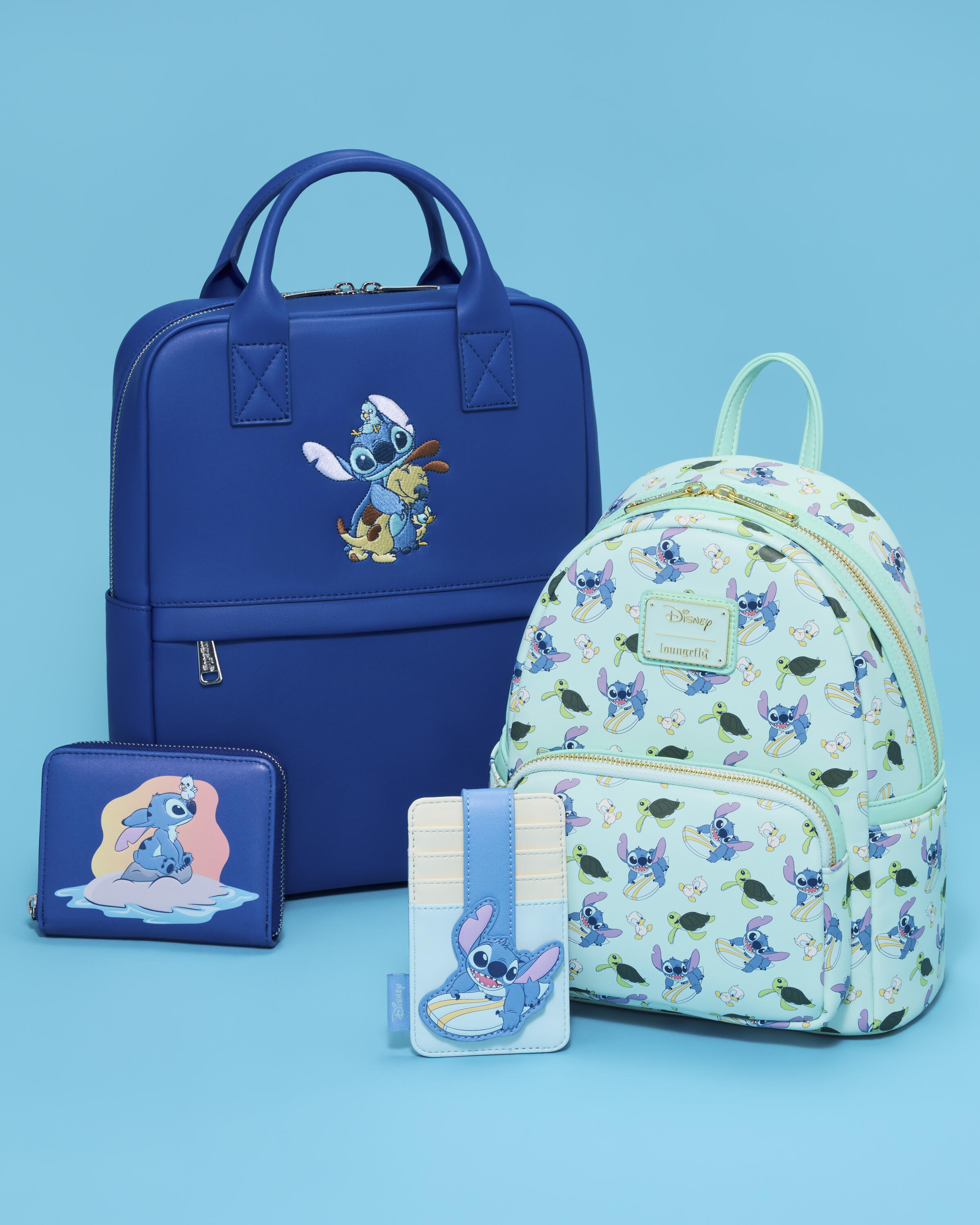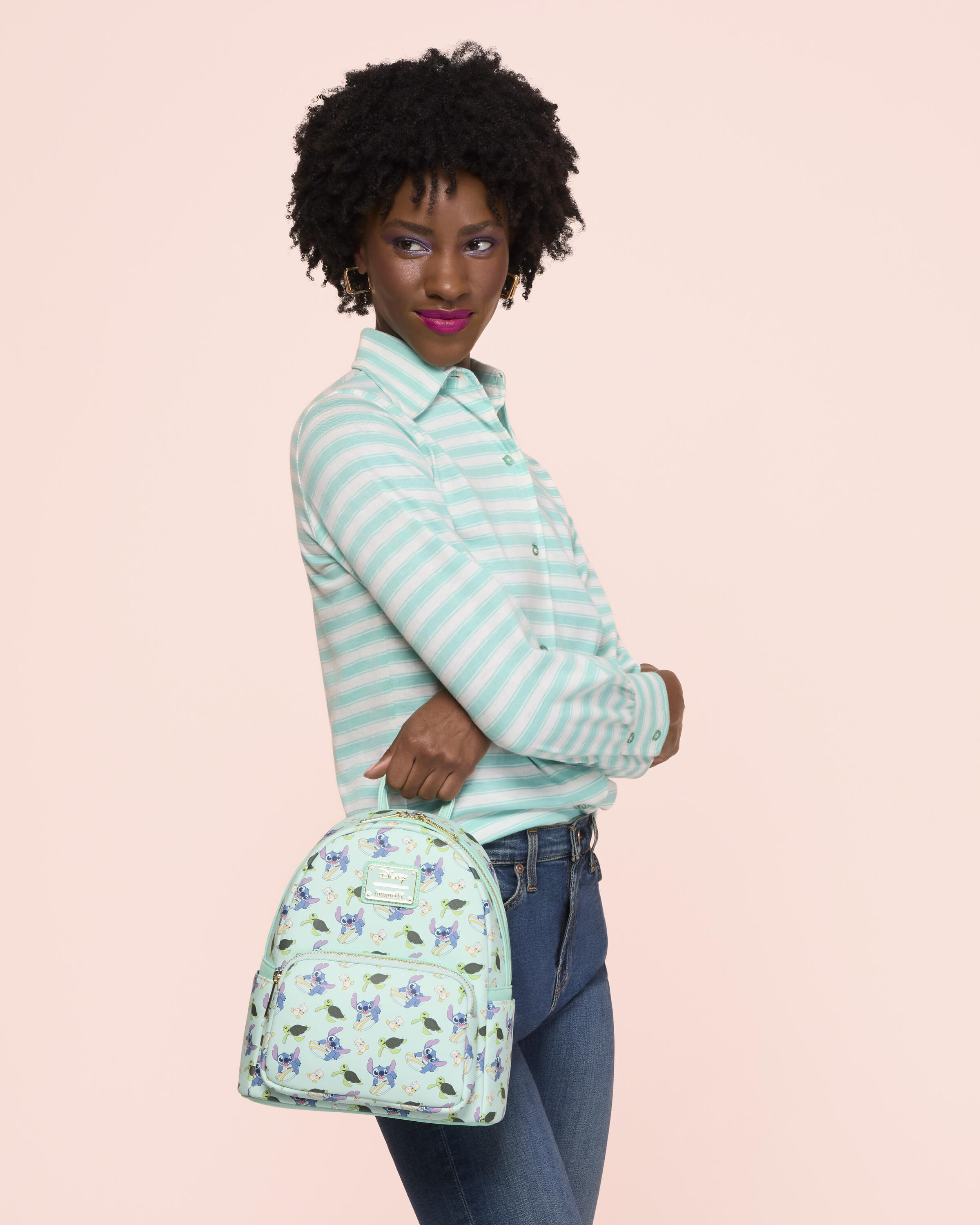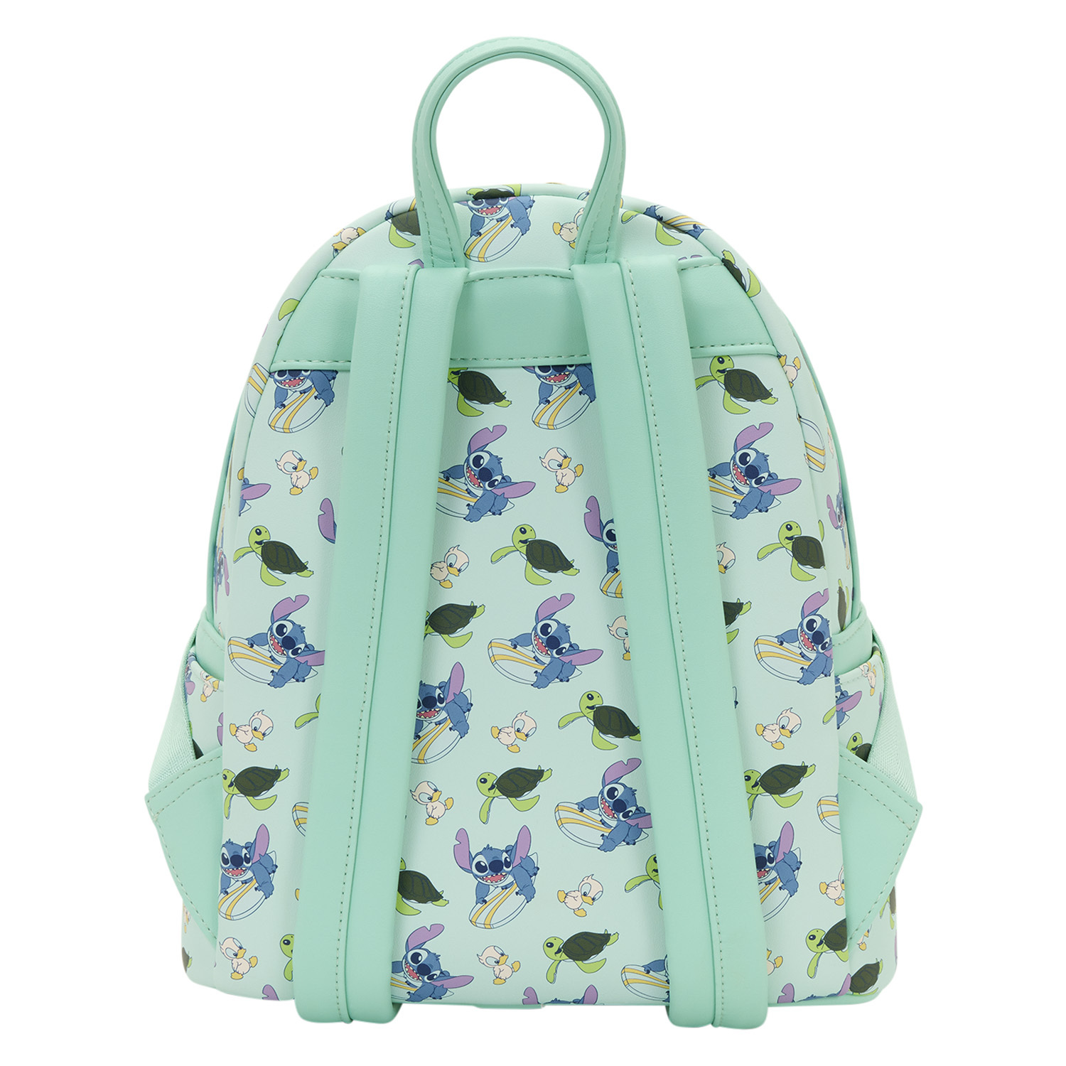 Dieser Mini-Rucksack ist mit einem Allover-Print von Stitch auf einem Surfbrett, Entenküken und Meeresschildkröten verziert! Schau genau hin und du entdeckst Entenküken-Applikationen an den Trägern! Ein superniedlicher Rucksack, der deine Liebe zu Lilo & Stitch zeigt. und ist bereit für jedes Abenteuer!