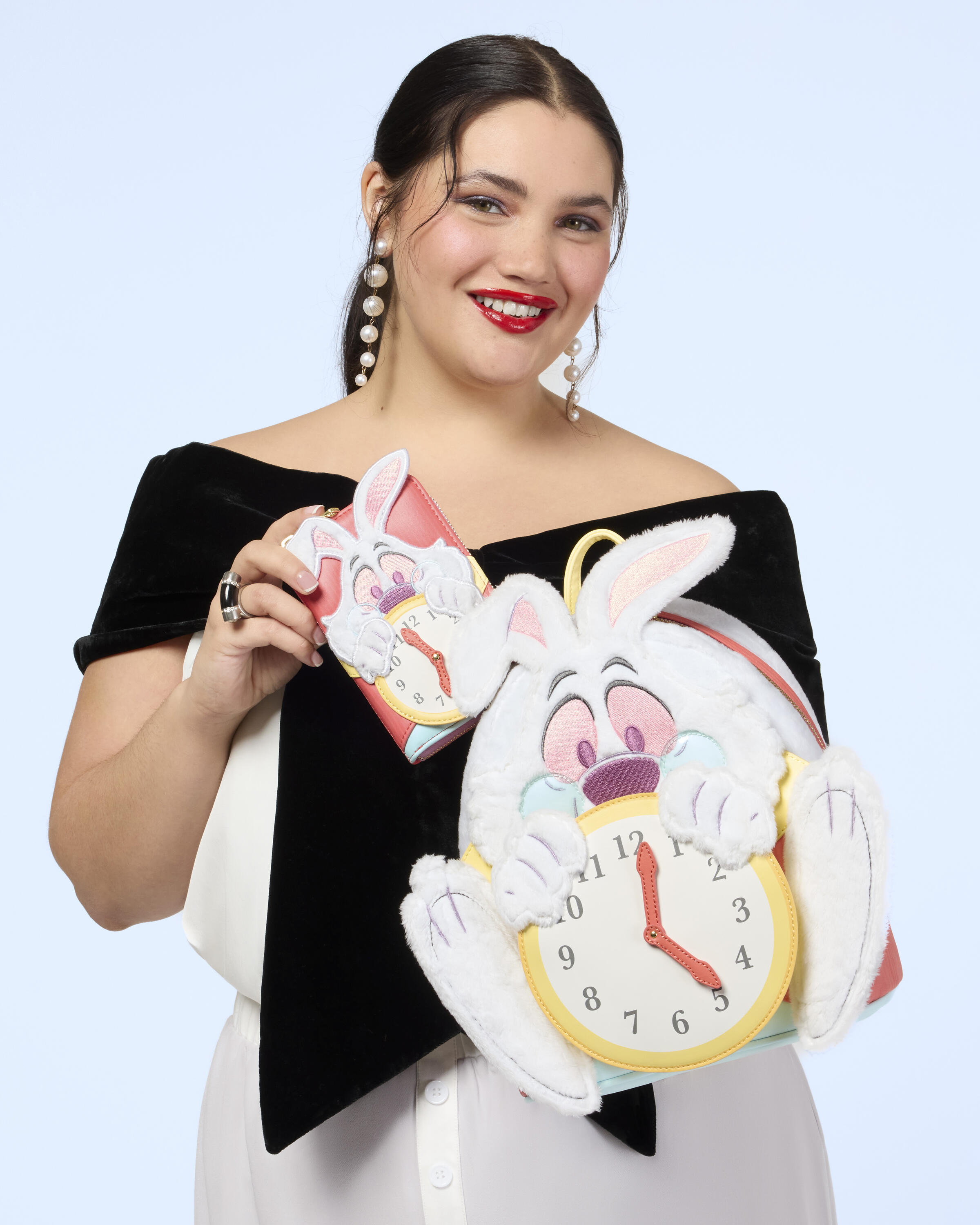 Dieser Mini-Rucksack ist perfekt für jedes wichtige Date! Er zeigt das Weiße Kaninchen aus Disneys Alice im Wunderland. Kunstfell, gestickte Gesichtszüge, PVC und Plüschdetails erwecken das Kaninchen zum Leben. Es hält eine Uhr, deren Zeiger sich an einem Niet drehen! Tauche ein in die Welt des Stils!