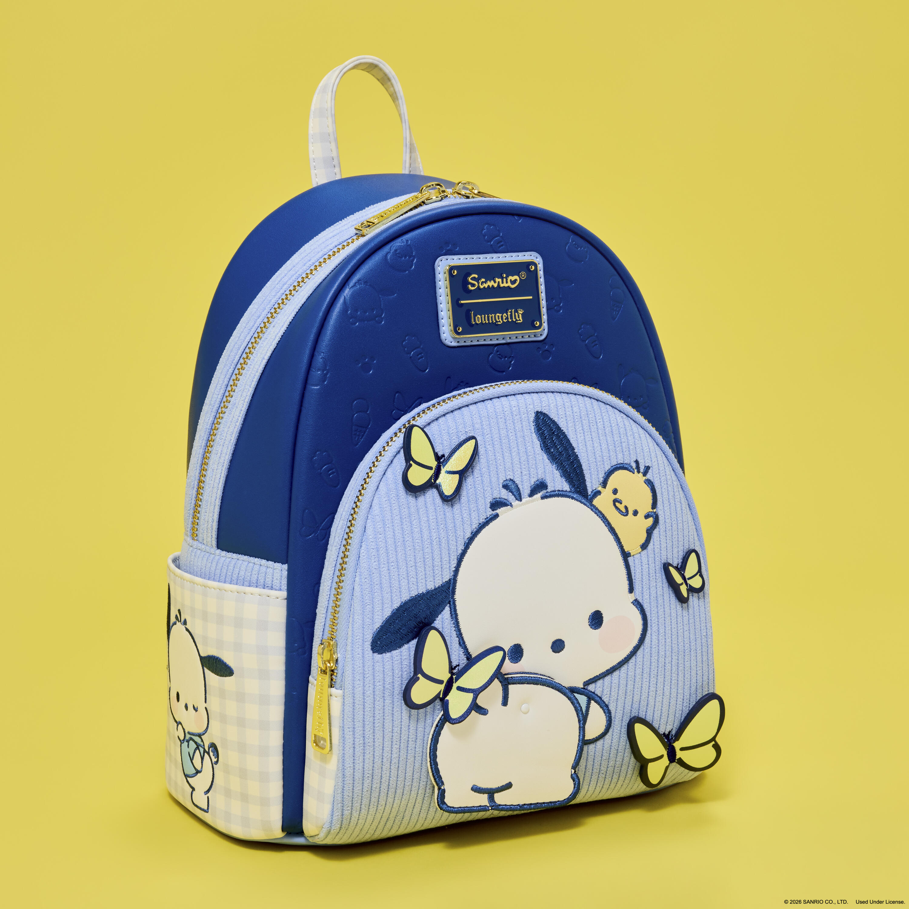 Dieser bezaubernde Mini-Rucksack ist von Pochacco inspiriert! Du findest ihn auf der Vorderseite, umgeben von Schmetterlingen! Auch auf den Seitentaschen ist er zu sehen und sieht einfach nur zuckersüß aus! Auf der Vorderseite schwingt Pochaccos Hinterteil an einer Niete! Die Seitentaschen, der Tragegriff und die Schultergurte sind mit einem hellblau-weißen Vichy-Karomuster verziert. Außerdem sind an den Trägern schillernde Schmetterlingsapplikationen angebracht!