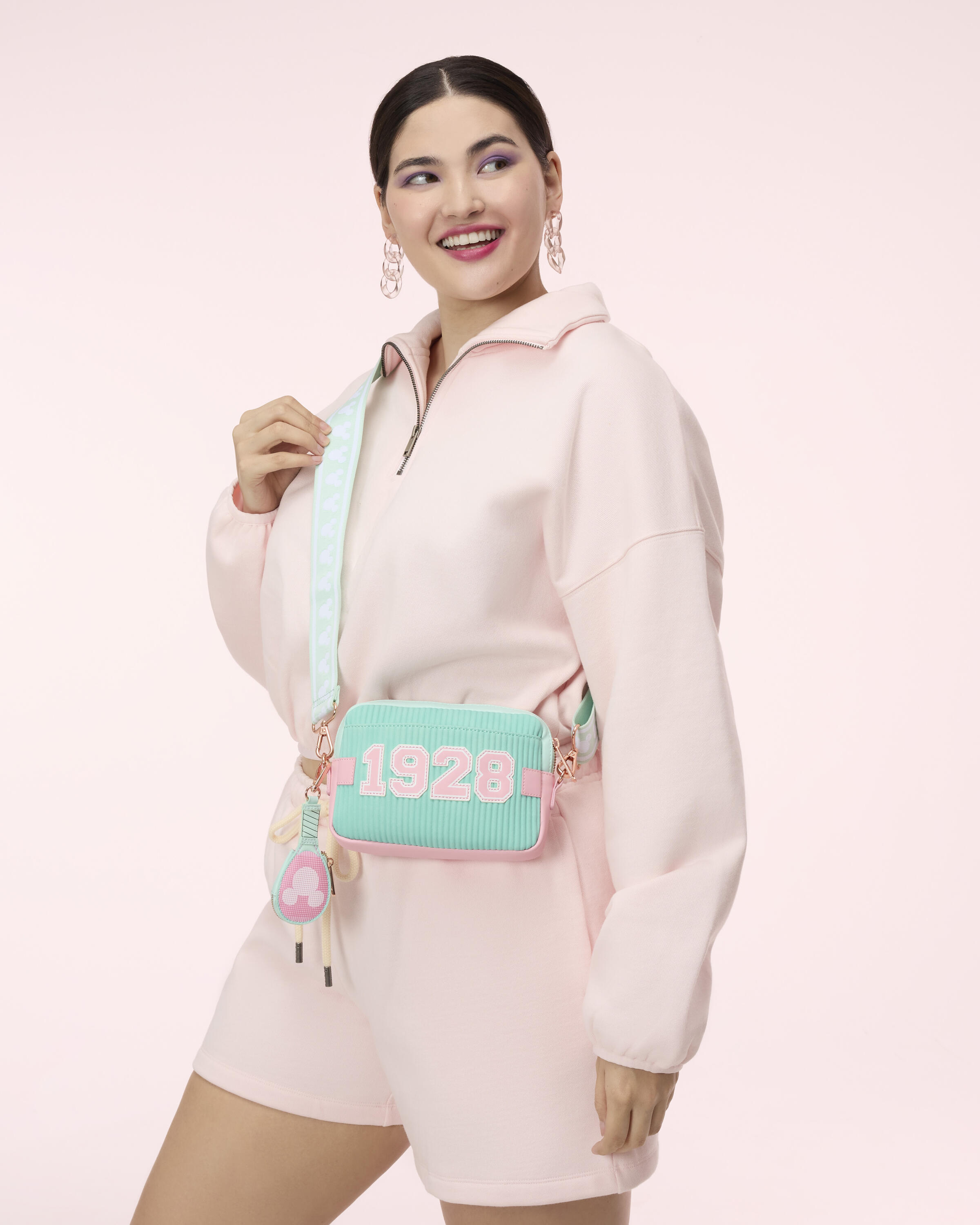 Diese Umhängetasche vereint Disney-Stil mit Tennis- mode. Auf der Vorderseite befindet sich ein pinkfarbenes Rautenmuster mit einem dreidimensionalen Metallanhänger in Form von Mickey Mouse! Dreht man die Tasche um, entdeckt man eine pinkfarbene Applikation auf grünem Grund mit der Aufschrift „1928“. Am Schulterriemen ist ein Münzbeutel in Form eines Tennisschlägers befestigt! Mit dieser Tasche gewinnst du jeden Style-Wettbewerb!