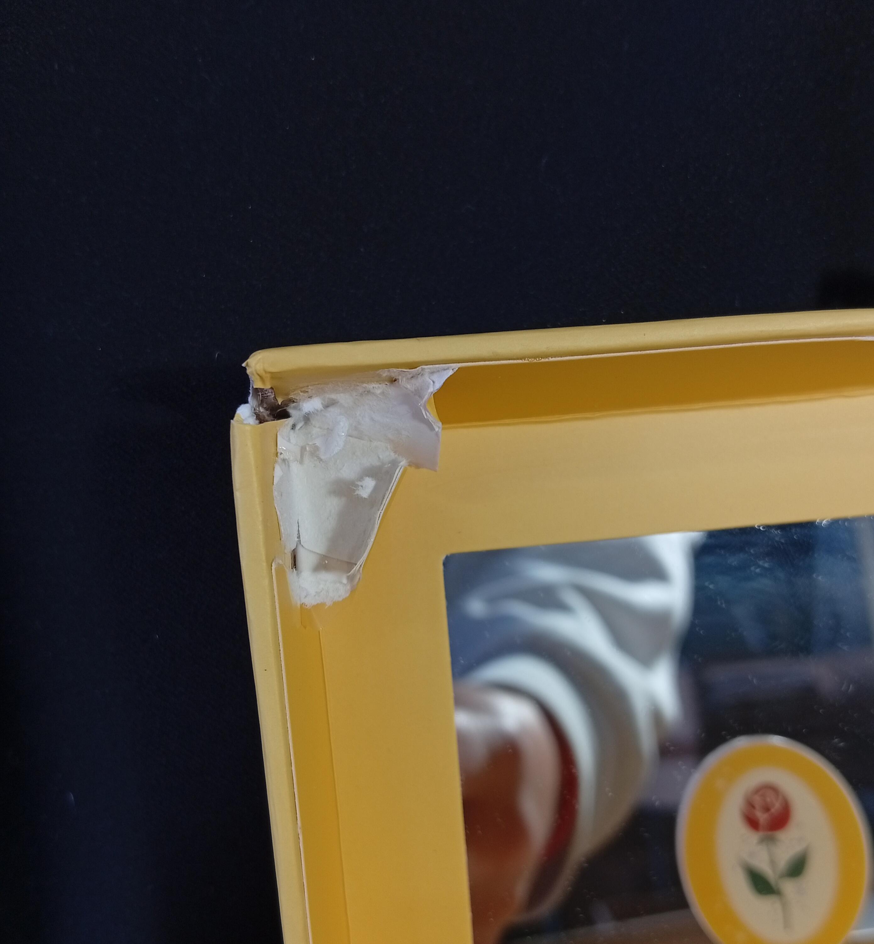 - Die obere linke Ecke ist eingerissen.