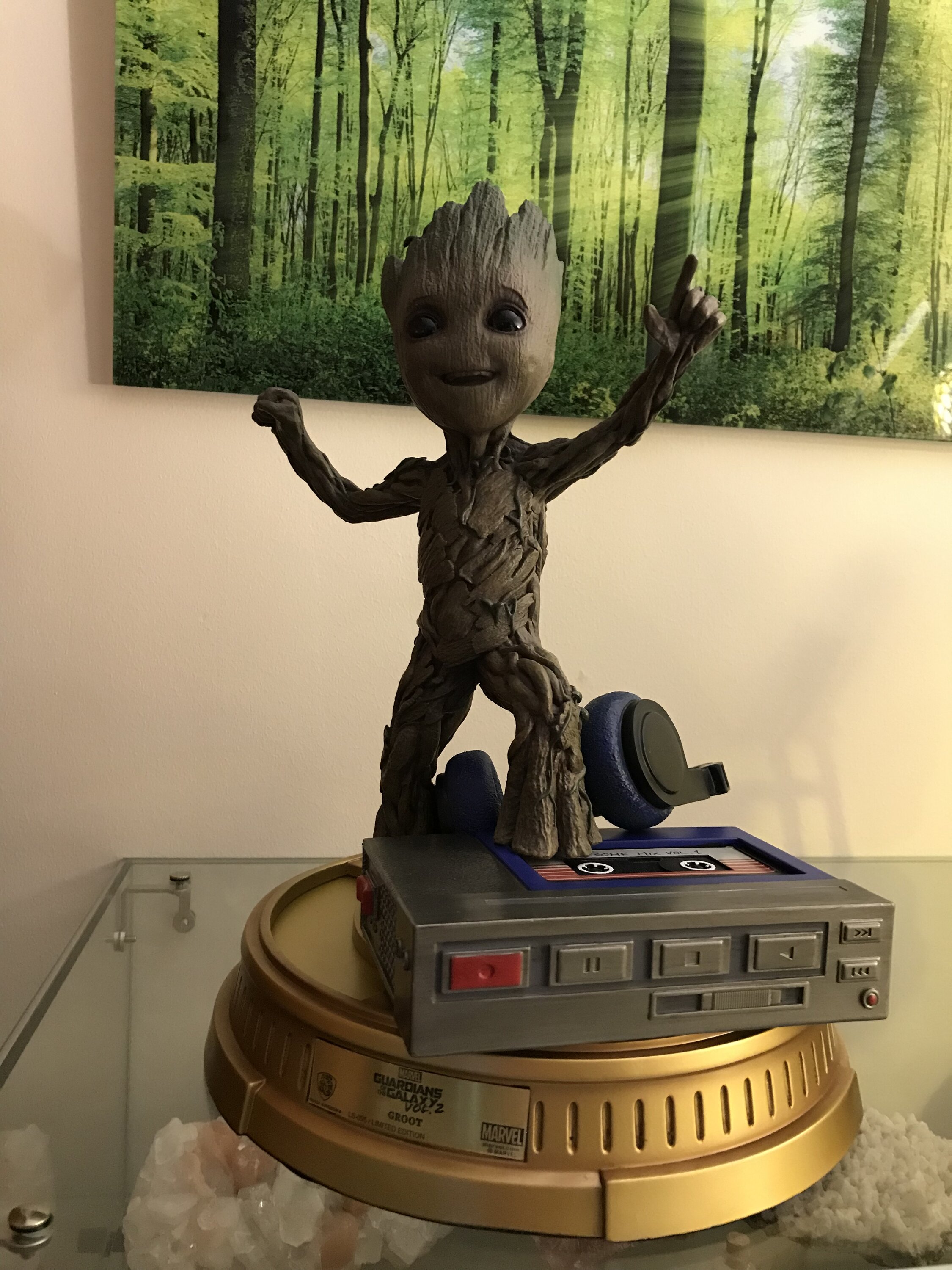 Dank der besten Bildhauer- und Maltechniken können Sammler jedes noch so kleine Detail in Originalgröße bewundern. Neben den Texturen von Groots Zweigen und dem Kassettenrekorder der alten Schule wurde besonderes Augenmerk auf Groots bezauberndes, ausdrucksstarkes Gesicht und seine dynamische Tänzerpose gelegt. Dies spiegelt seine lebhafte „Saturday Night Fever“-Attitüde und sein ansteckendes Lächeln wider. Vergessen Sie nicht, die Kopfhörer zu seinen Füßen zu bewundern, die bereit sind, die Lieder nacheinander abzuspielen!