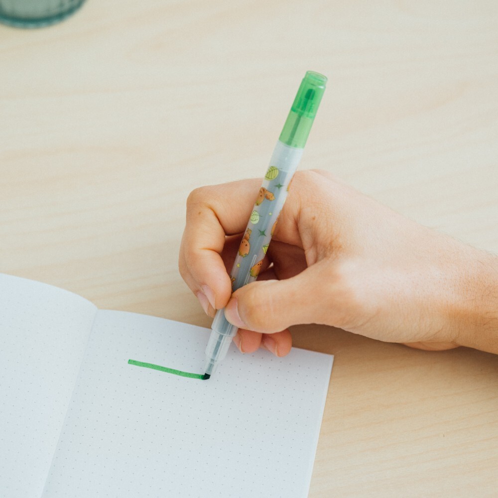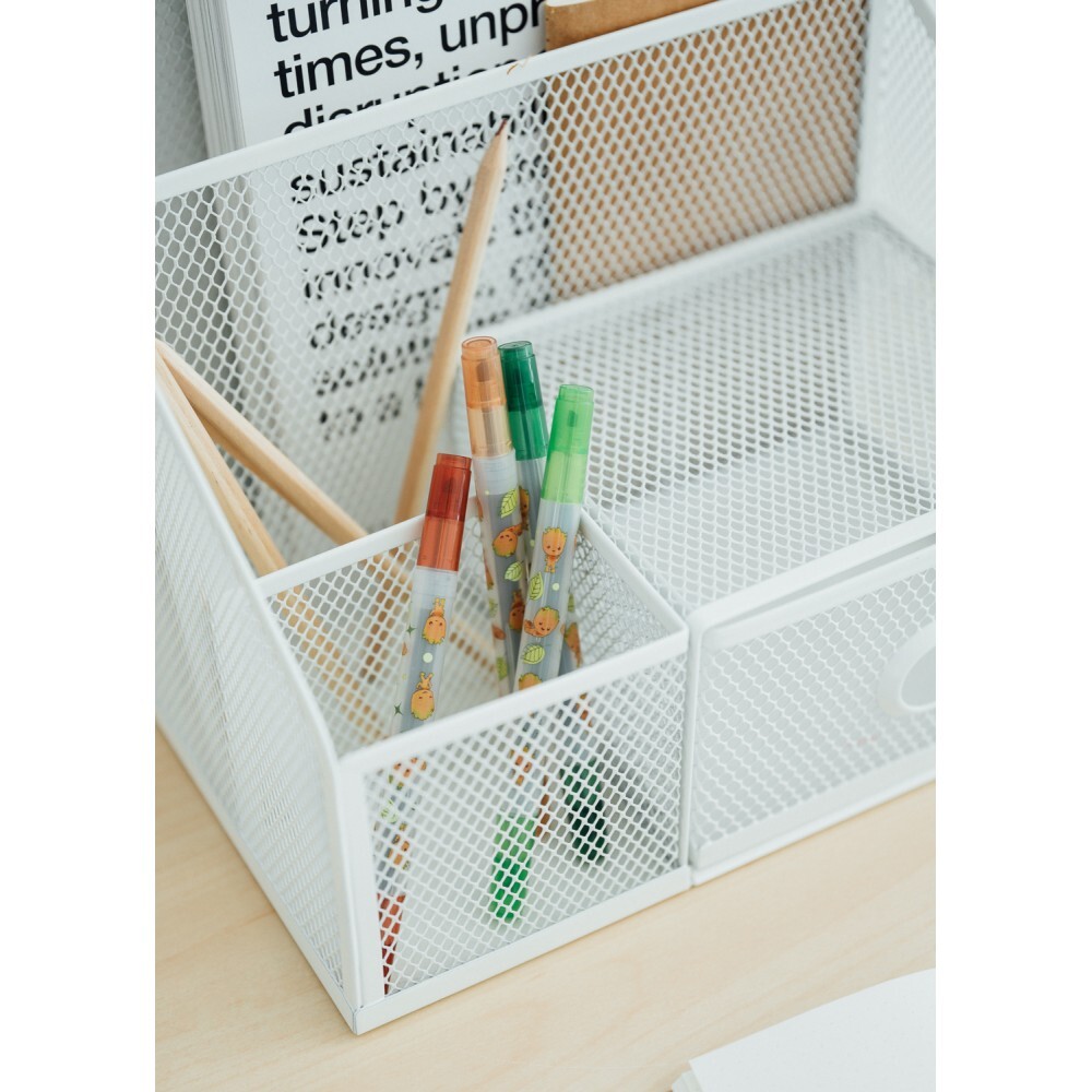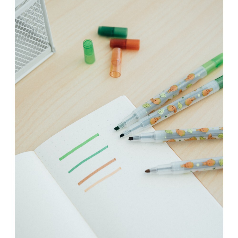 Das Set enthält vier Textmarker mit zwei unterschiedlich großen Spitzen. Ein PVC-Etui ist ebenfalls enthalten.