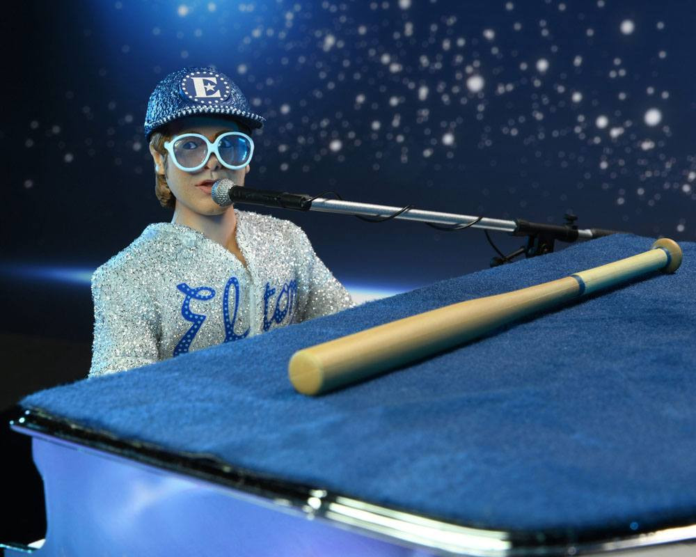 Figurine articulée taille env. 20 cm avec accessoires, dont le piano d'Elton, et vêtements tissu détaillés, en emballage boîte-fenêtre.