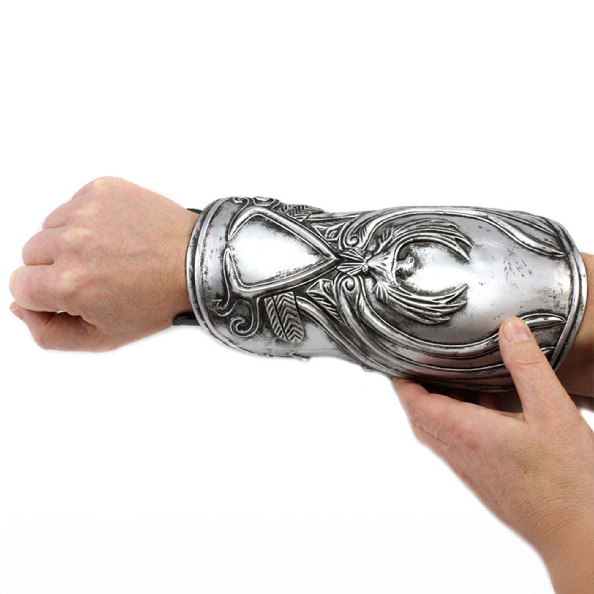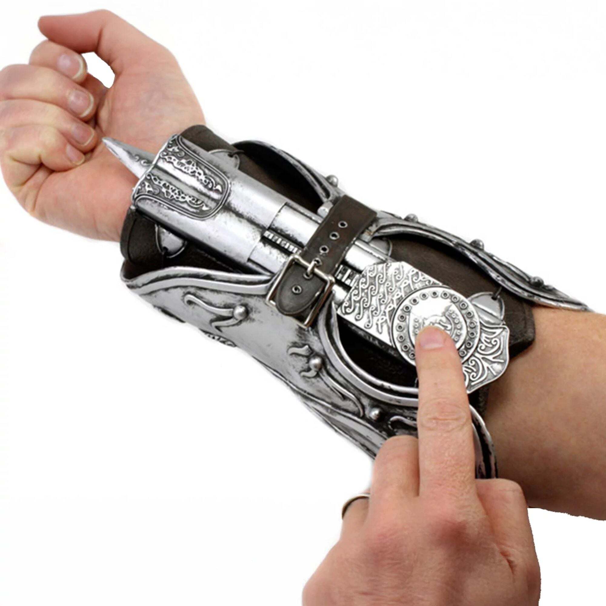 Diese Replik des Assassin's Creed-Handschuhs ist so realistisch wie nur möglich. Als Teil von Ezio Auditores Kleidung bildet sie den Handschuh aus der Assassin's Creed-Reihe perfekt nach. Neben der Schönheit der Armbinde selbst verfügt sie über eine Federmechanik und eine gummiartige Klinge. Ezios Handschuh besteht aus zwei Teilen: der äußeren Unterarmschiene und dem inneren Handgelenkschutz (wo sich die Federmechanik befindet). Er ist in Einheitsgröße erhältlich und verfügt über verstellbare Riemen für fast jeden Unterarm: Innerer Handgelenkschutz – Handgelenkumfang: 11,4 cm, Unterarmumfang: 12,7 cm, äußere Unterarmschiene – 27,6 cm Höhe: 18 cm