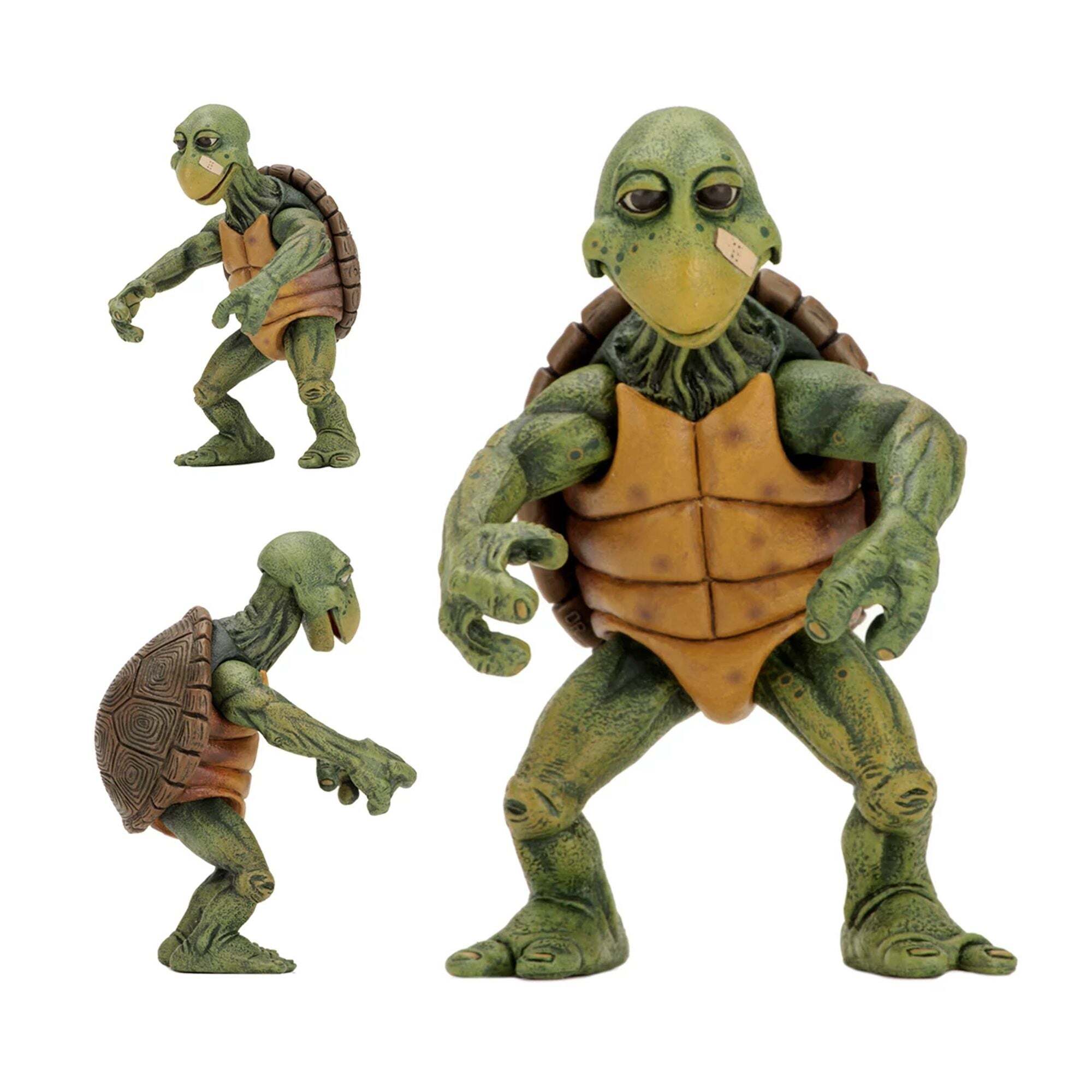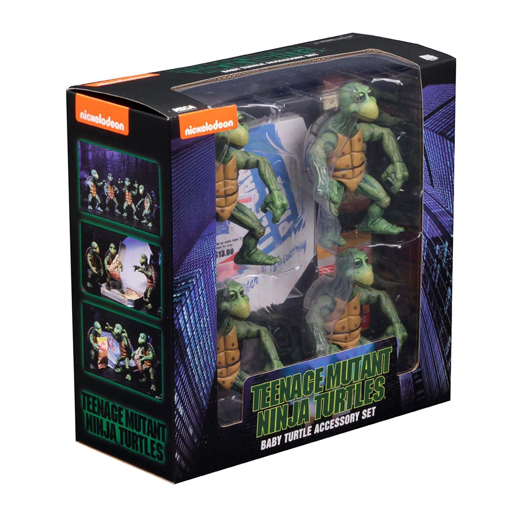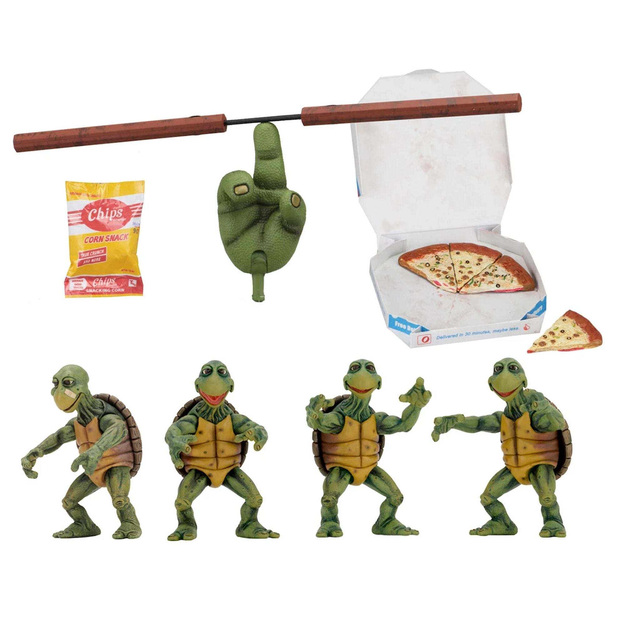 Nachdem sie durch einen Pool radioaktiver Abfälle gewatet sind, werden diese Schildkröten zu New Yorks berühmtestem Bürgerwehrquartett! Die noch winzigen Baby Turtles sind bereit, mit ihrem Meister Splinter zu trainieren. Diese detaillierten und beweglichen Figuren sind ungefähr 10 cm groß und haben eine perfekte Skalierung für NECA-Figuren im Maßstab 1/4 (Michelangelo, Donatello usw.). Das Set enthält: – 4 Baby Turtles – 1 Pizzakarton – 4 Pizzastücke – 1 Tüte Mais-Chips. Exklusiver Bonus: ein Paar Nunchakus und eine alternative Drehhand für die NECA-Michelangelo-Figur im Maßstab 1/4 (separat erhältlich). Alles in einer Sammlerverpackung mit Schaufenster. Höhe: 10 cm
