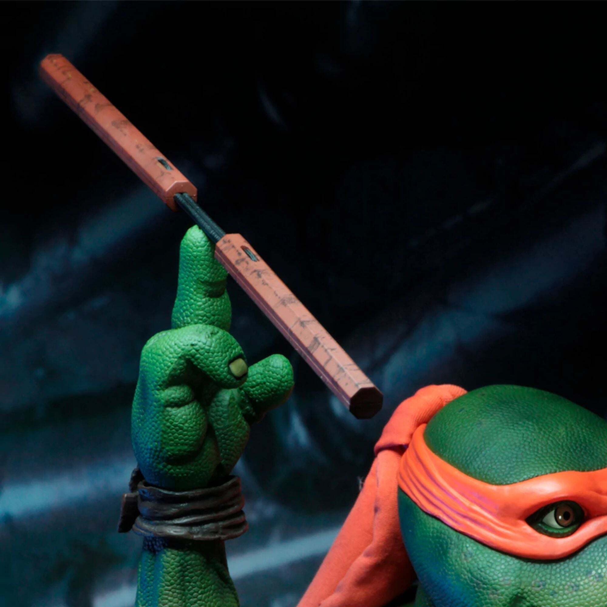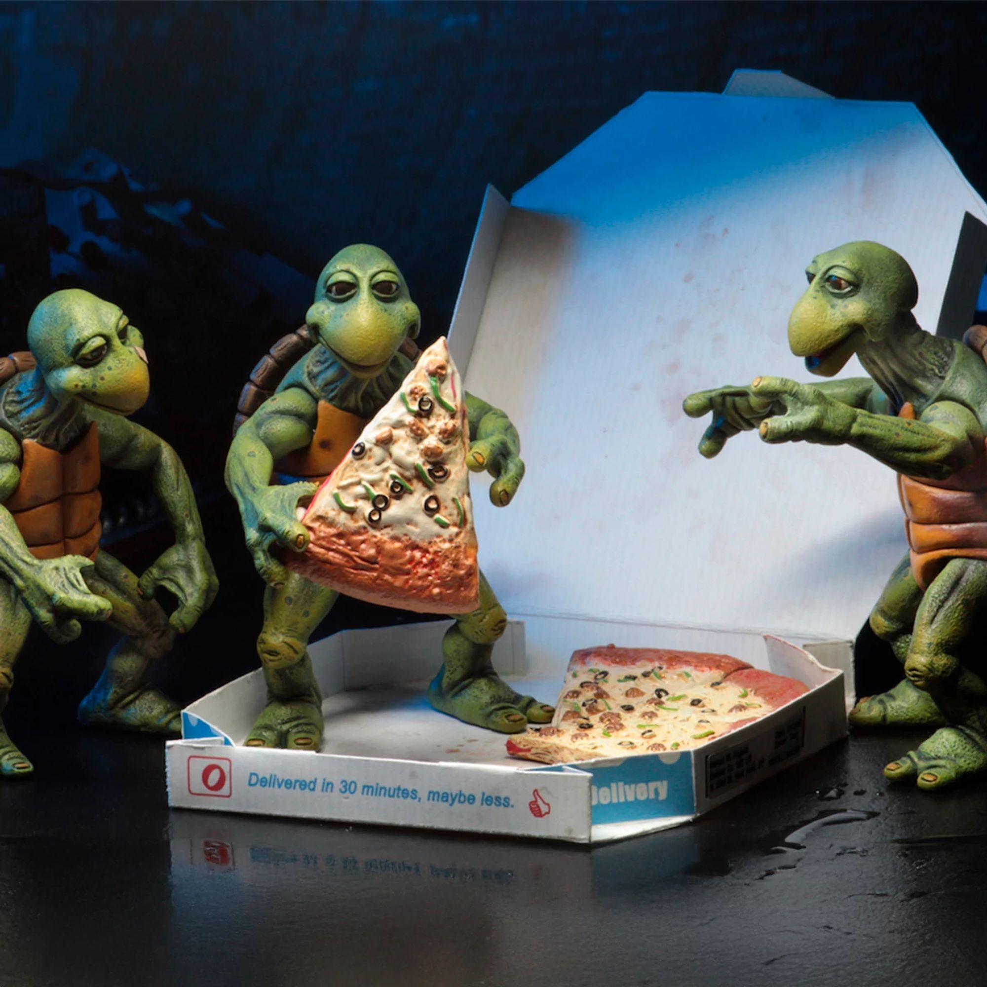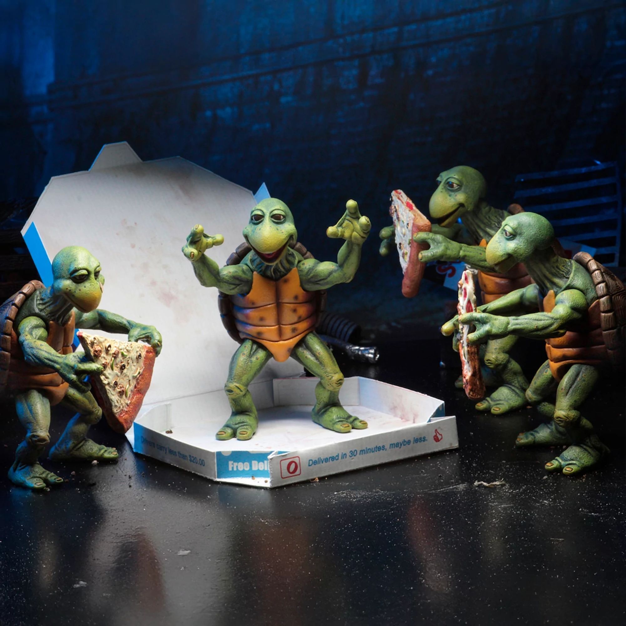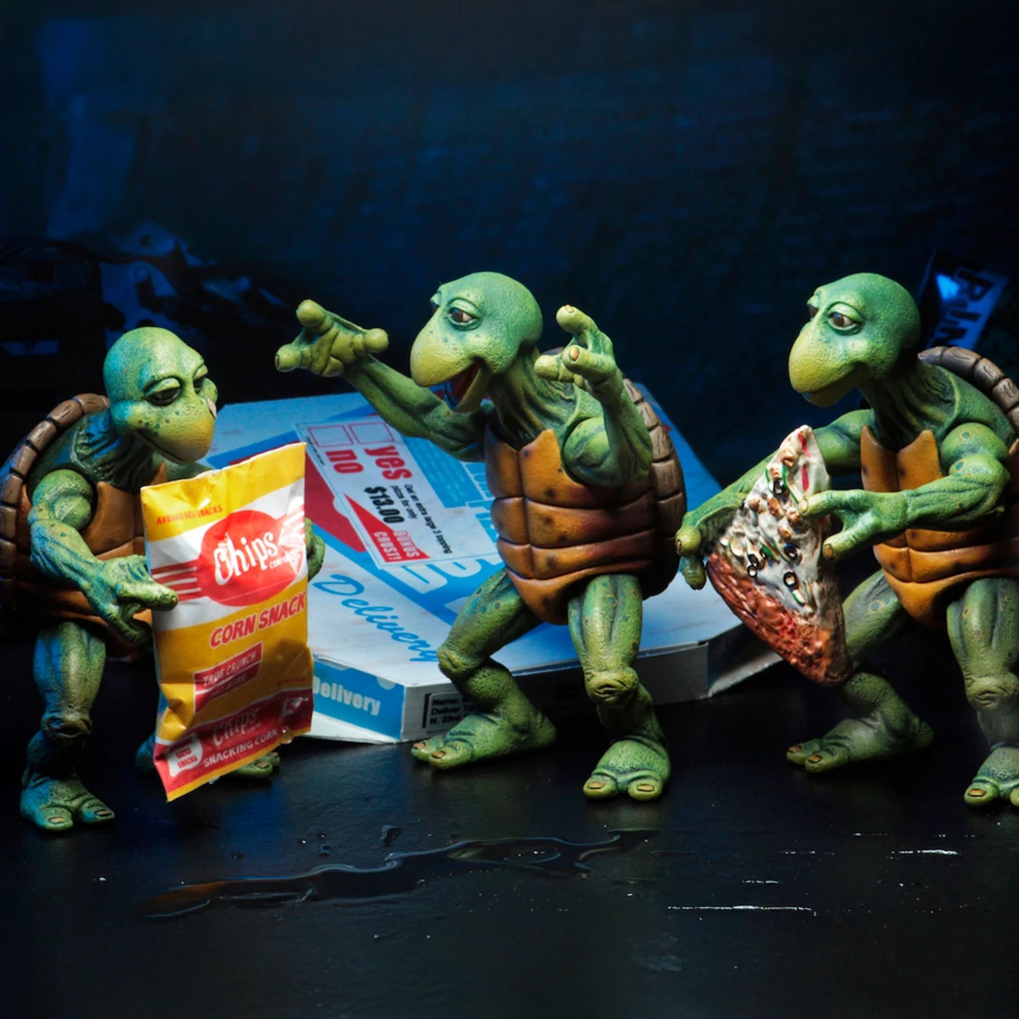 Nachdem sie durch einen Pool radioaktiver Abfälle gewatet sind, werden diese Schildkröten zu New Yorks berühmtestem Bürgerwehrquartett! Die noch winzigen Baby Turtles sind bereit, mit ihrem Meister Splinter zu trainieren. Diese detaillierten und beweglichen Figuren sind ungefähr 10 cm groß und haben eine perfekte Skalierung für NECA-Figuren im Maßstab 1/4 (Michelangelo, Donatello usw.). Das Set enthält: – 4 Baby Turtles – 1 Pizzakarton – 4 Pizzastücke – 1 Tüte Mais-Chips. Exklusiver Bonus: ein Paar Nunchakus und eine alternative Drehhand für die NECA-Michelangelo-Figur im Maßstab 1/4 (separat erhältlich). Alles in einer Sammlerverpackung mit Schaufenster. Höhe: 10 cm