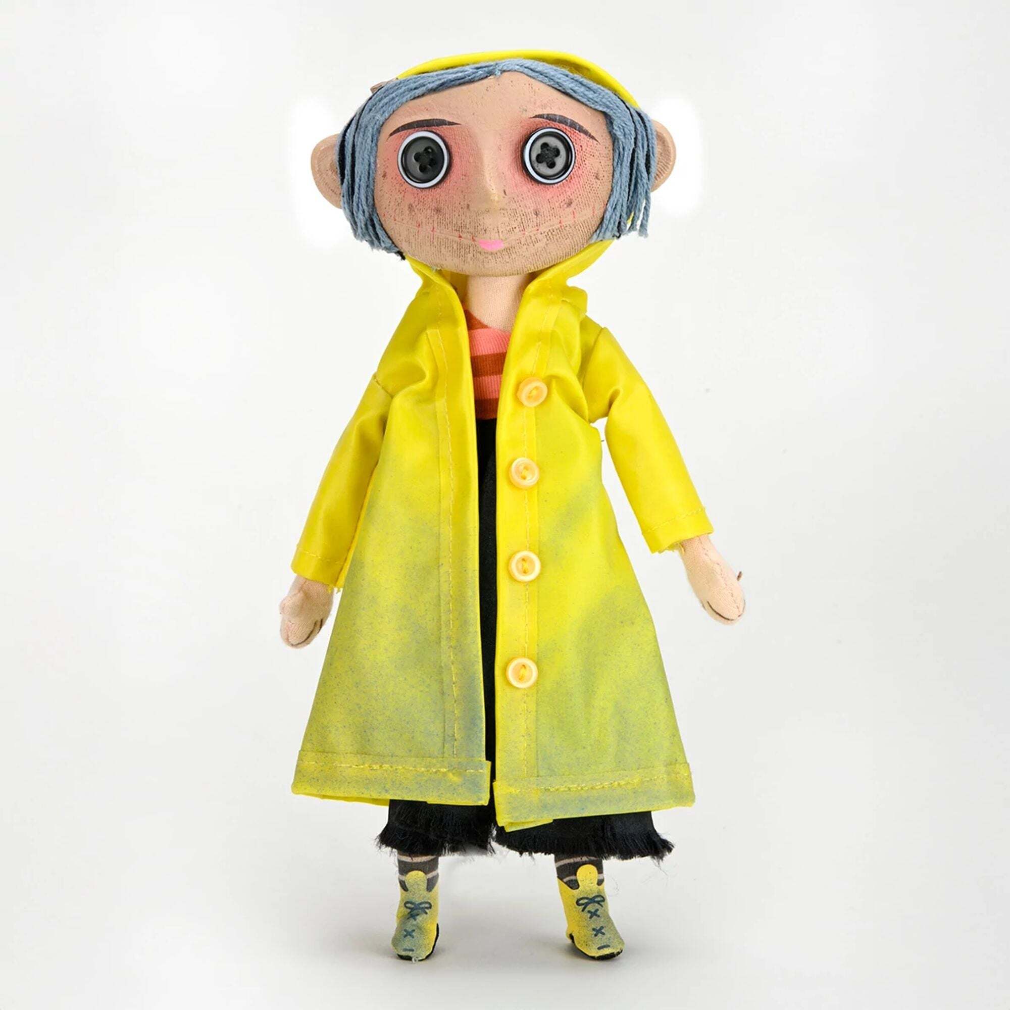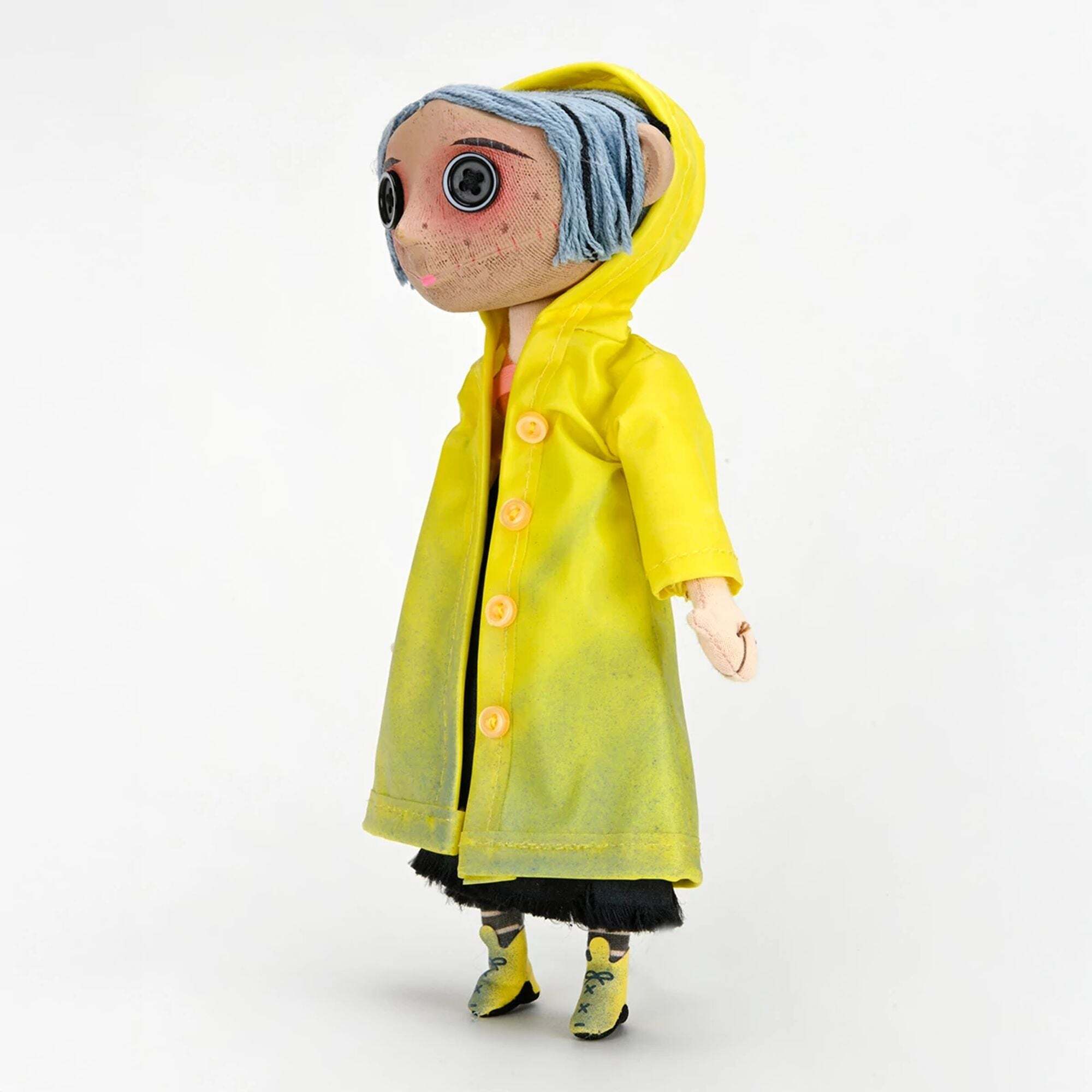 Tauchen Sie ein in die seltsame und faszinierende Welt von Coraline! Diese originalgetreue Nachbildung der Coraline-Puppe ist direkt von Henry Selicks Stop-Motion-Animationsfilm inspiriert, der wiederum auf Neil Gaimans Kultroman basiert. Sie gibt jedes auf der Leinwand zu sehende Detail sorgfältig wieder: Wollhaar, Knopfaugen und einen abnehmbaren gelben Regenmantel. Dank des eingebauten flexiblen Gestells können Sie die Arme, Beine und sogar die Jacke biegen und so diese geheimnisvolle Puppe zum Leben erwecken. Mit einer Größe von etwa 23 cm ist sie ein ideales Sammlerstück für Fans jeden Alters! Höhe: 25 cm