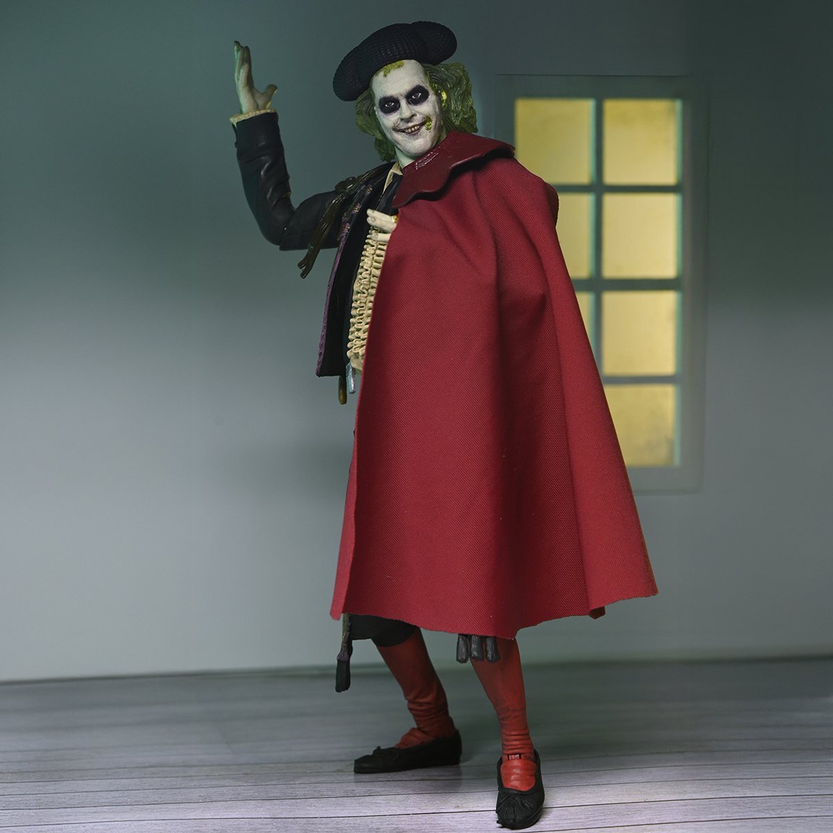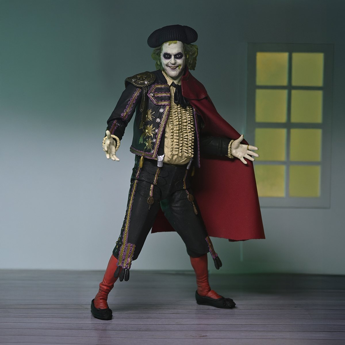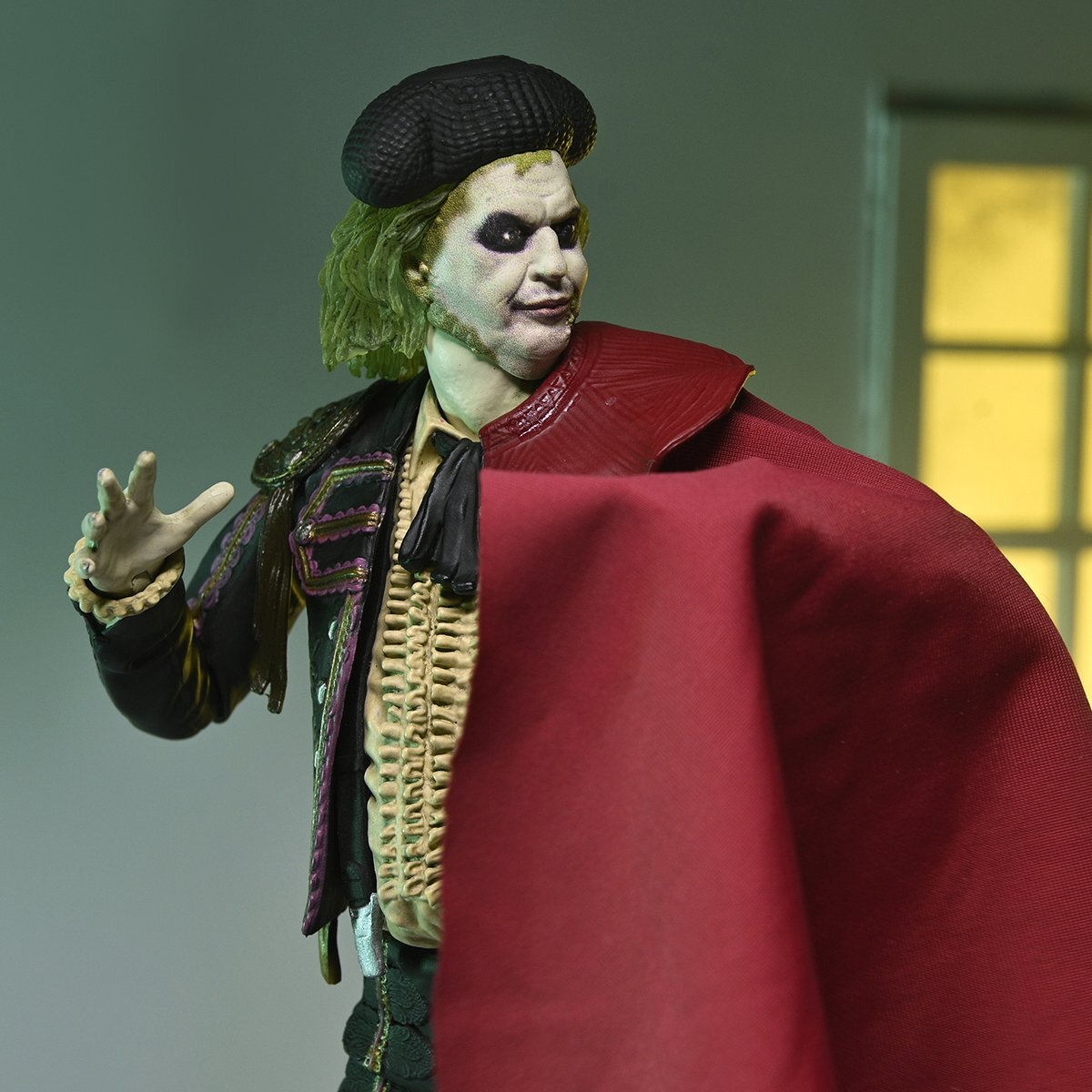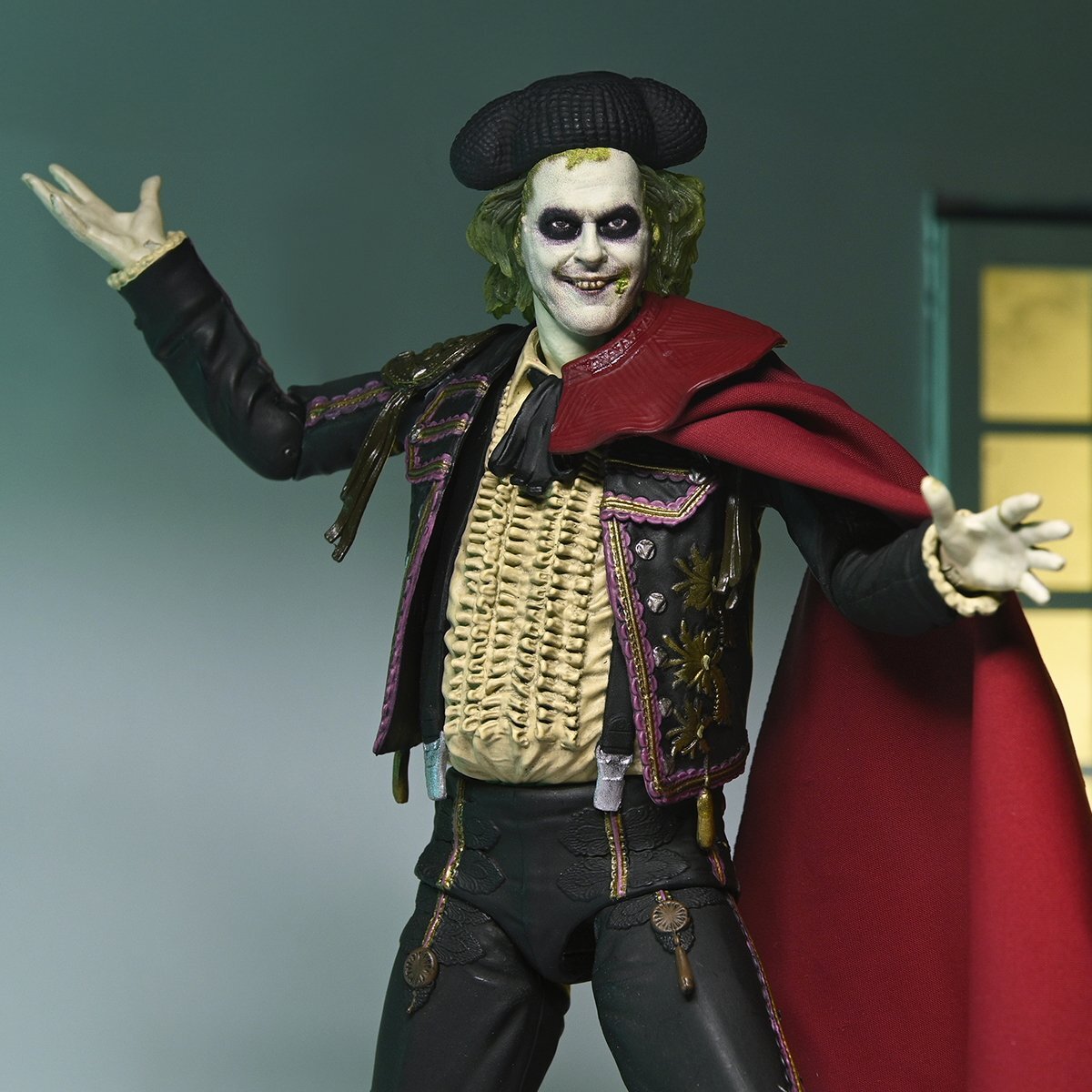 Der berühmteste Geist ist zurück! In Tim Burtons Fortsetzung „Beetlejuice“ aus dem Jahr 2024 kehrt der berüchtigte Bio-Exorzist zurück, um Lydia zur Heirat zu zwingen und endlich dem Jenseits zu entkommen. Doch während der Hochzeit wird sein finsterer Plan vereitelt, als Lydias Tochter Astrid einen Sandwurm in die Welt der Lebenden beschwört, um ihn aufzuhalten. Blitzschnell verwandelt sich Beetlejuice in einen Matador, um den monströsen Sandwurm abzulenken, sodass dieser stattdessen seine Ex-Frau verschlingt. NECA erweckt das Chaos dieser legendären Szene zum Leben! Höhe: 18 cm