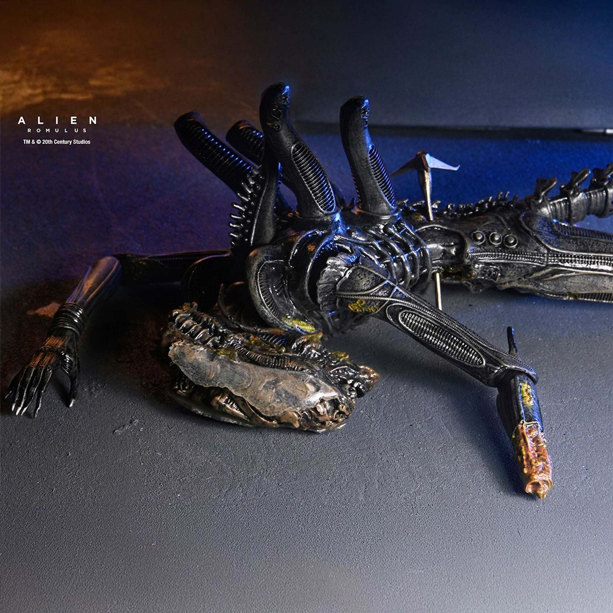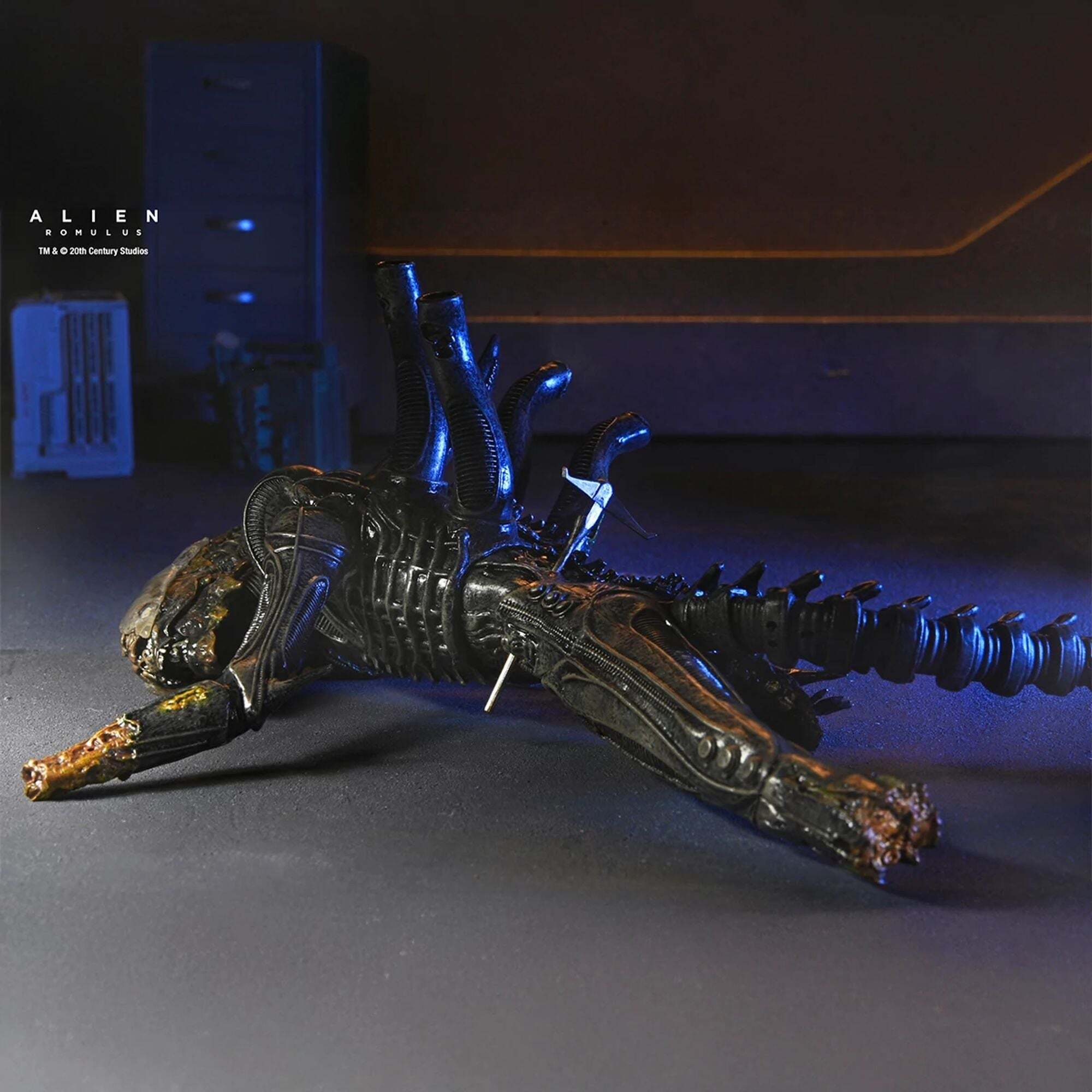 Eine Sammleredition, inspiriert von Fede Alvarez' Blockbuster-Film aus dem Jahr 2024. Direkt aus dem furchterregenden neuen Kapitel der Alien-Saga, Alien: Romulus, kehrt der legendäre Xenomorph in einer spektakulären Sammleredition zurück! Nach einer blutigen Konfrontation mit den Sicherheitskräften von Weyland-Yutani wird die außerirdische Kreatur schwebend im Labor des Schiffs gefunden… Ihr ätzendes Blut, das den Boden verätzt, ermöglichte Wissenschaftlern den direkten Zugriff auf die DNA der perfekten Tötungsmaschine. Diese deluxe Figur von NECA bildet diese ikonische Szene nach: den verstümmelten Xenomorph, der an beweglichen Drähten hängt und so einen realistischen Schwebeeffekt erzeugt. Ein Wanddekorationselement, das die säurebefleckte Labordecke darstellt, ist ebenfalls enthalten – befestigen Sie es an Wand oder Decke für eine dynamische Präsentation. Zu den ultrarealistischen Details gehören ein beweglicher Kiefer, ein verschiebbarer Innenkiefer und ein drahtverstärkter Schwanz für vielfältige Posen. Präsentiert wird alles in einer transparenten Sammlerbox – perfekt, um dieses Prunkstück Ihrer Alien: Romulus-Sammlung in Szene zu setzen. Höhe: 18 cm