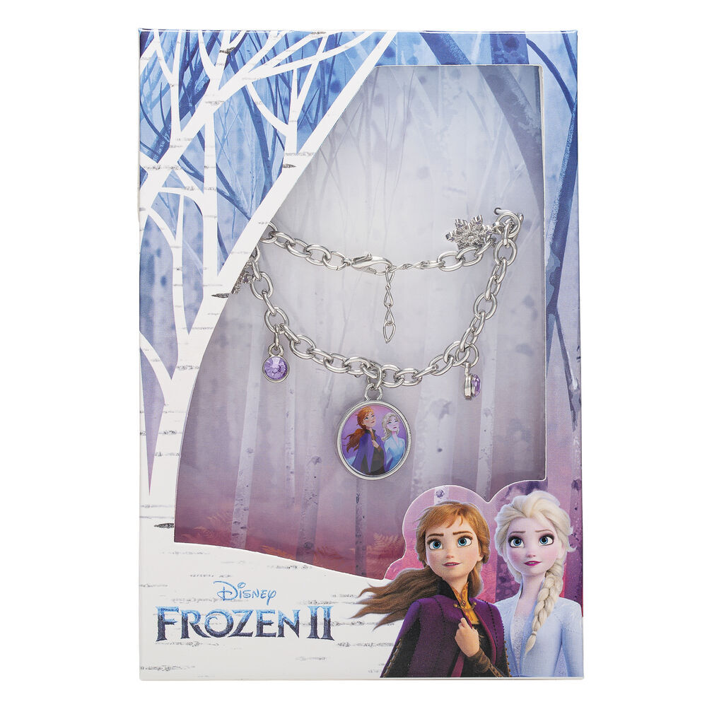 Die Silberkette wird durch einen Emaille-Anhänger von Anna und Elsa und silberne Schneeflocken-Anhänger sowie einen lila Stein-Charm ergänzt.