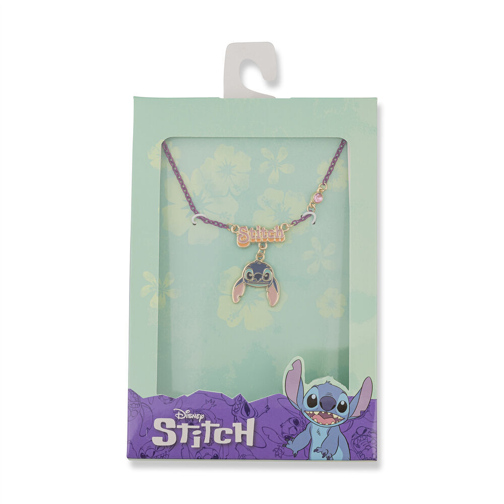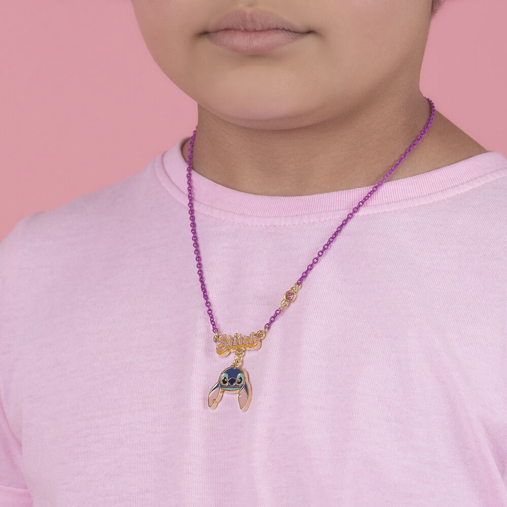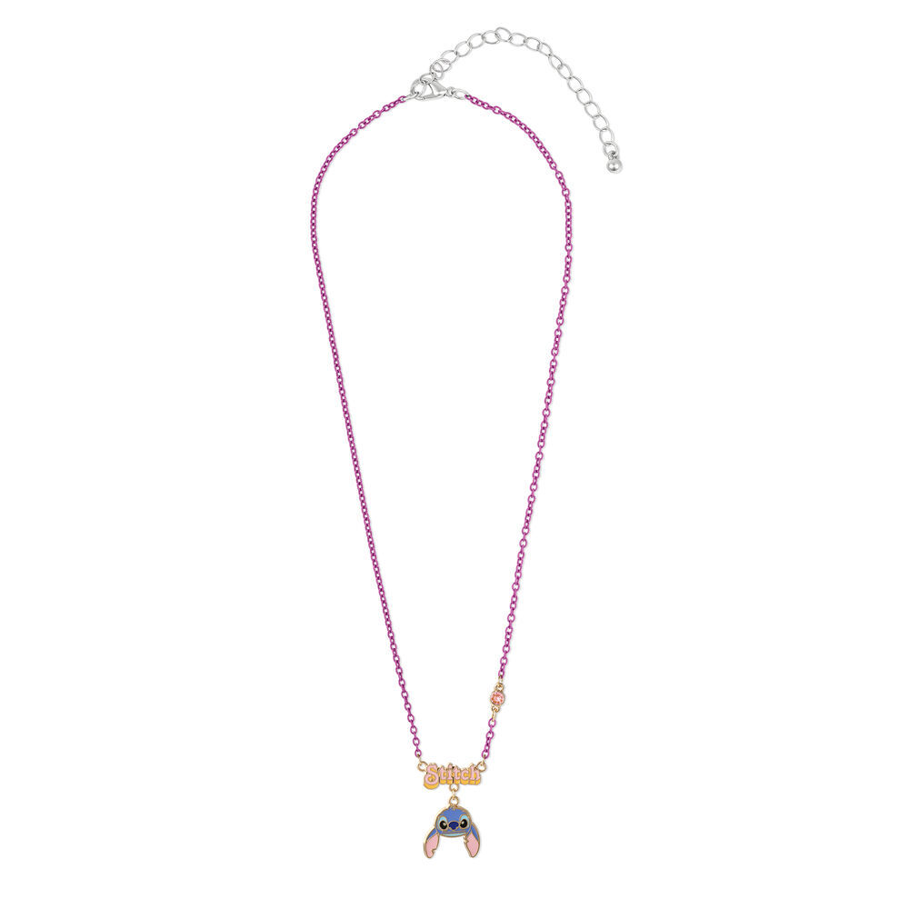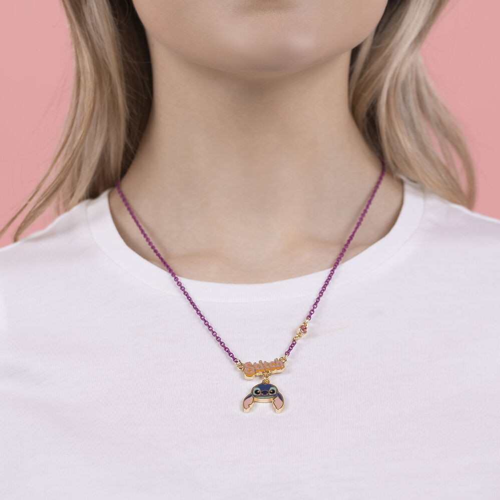 Mit Stitch als tropfenförmigem Anhänger und einer violetten Kette.