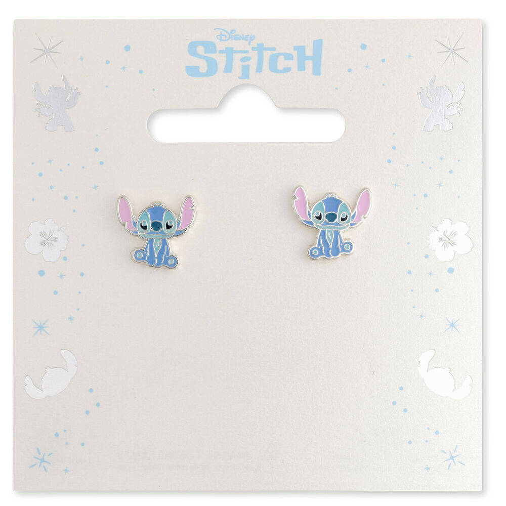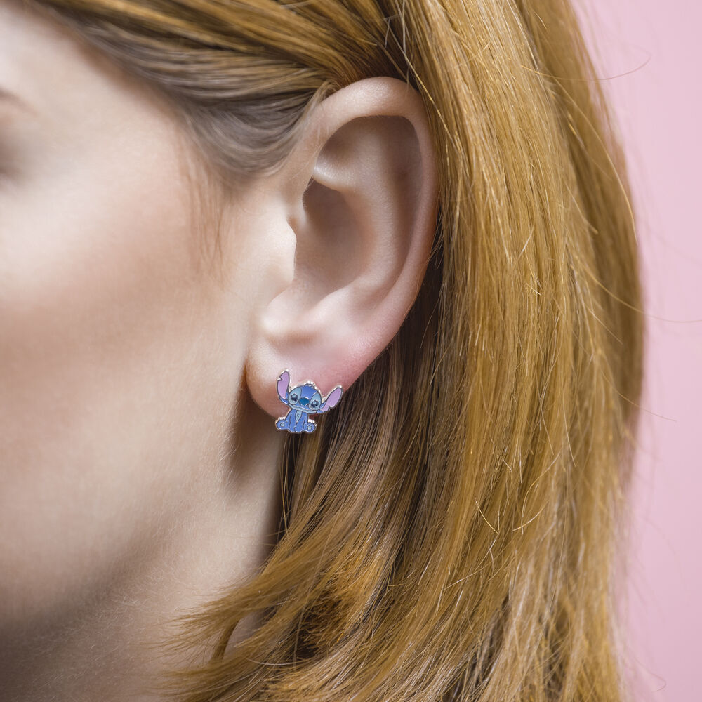 Diese farbenfrohen Ohrringe aus silberner Emaille zeigen Stitch selbst.