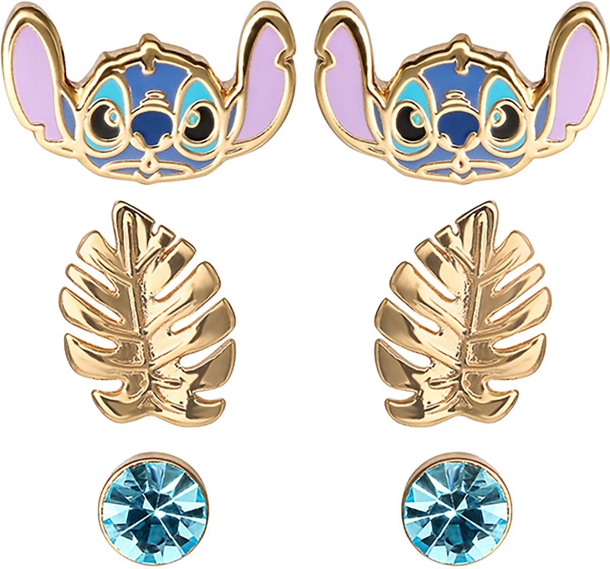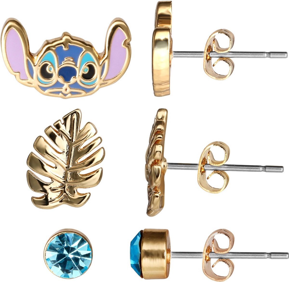 Das Ohrringpaket enthält Stitch -Ohrringe mit farbiger Emaillefüllung, Ohrringe mit Blattgold und Ohrringe mit blauen Steinen.
