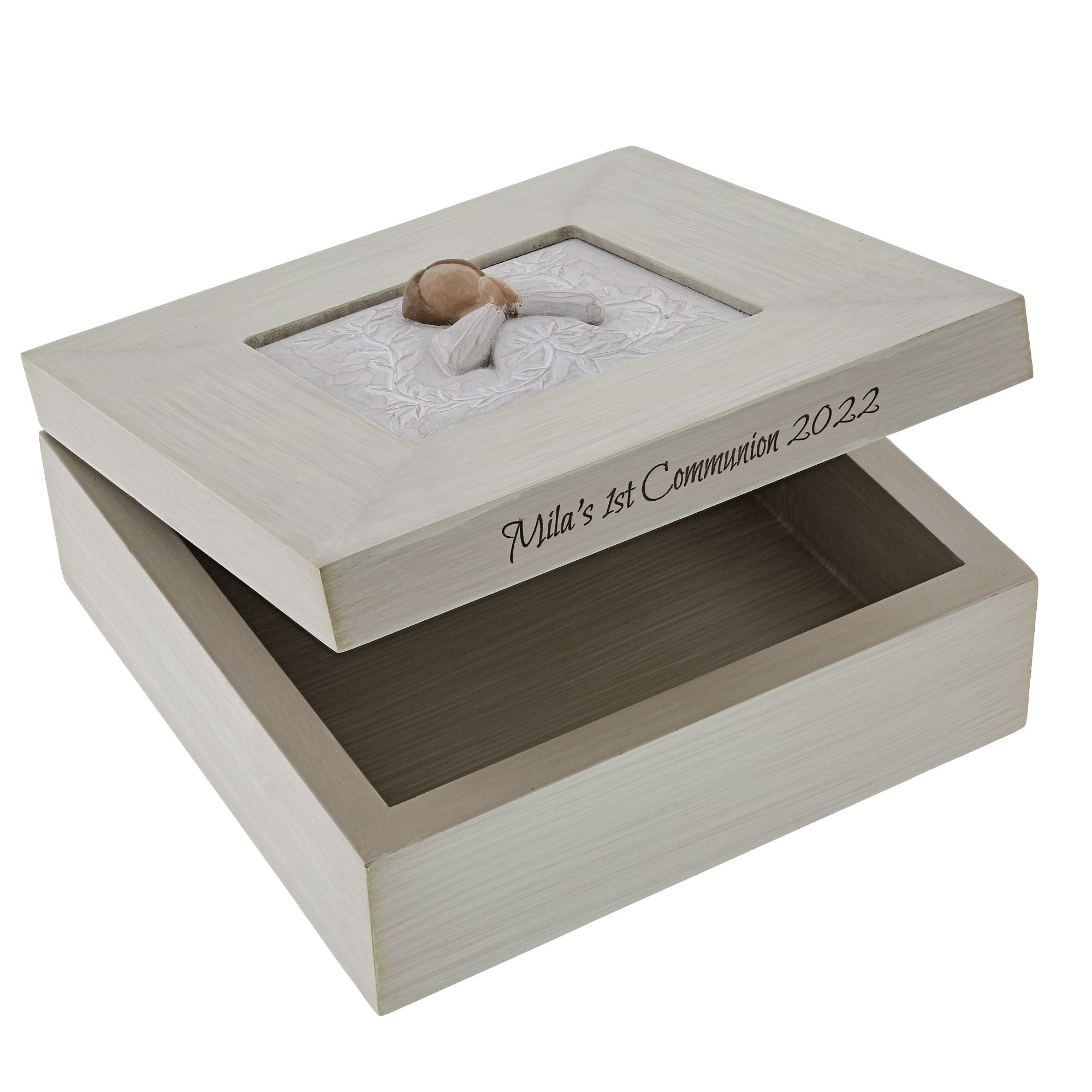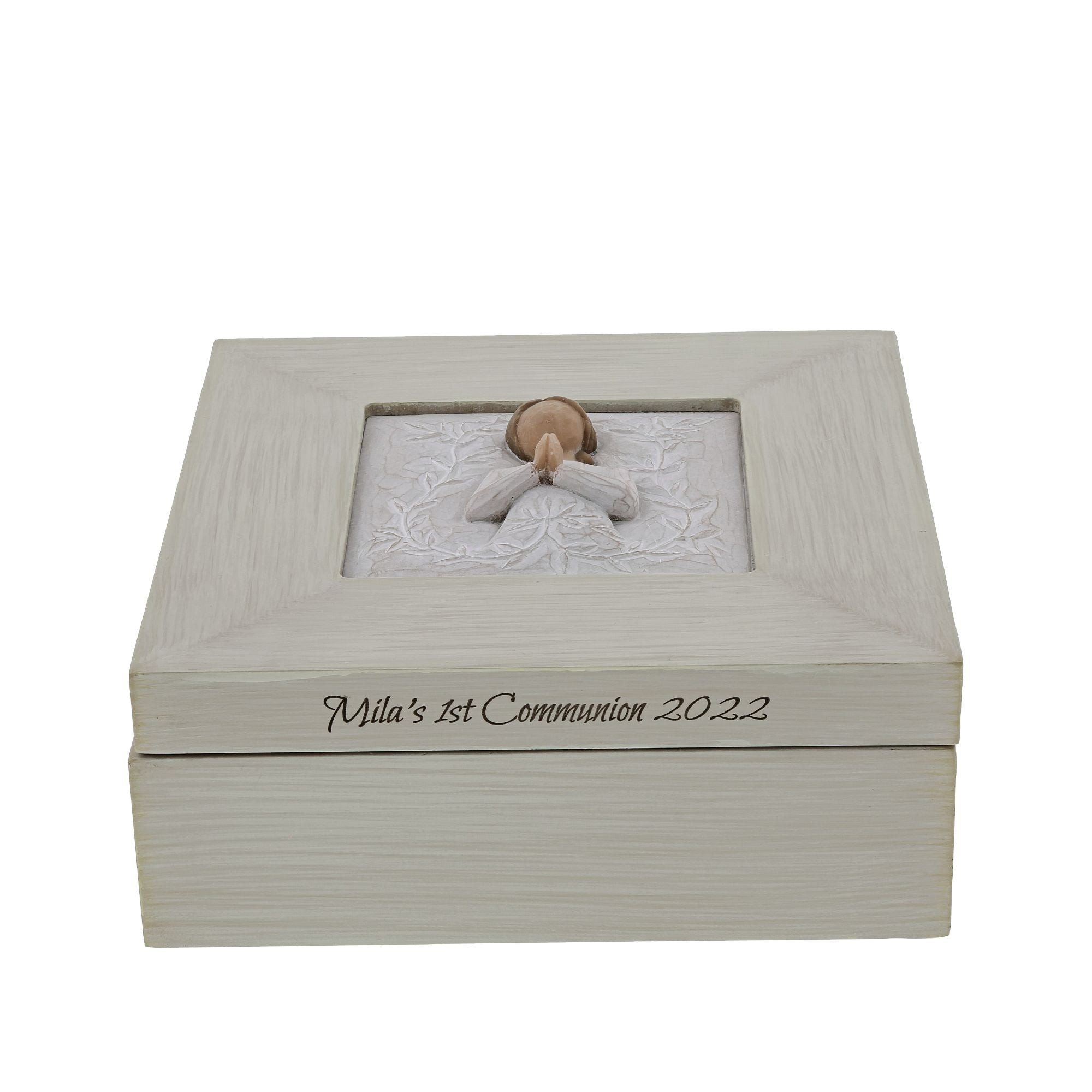 Eine fein gearbeitete Schachtel aus Harz und Holz mit Klappdeckel, ideal zur Aufbewahrung wertvoller Gegenstände mit emotionalem Wert. Ein Geschenk, das Trost und Hoffnung spendet. Zur Feier spiritueller Meilensteine wie Taufe, Erstkommunion und Firmung.